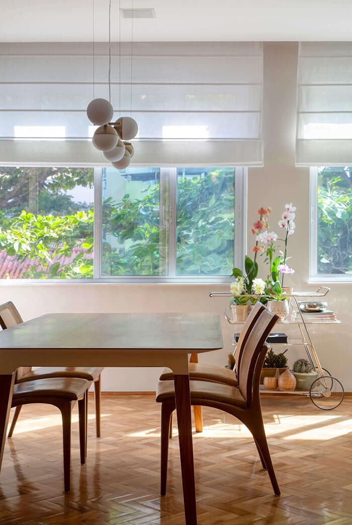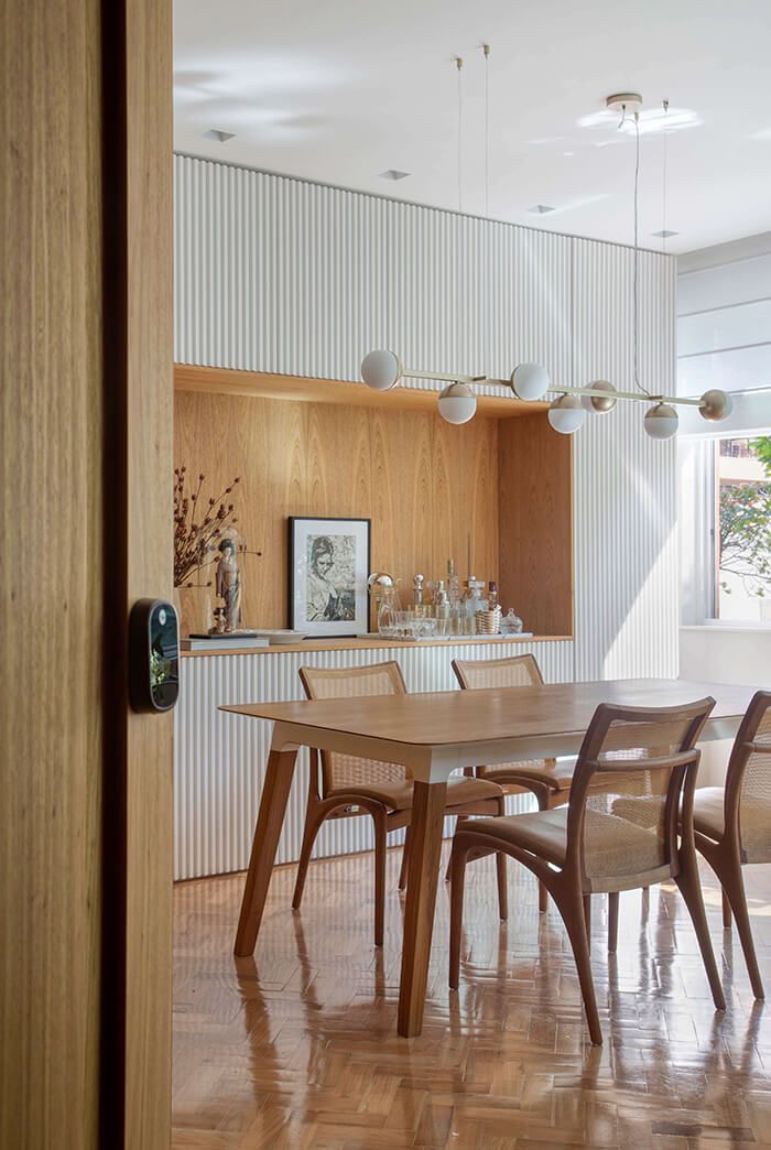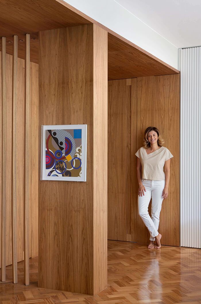 Vieram do apartamento anterior algumas peças especiais para a cliente, como o quadro colorido ao lado da estante da sala, os sofás, a mesa de centro, a mesa de jantar e as cadeiras, o carrinho de chá, entre outros móveis. Os armários em frente à mesa de jantar guardam as peças que a cliente herdou da mãe e da avó, a arquiteta os desenhou embutidos e executados em marcenaria, com acabamento em freijó e laca branca, para assumir inúmeras funções de apoio à sala de jantar: bar, louceiro, champanheira e adega.