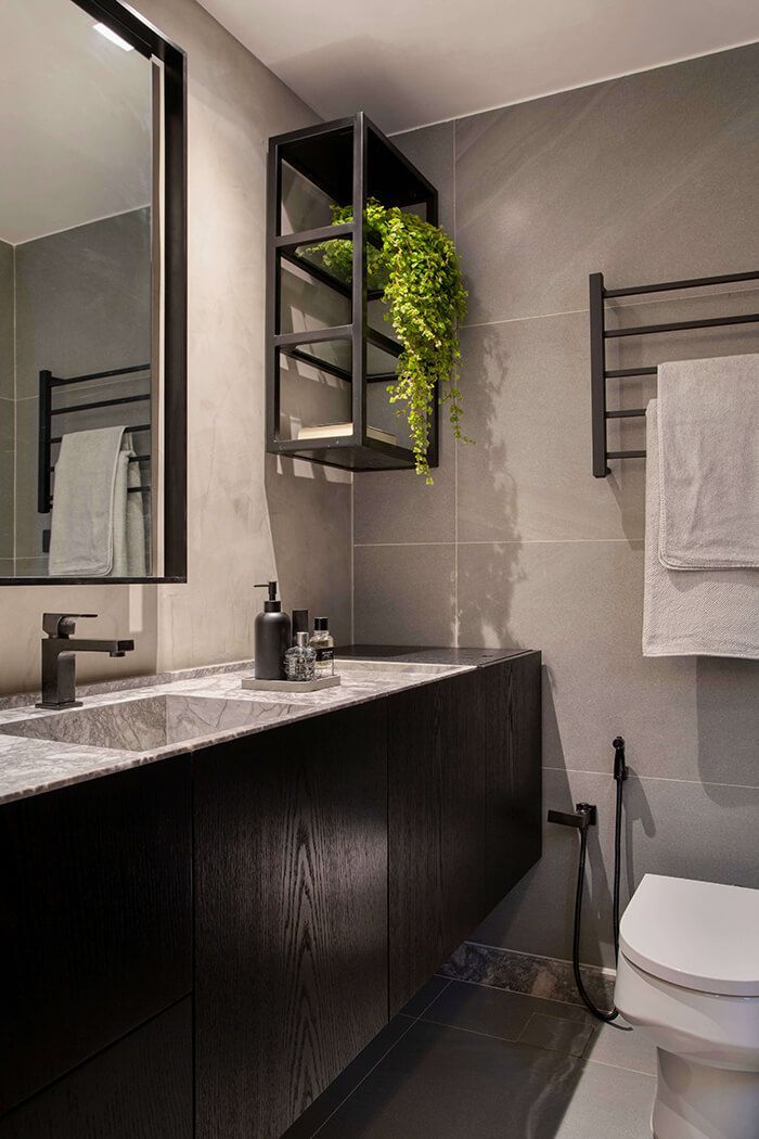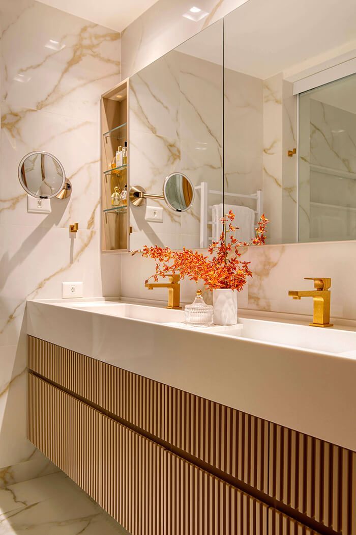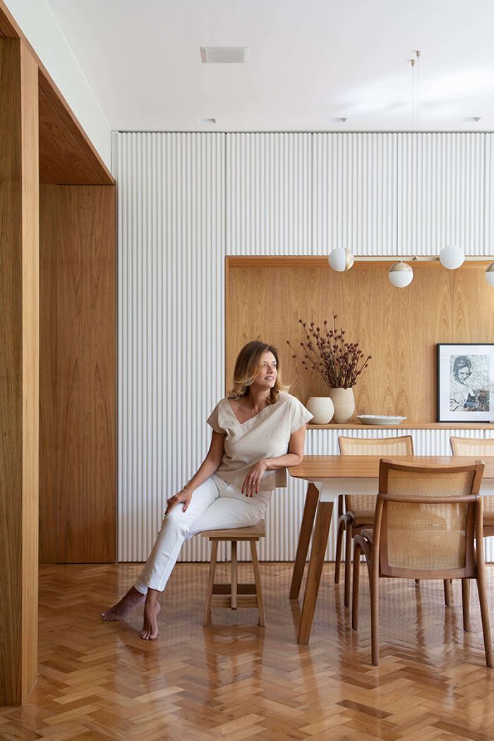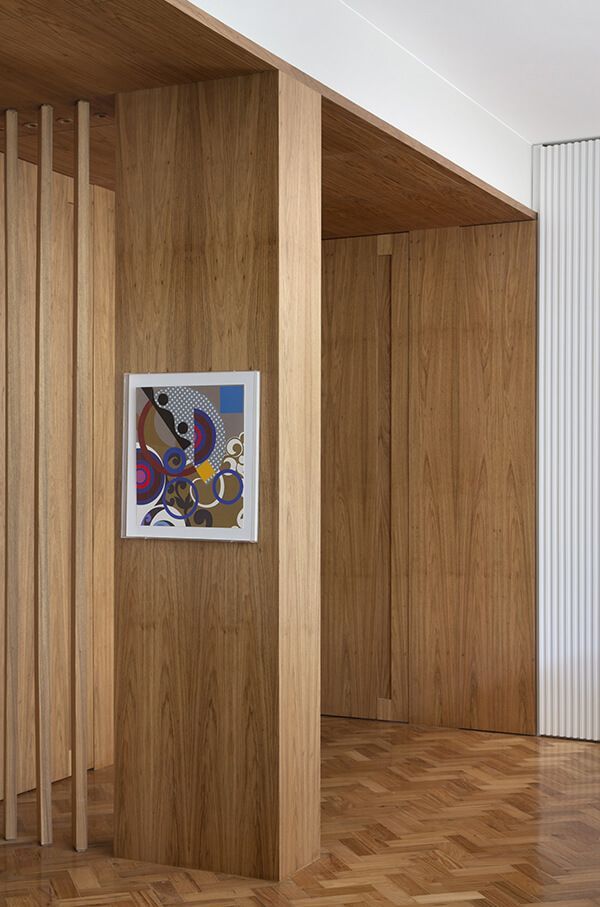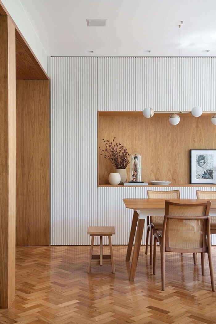 Originalmente, apartamento já tinha 3 quartos, mas nenhum deles era suíte, um banheiro social e um lavabo. A arquiteta fez banheiro em todos os quartos, eliminou o banheiro social, manteve o lavabo e aumentou a cozinha, diminuindo parte da área de serviço. Na decoração, a profissional escolheu uma base em cores neutras e claras com muita madeira freijó e laca branca, somente a cozinha tem tons mais fechados.