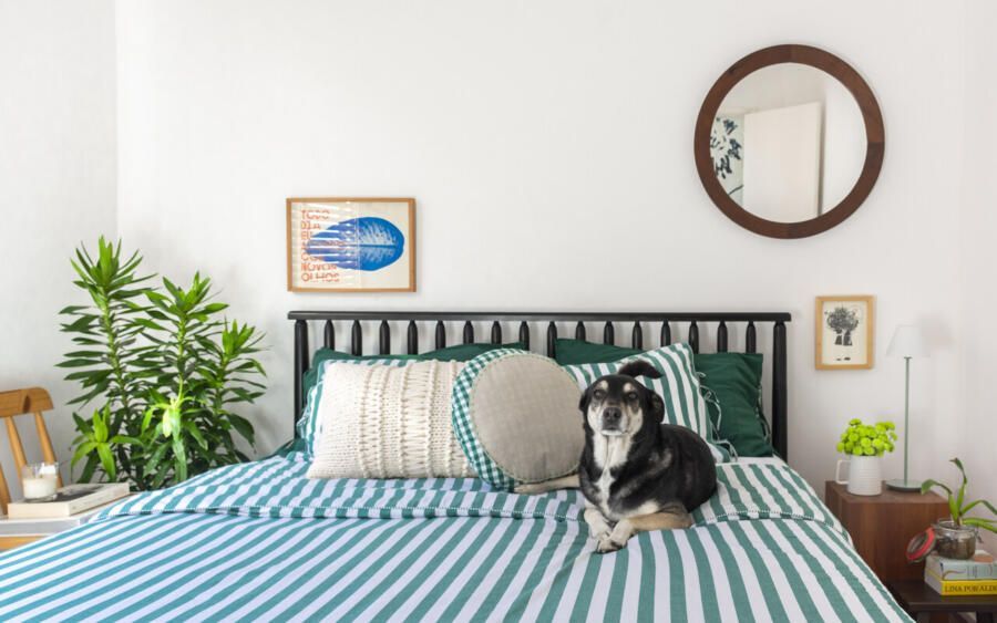 No quarto, uma pintura geométrica abraça a cabeceira, criando um enquadramento caloroso e contemporâneo. No banheiro, o teto verde quebra o esperado e reforça o olhar autoral do projeto. Até o revisteiro vermelho de Pedro Useche e o móbile dinamarquês suspenso no teto lembram que o design pode ser lúdico e expressivo, mesmo em espaços compactos.