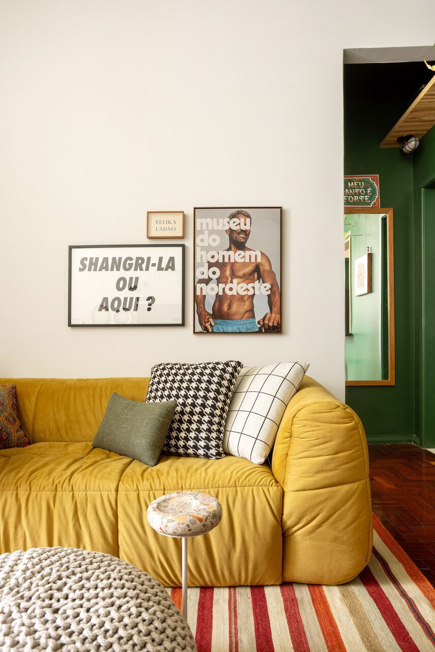 O verde, sua cor favorita, atua como fio condutor. Surge nas paredes, no teto do banheiro e até em pequenos detalhes da marcenaria, criando continuidade e profundidade. A madeira clara e o sofá amarelo aquecem o ambiente, injetando vida e descontração. Essa combinação dá ao apartamento um caráter solar, quase tropical, mas sem excessos, quase como uma tradução natural da personalidade de Raphael.