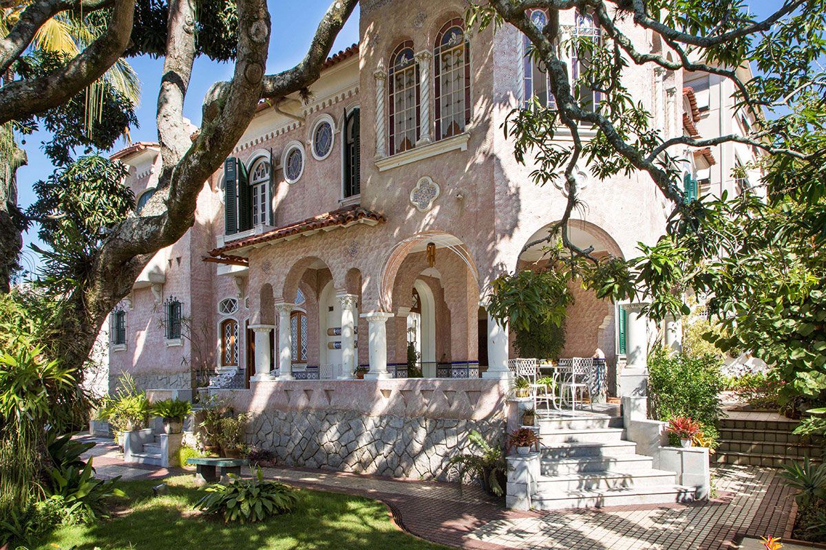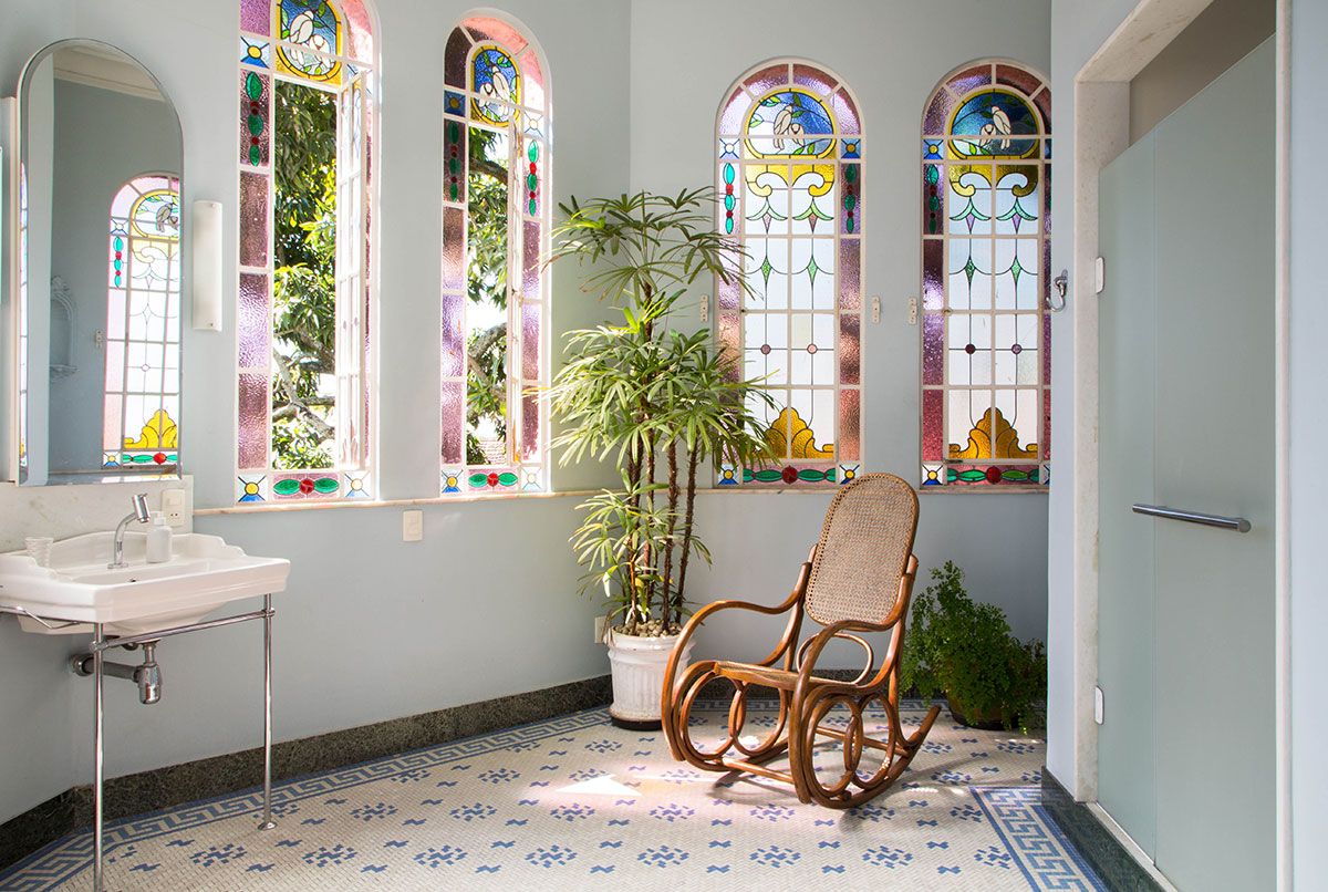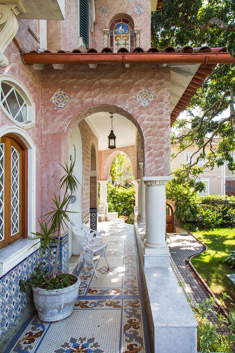 O estilo neo mediterrâneo da casa utiliza elementos diversos das arquiteturas florentina e colonial espanhola, preservados na ornamentação extremamente detalhada dos vitrais, colunas, arcos, sancas e na azulejaria estampada. No jardim de bromélias e orquídeas, coqueiros e árvores frutíferas como mangueiras e goiabeiras costumam atrair micos e aves tropicais. Este cenário é também o pano de fundo do café da manhã, servido na varanda térrea, delimitada por um arco de passagem que foi fechado e revestido com um grande espelho.