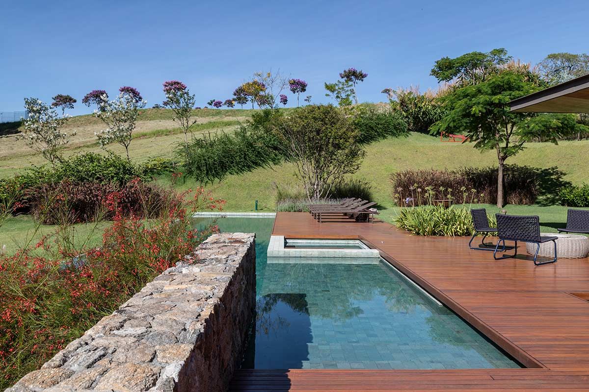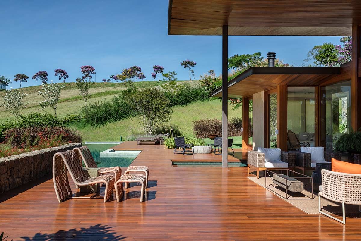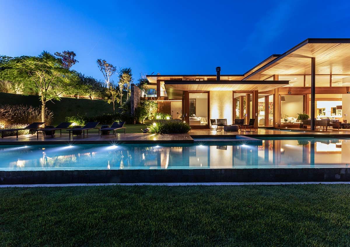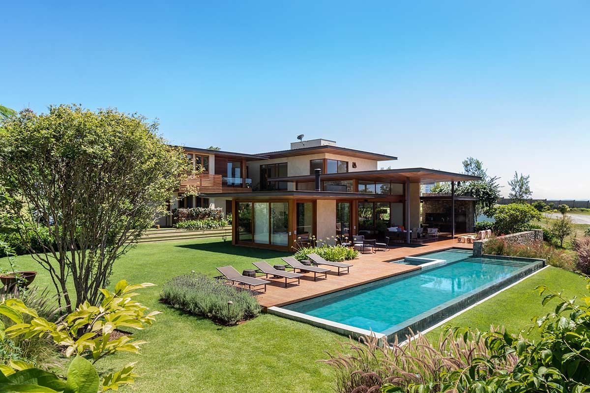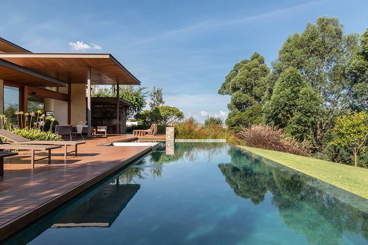 Assinada pelo escritório Gilda Meirelles Arquitetura, esta casa de um jovem casal com filhos pequenos, teve como partido arquitetônico o desenvolvimento de um projeto que acompanhasse a inclinação do terreno, sem que a residência tivesse muitas escadas, e que a vista da mata fosse presente. Buscando integração e conforto, a área social liga-se ao terraço, e o layout conta ainda com cinco suítes.