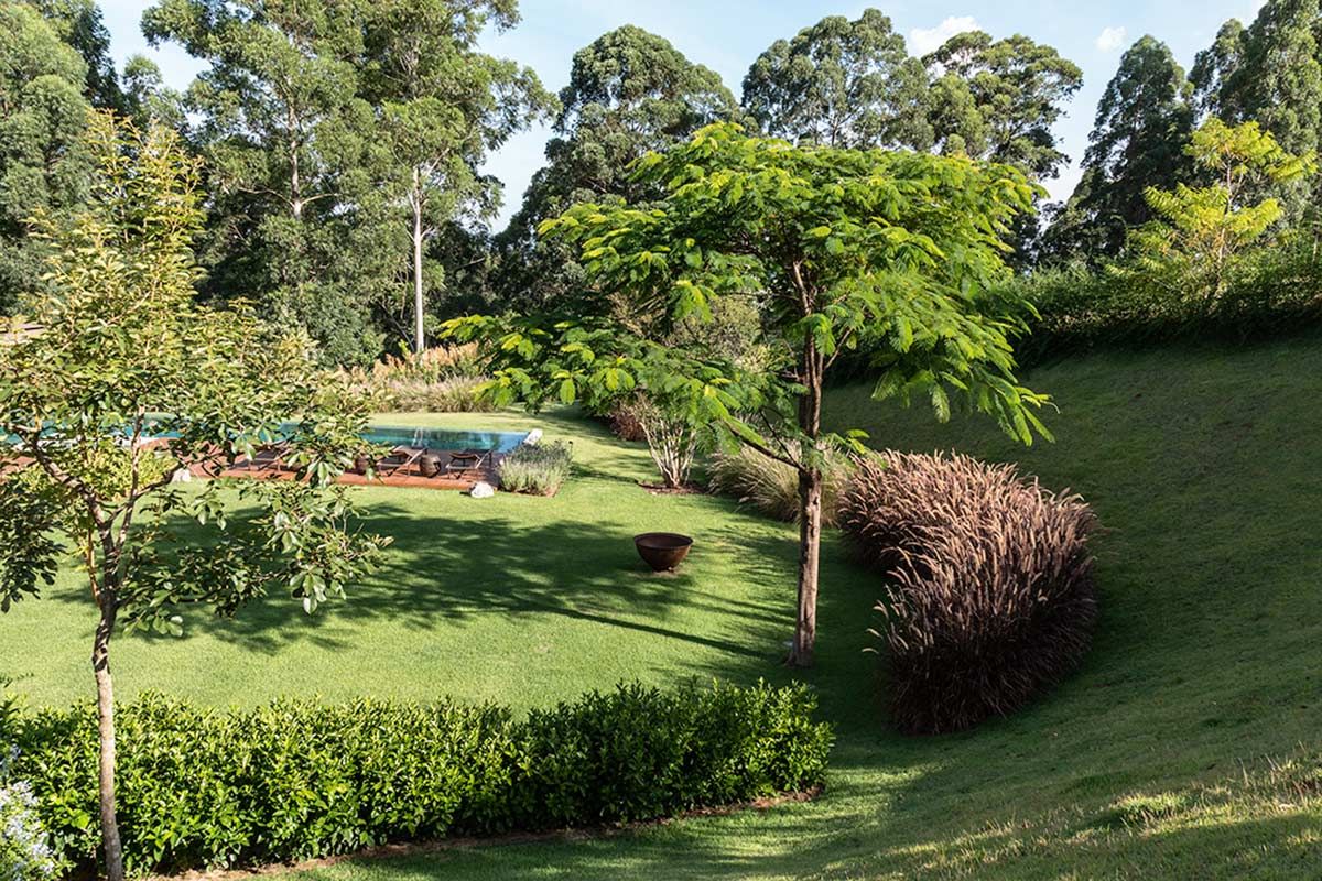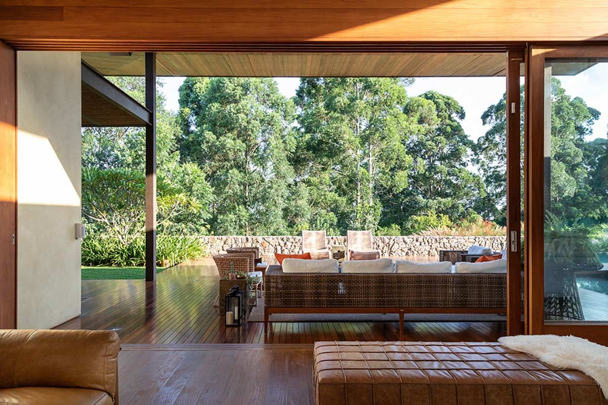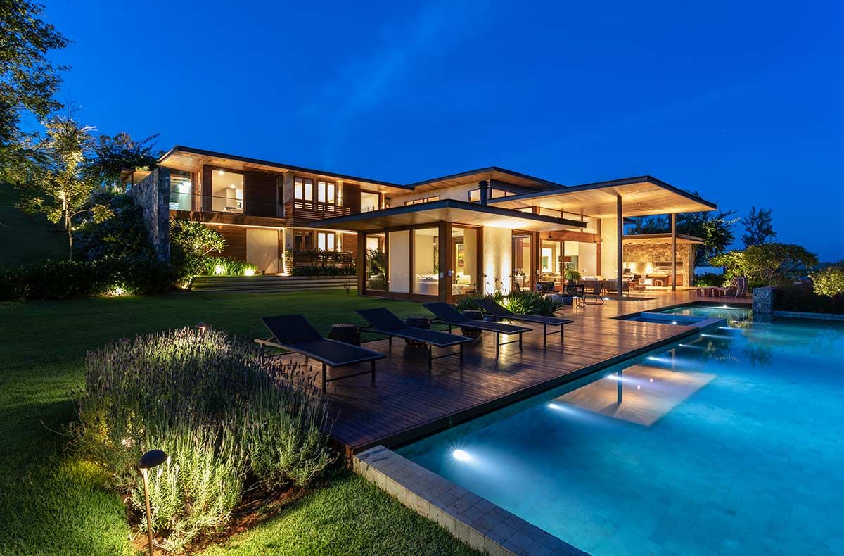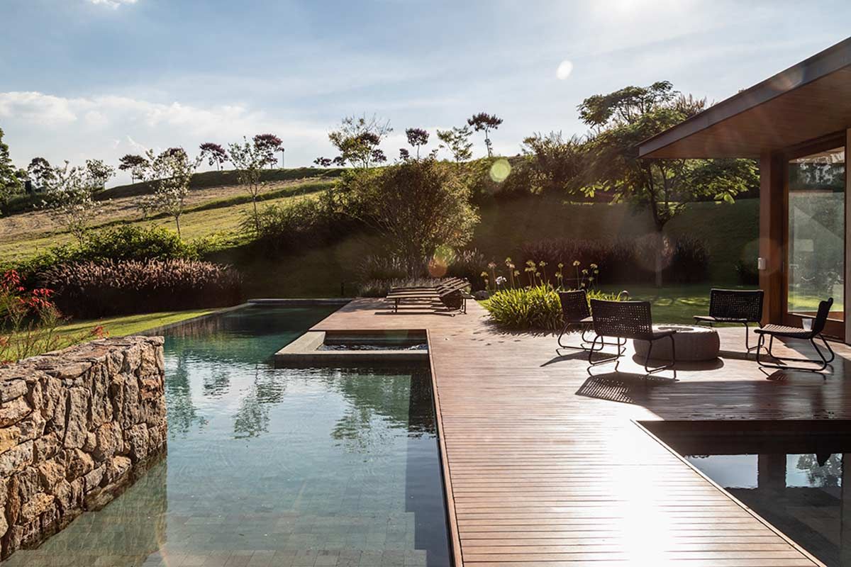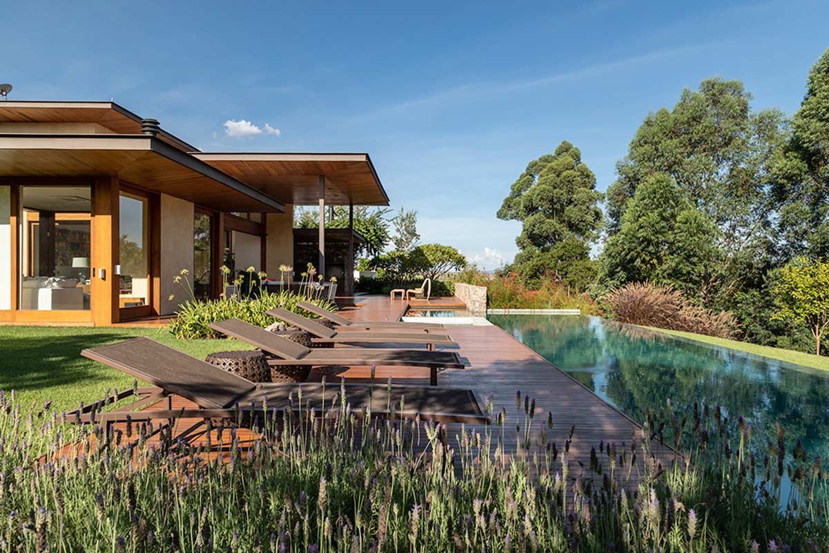Assinada pelo escritório Gilda Meirelles Arquitetura, esta casa de um jovem casal com filhos pequenos, teve como partido arquitetônico o desenvolvimento de um projeto que acompanhasse a inclinação do terreno, sem que a residência tivesse muitas escadas, e que a vista da mata fosse presente. Buscando integração e conforto, a área social liga-se ao terraço, e o layout conta ainda com cinco suítes.