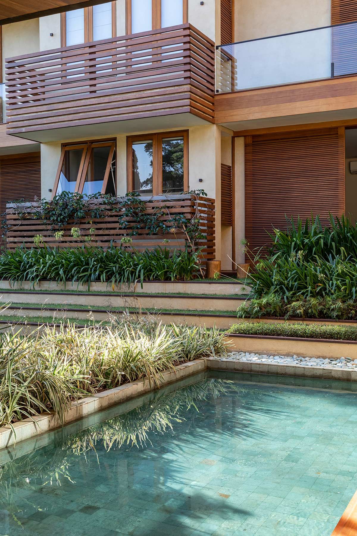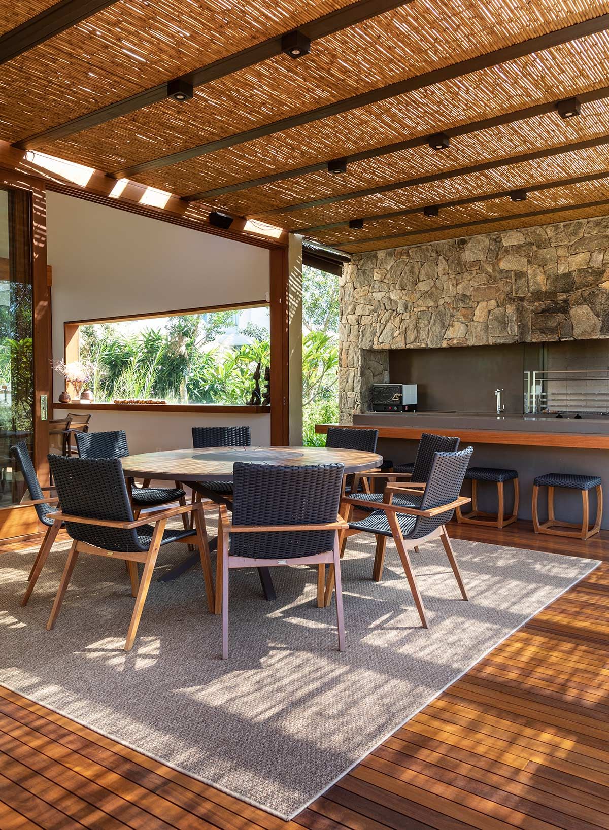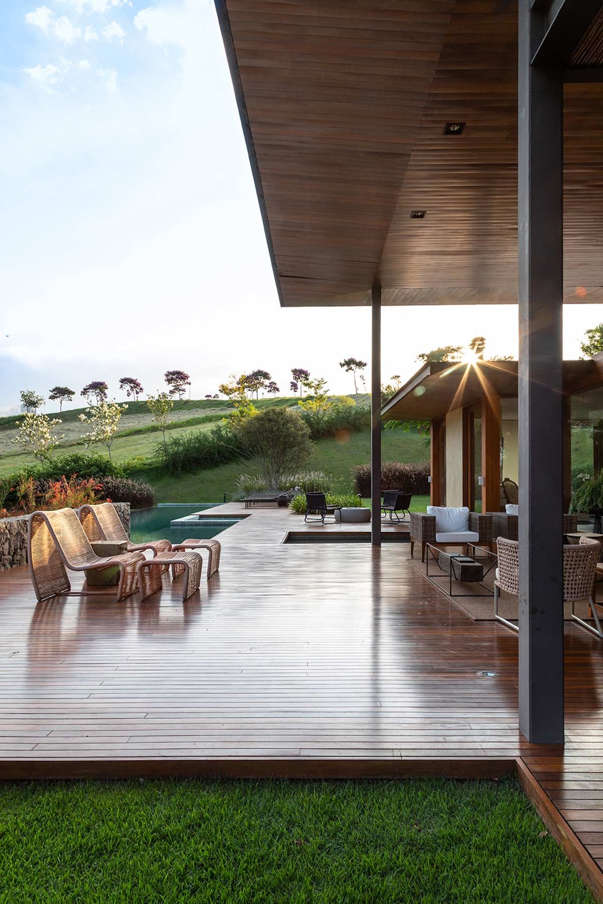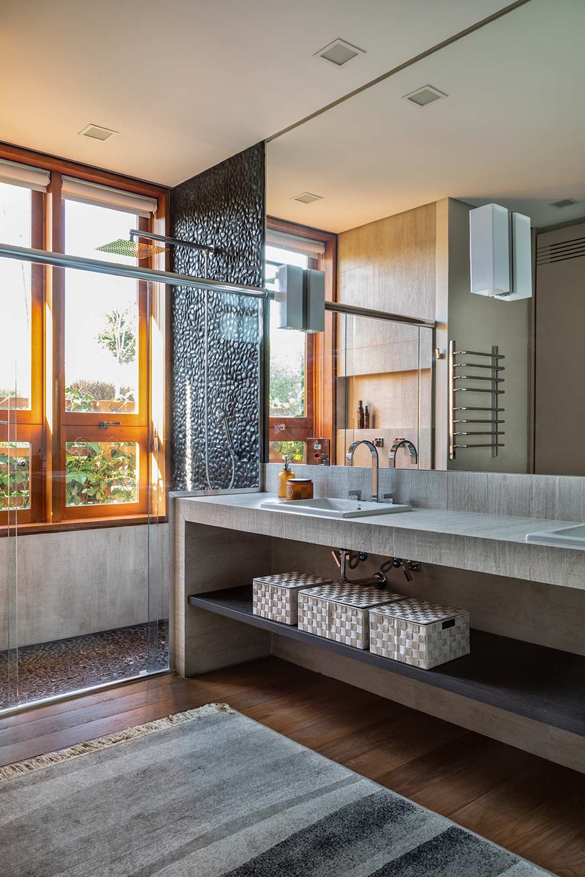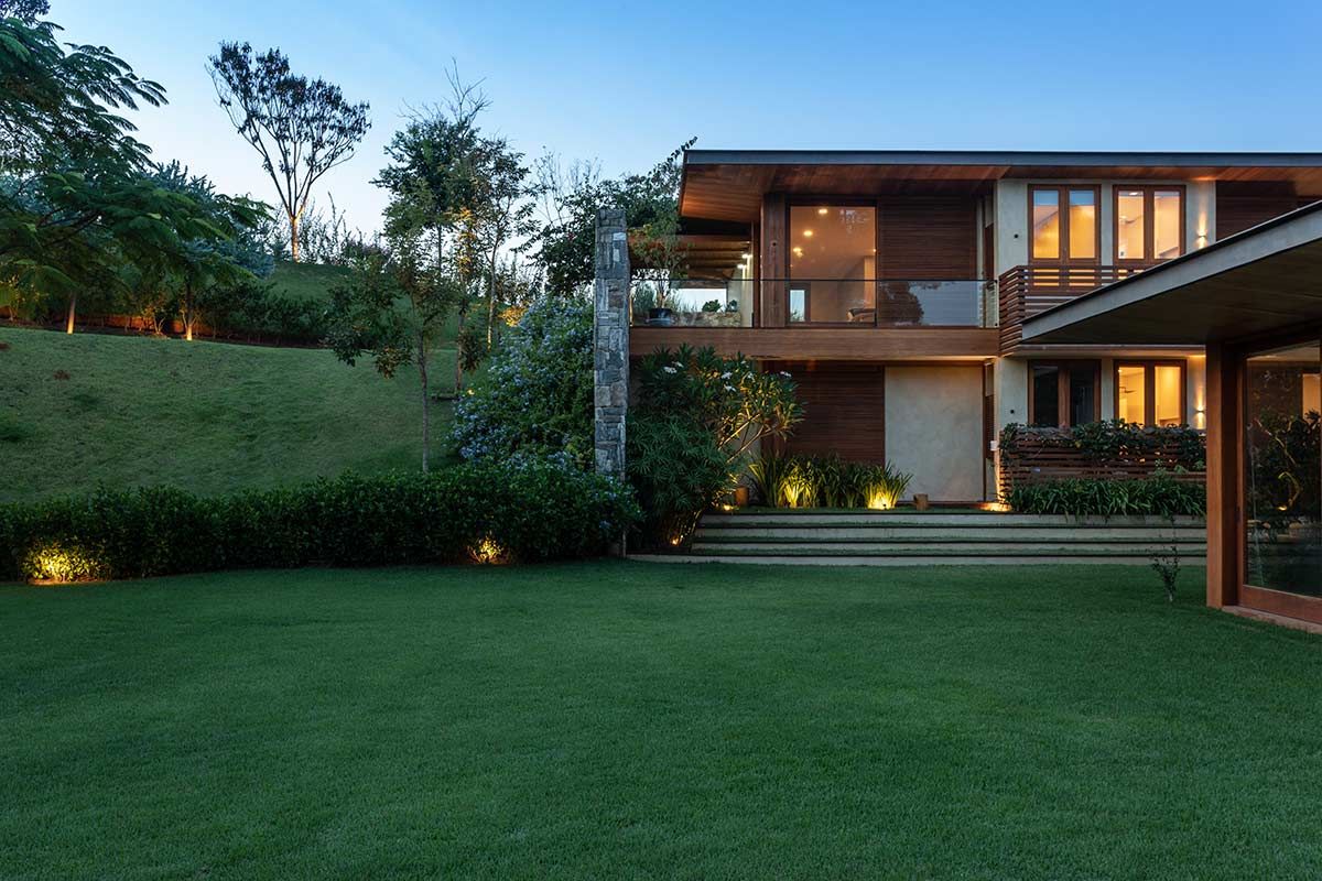 Os acabamentos naturais continuam ainda representados pela pedra e o vidro, que assim como a madeira, aparecem em vários momentos para acentuar a conexão com a natureza. Junto ao paisagismo, a iluminação externa complementou o projeto, fornecendo um efeito charmoso para toda a construção e implantação.