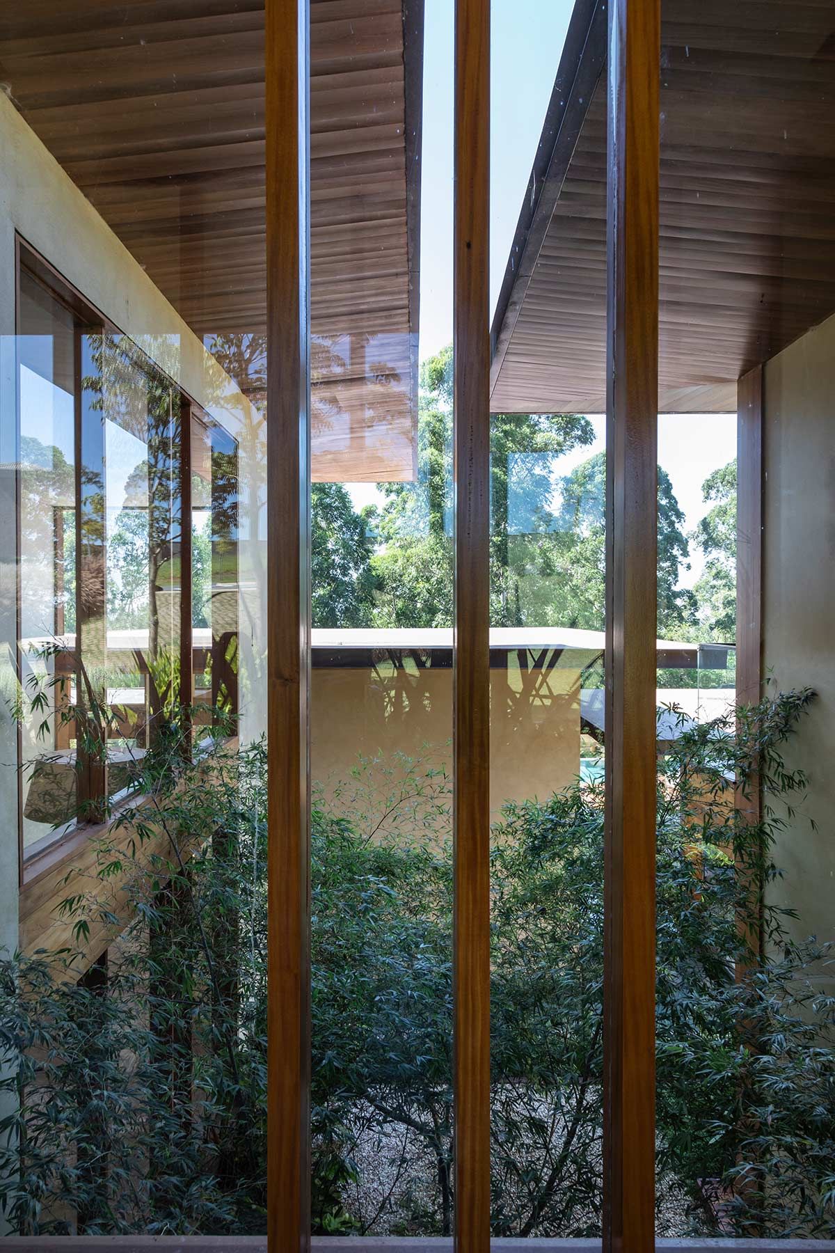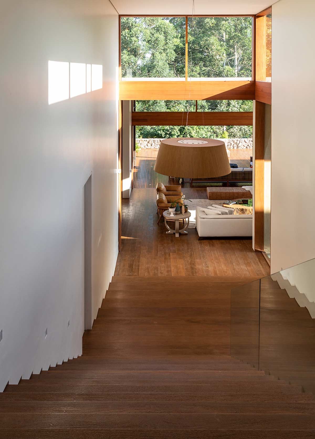 O grande declive do lote, que era o principal desafio, tornou-se o diferencial do projeto. Ele possibilitou que criássemos módulos em níveis diferentes, setorizando as áreas íntima, social e de serviço; e que integrássemos a casa com a mata, dando a sensação de que ela brota do terreno.