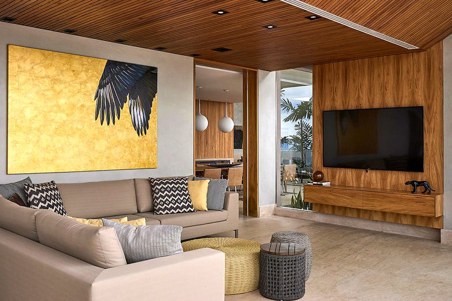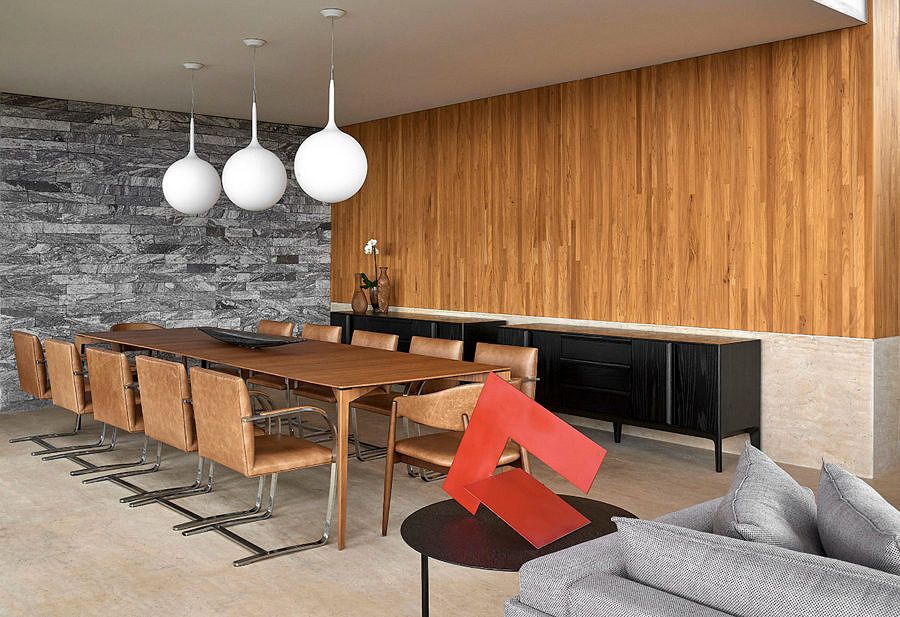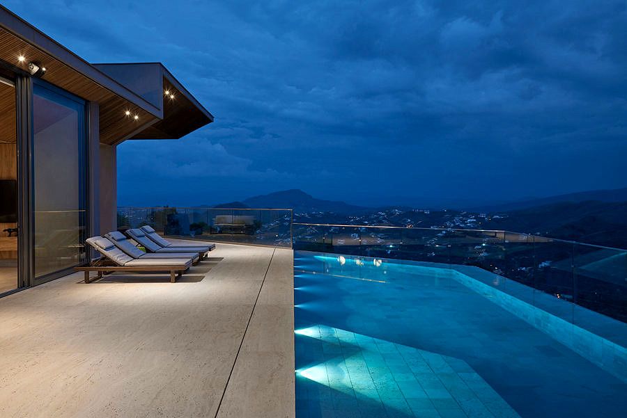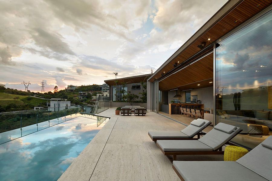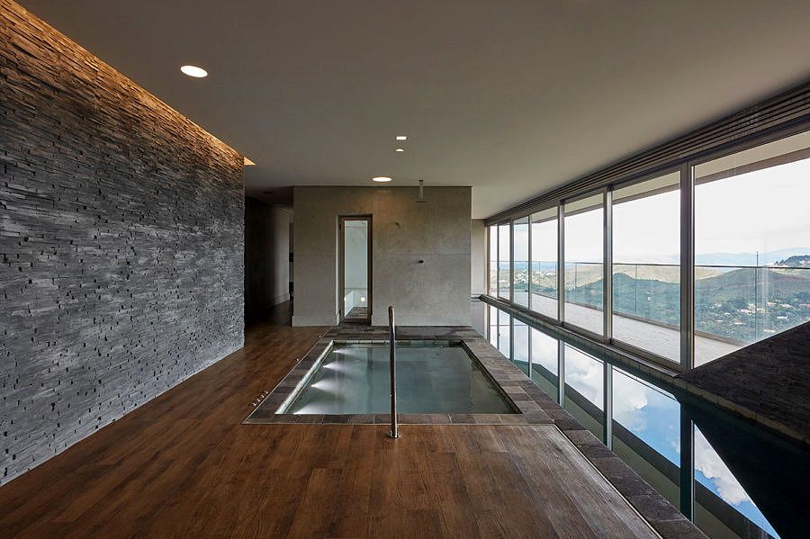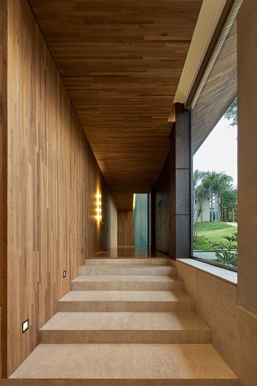 No pavimento inferior estão localizados garagem, áreas de serviço e técnicas, além de uma área de lazer, com piscina, spa e ginástica, e um cinema para 20 pessoas. Foi criada uma escada na fachada dos fundos para conectar a área da piscina descoberta com o spa, no subsolo, sem precisar passar por dentro de casa. A escada na fachada ajuda na relação visual com o terreno, uma vez que seu desenho acompanha o mesmo.