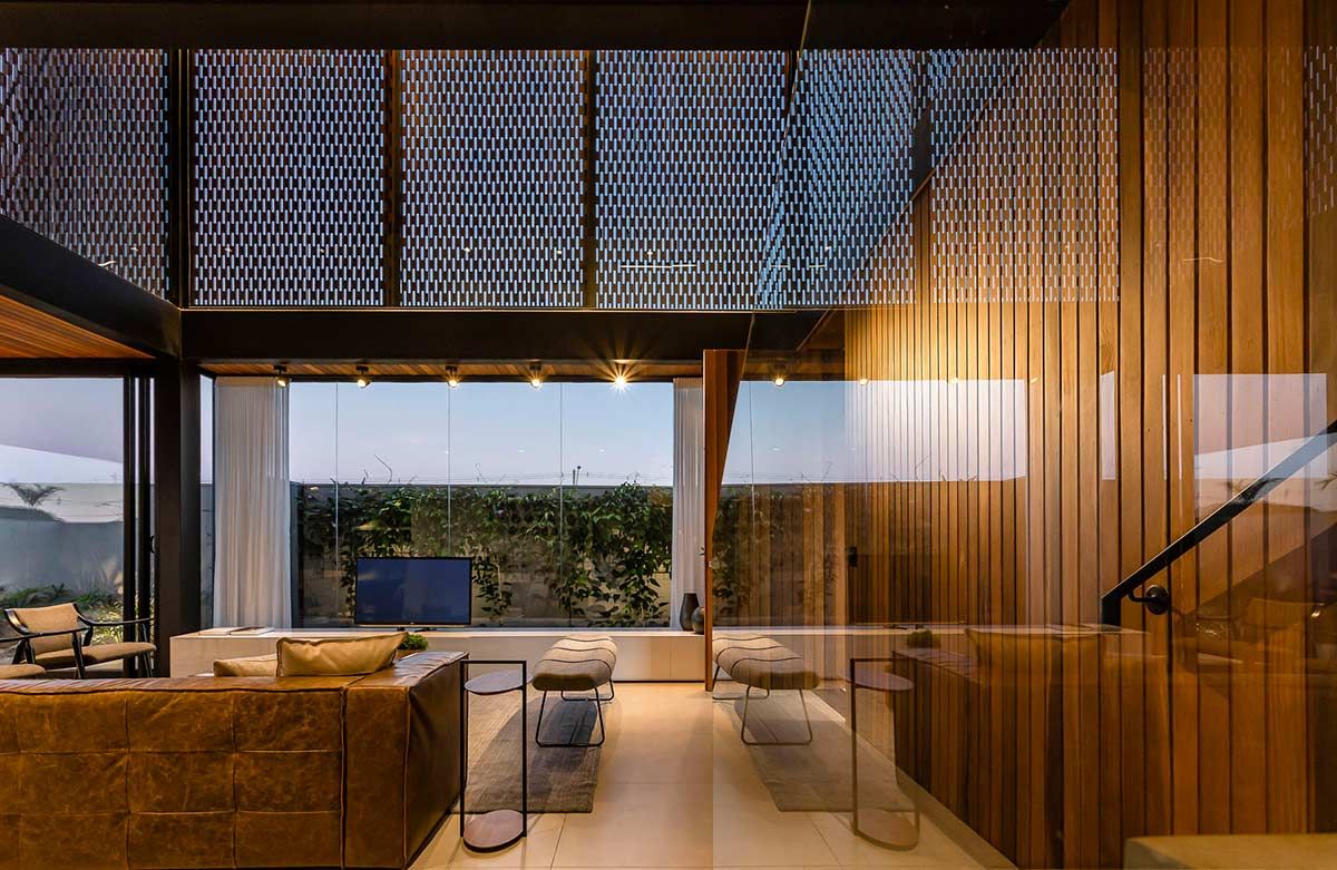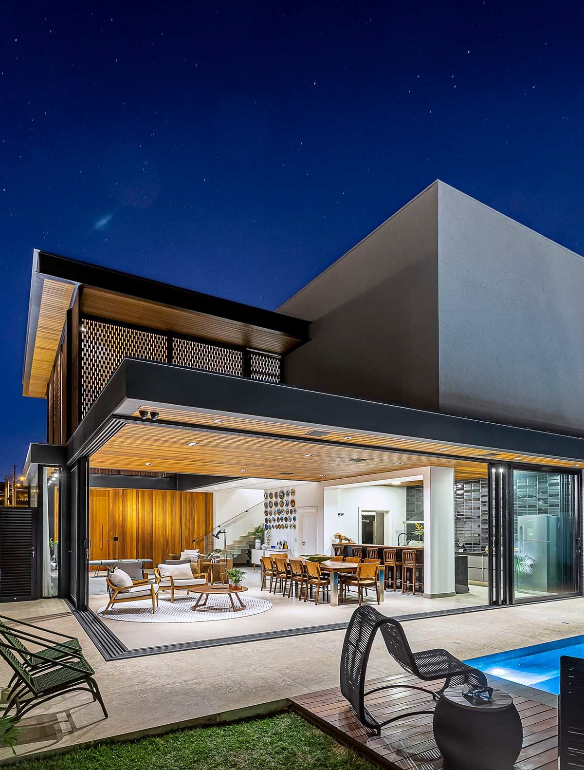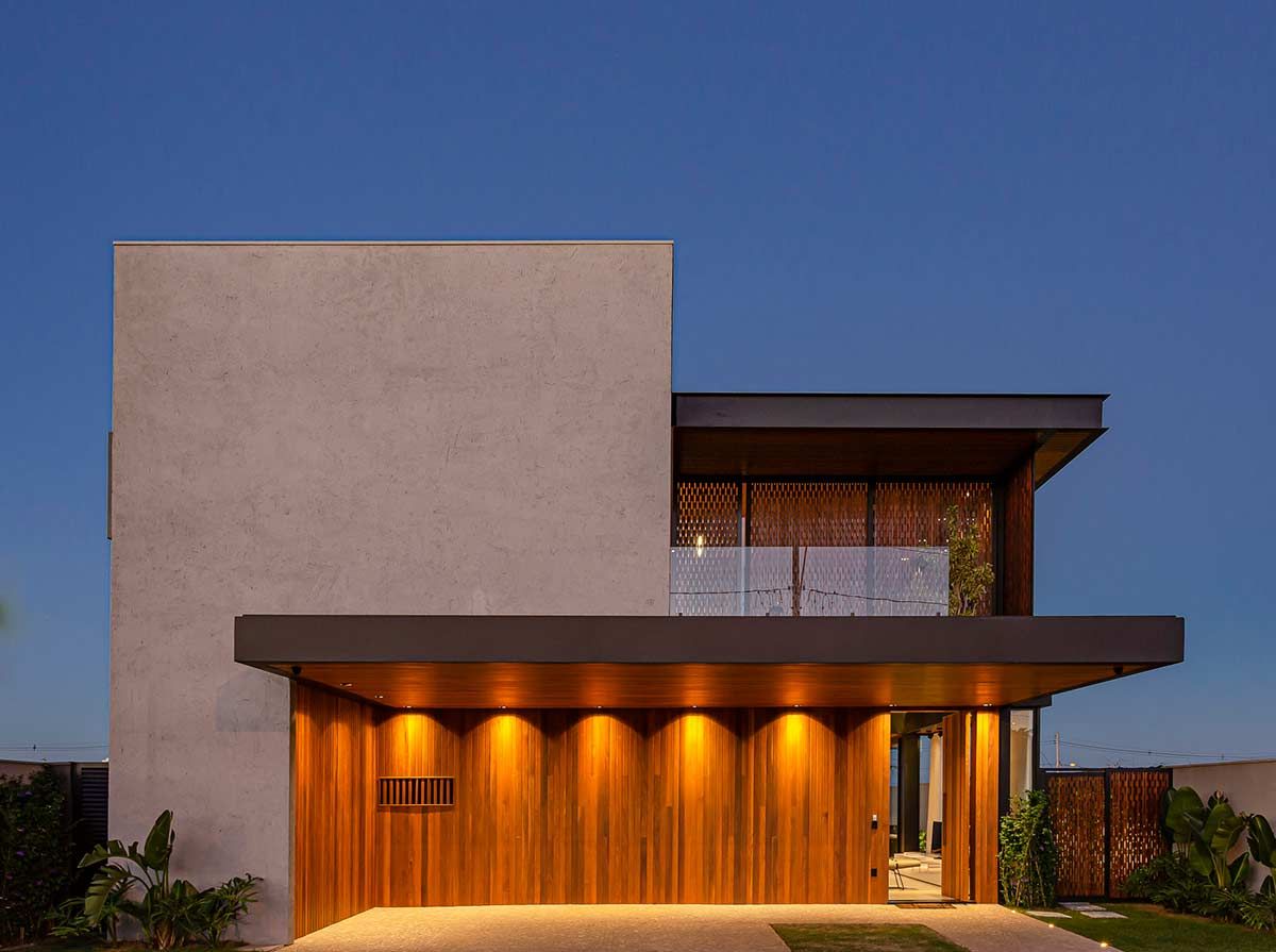 Para proporcionar grandes festas a seus convidados, o proprietário desta casa solicitou ao arquiteto Fagner Mendes Gava que a construção tivesse ambientes integrados, de forma que as áreas interna e externa se complementassem. Com varanda gourmet e piscina unidas através de portas deslizantes, a arquitetura foi executada em estrutura metálica e concreto, e a fachada conta com detalhes em muxarabi.