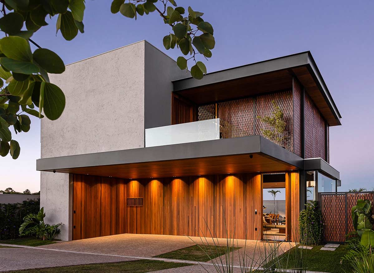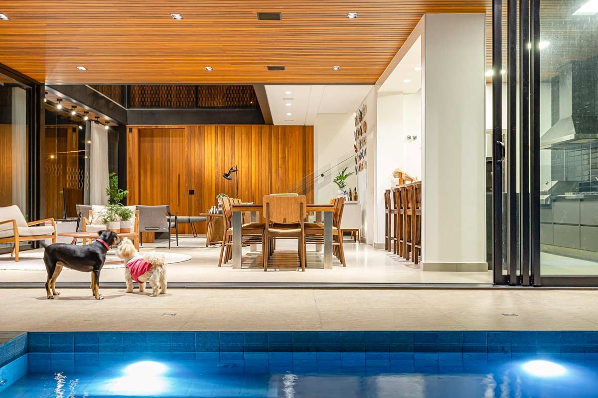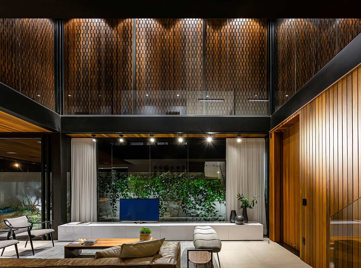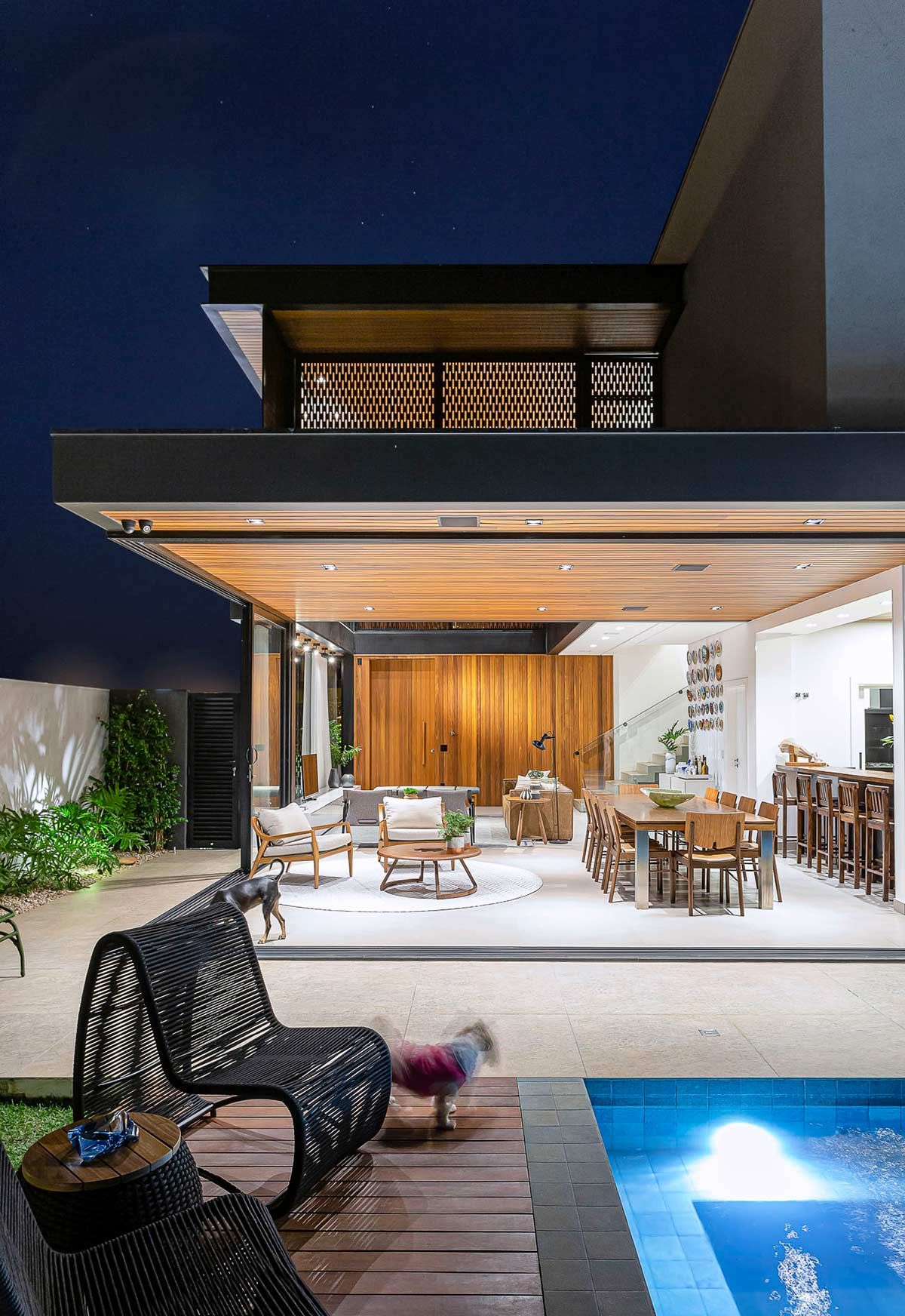 Para proporcionar grandes festas a seus convidados, o proprietário desta casa solicitou ao arquiteto Fagner Mendes Gava que a construção tivesse ambientes integrados, de forma que as áreas interna e externa se complementassem. Com varanda gourmet e piscina unidas através de portas deslizantes, a arquitetura foi executada em estrutura metálica e concreto, e a fachada conta com detalhes em muxarabi.