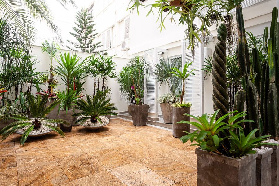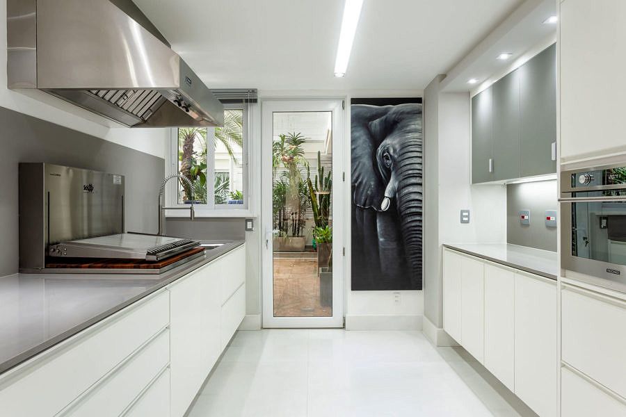 O projeto assinado pela arquiteta Vivian Reimers e o Angelo de Castro coloca a cozinha no centro do apartamento, que fica no primeiro andar e tem acesso exclusivo ao pátio. No layout, foram delimitadas as diferentes zonas da nova cozinha, entre elas, as de preparo, cocção, armazenagem, café, adega, copa e inclusive uma churrasqueira, sendo cada uma delas, trabalhadas com os respetivos equipamentos e acessórios para seu melhor uso.