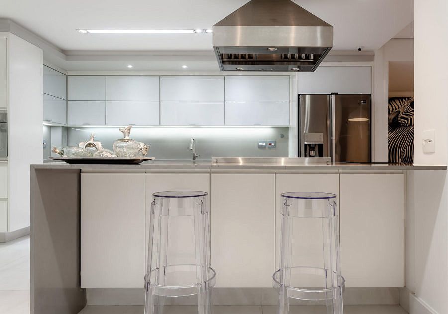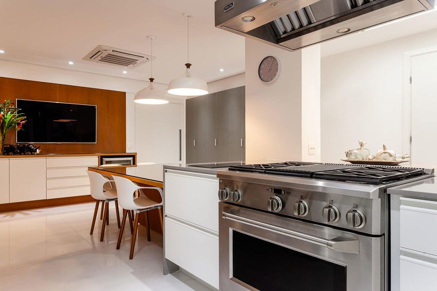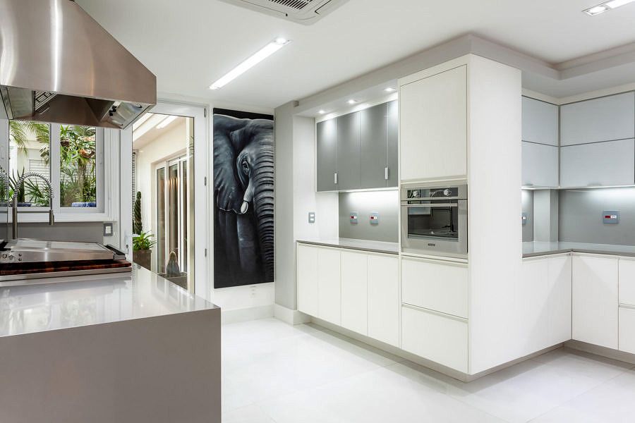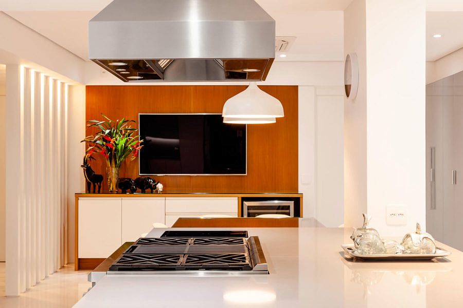 O projeto assinado pela arquiteta Vivian Reimers e o Angelo de Castro coloca a cozinha no centro do apartamento, que fica no primeiro andar e tem acesso exclusivo ao pátio. No layout, foram delimitadas as diferentes zonas da nova cozinha, entre elas, as de preparo, cocção, armazenagem, café, adega, copa e inclusive uma churrasqueira, sendo cada uma delas, trabalhadas com os respetivos equipamentos e acessórios para seu melhor uso.