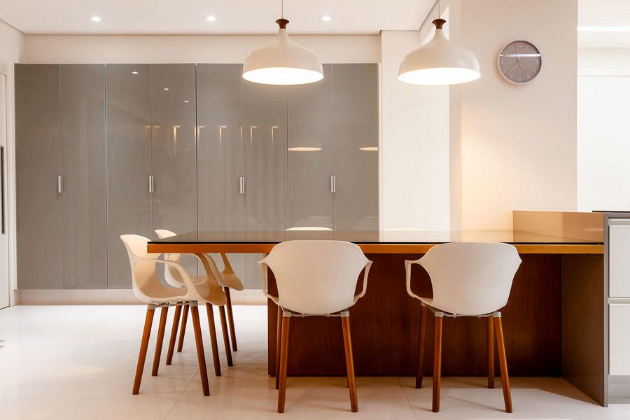 O destaque do projeto é a ampla ilha central, onde se concentra a área de preparo e cocção, elemento que por sua vez serve como bancada de apoio, já que além de servir para o desfrute, por exemplo, de um descontraído café da manhã, é o lugar adequado para degustar as delícias do chef durante a preparação da refeição, que por sua vez, será servida na mesa de jantar que surge como uma prolongação da ilha.