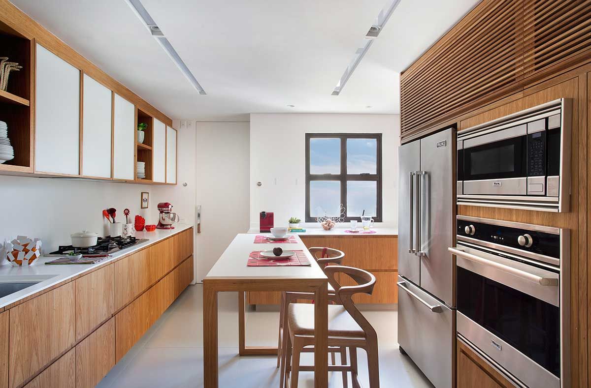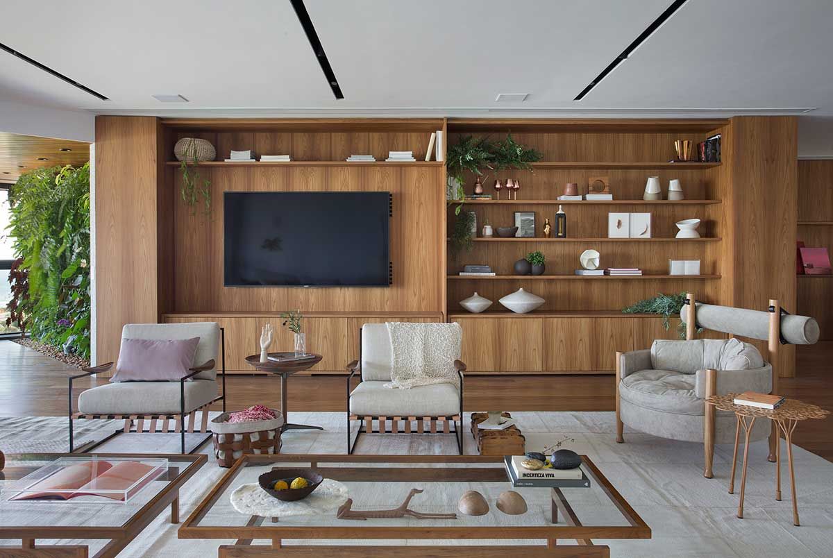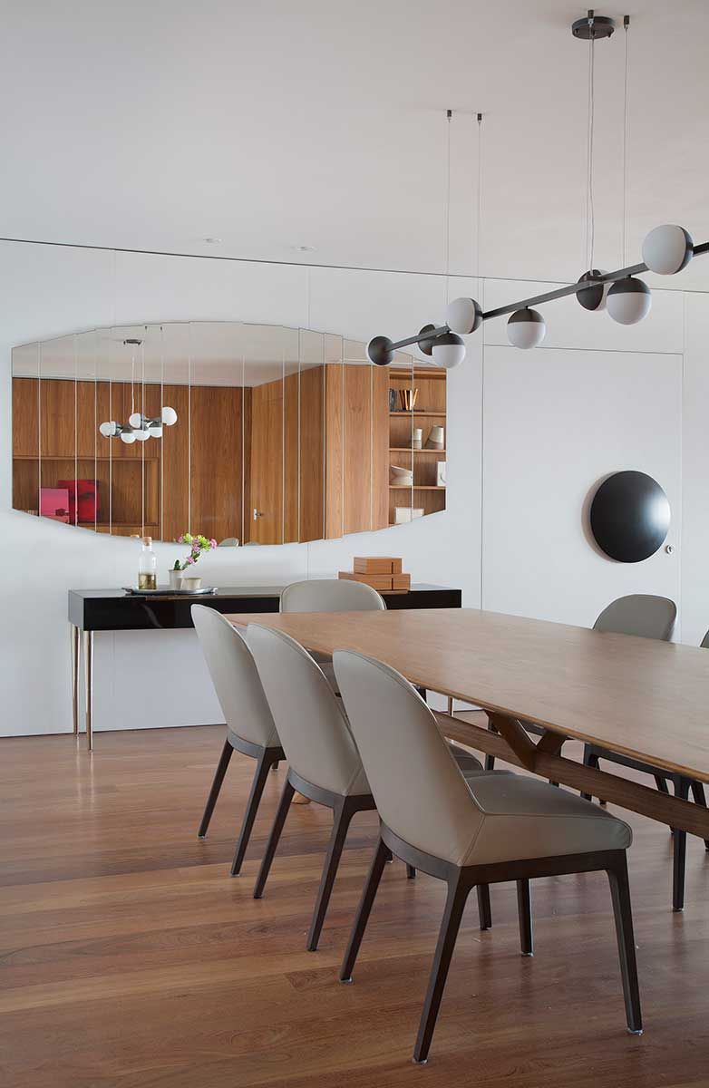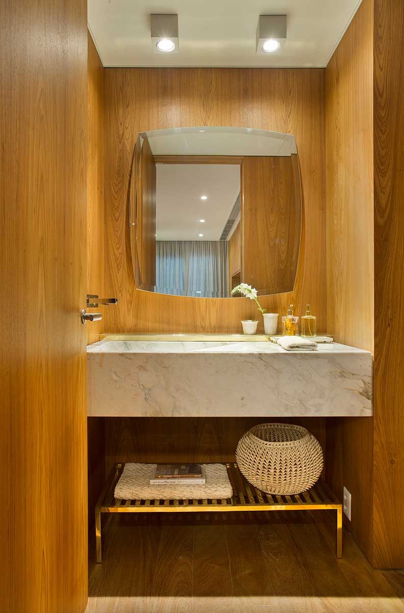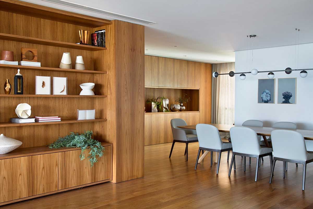 Painéis em madeira surgem em toda a circulação, camuflando acessos ao lavabo e roupeiro. A madeira se apresenta em estantes e painéis com volumetrias estratégicas que percorrem todos os cômodos. Tal material nobre contrasta de forma charmosa com o mobiliário contemporâneo e moderno escolhido para todo o apartamento.
