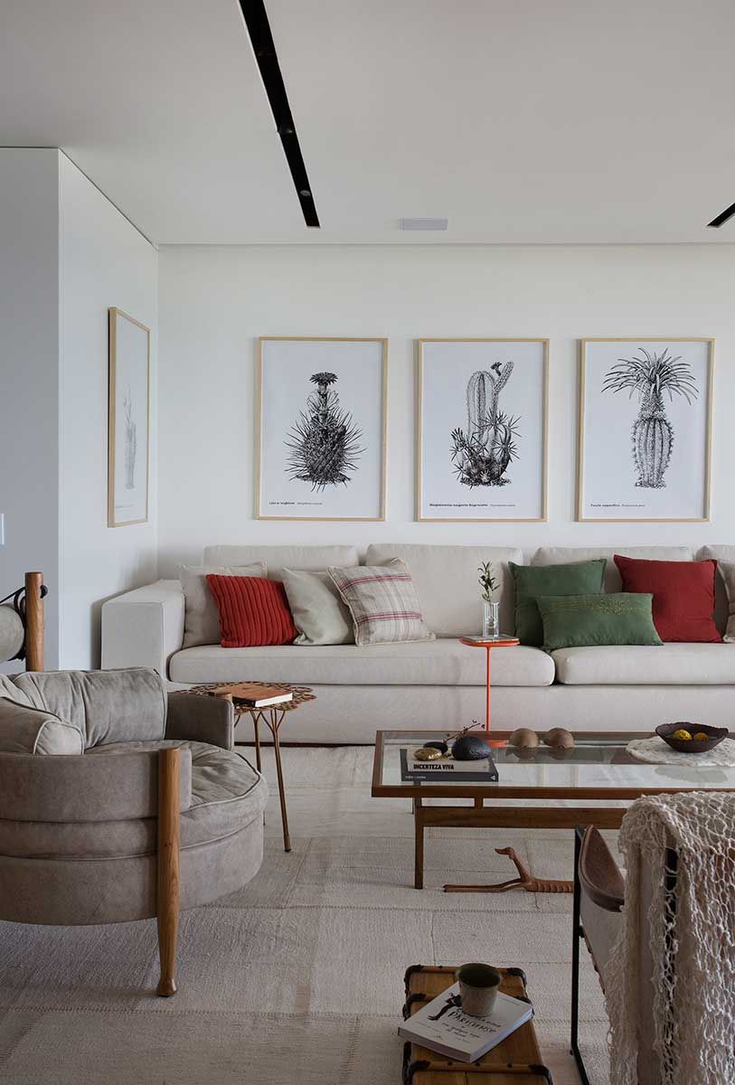 Os quatro quartos originais foram transformados em uma generosa suíte máster, com closet e ampla sala de banho com dois ambientes. A varanda foi incorporada ao living com jantar, favorecendo espaços multiuso bem arejados e iluminados onde ícones do mobiliário brasileiro se destacam.