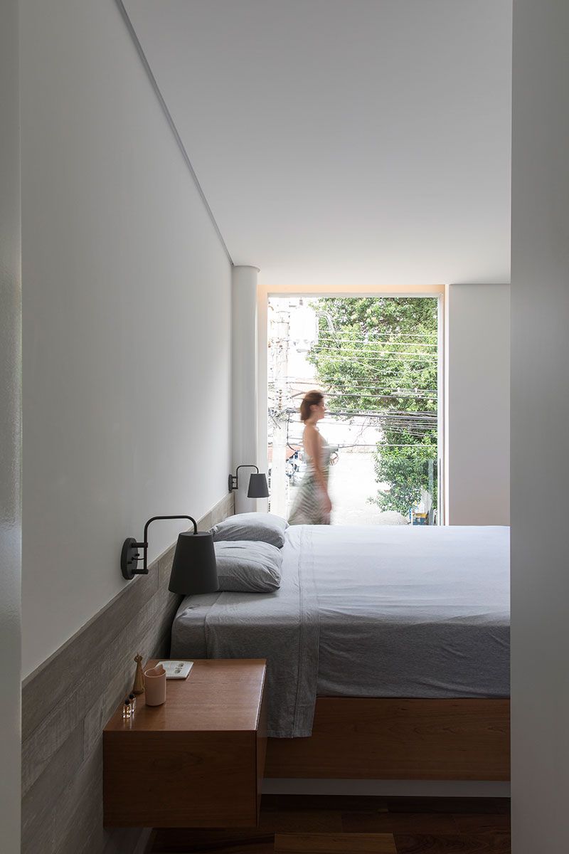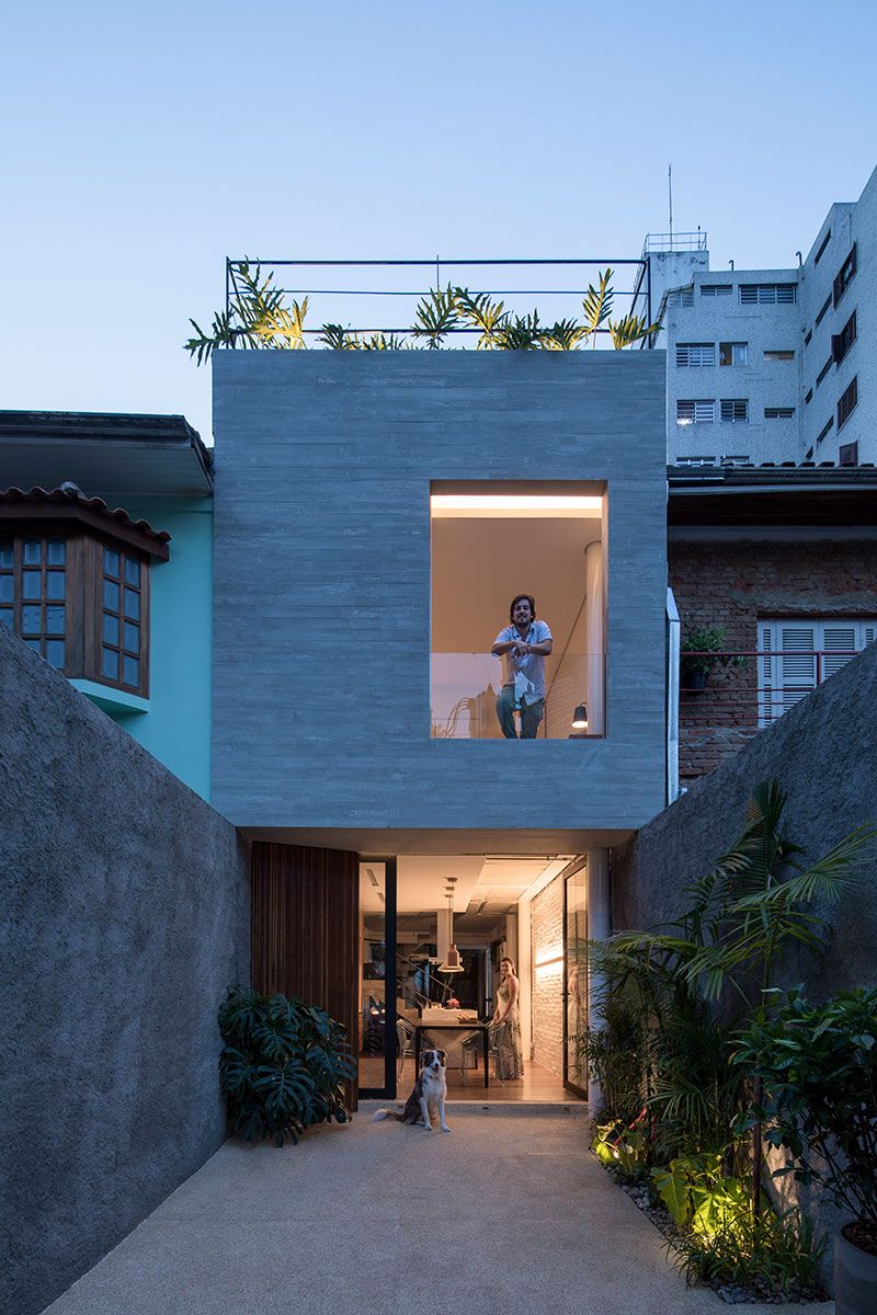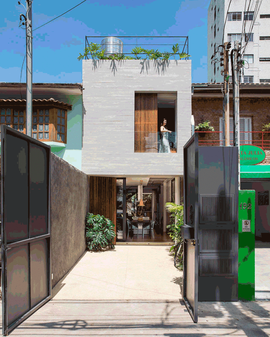 Após a demolição, o lote urbano que mede 4×24 metros se dividiu em três níveis: térreo, superior e cobertura jardim. No térreo fica a cozinha, sala de estar, jardim e churrasqueira. O percurso se inicia no recuo frontal em que o paisagismo formado por espécies nativas da mata atlântica torna a chegada a casa sedutora.