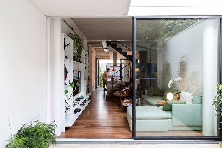 Na sala de estar, a estrutura fica aparente: pilares metálicos, vigas metálicas, lajes painel, tijolos maciços e por fim a estante em chapas metálicas que foi desenhada pelo escritório. O jardim central, entre o estar e a churrasqueira, fora presenteado com uma jabuticabeira adulta, transplantada na fase final da obra. Além de contribuir com o conforto térmico, a árvore compartilha seus frutos com os moradores.