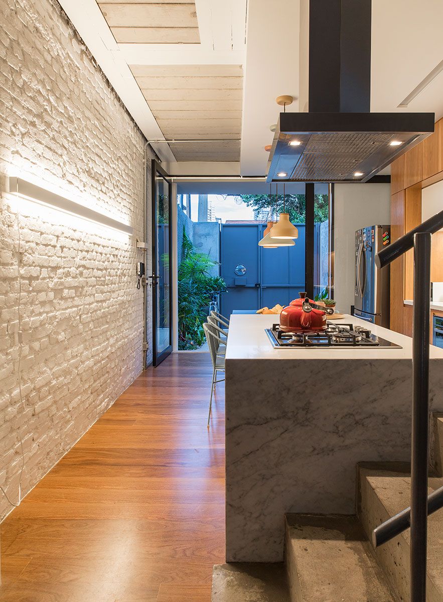 Para que a casa se adaptasse ao morar contemporâneo, a estrutura antiga foi demolida e foram mantidas apenas as alvenarias lindeiras ao lote, que são feitas de tijolo maciço e tinham função estrutural.