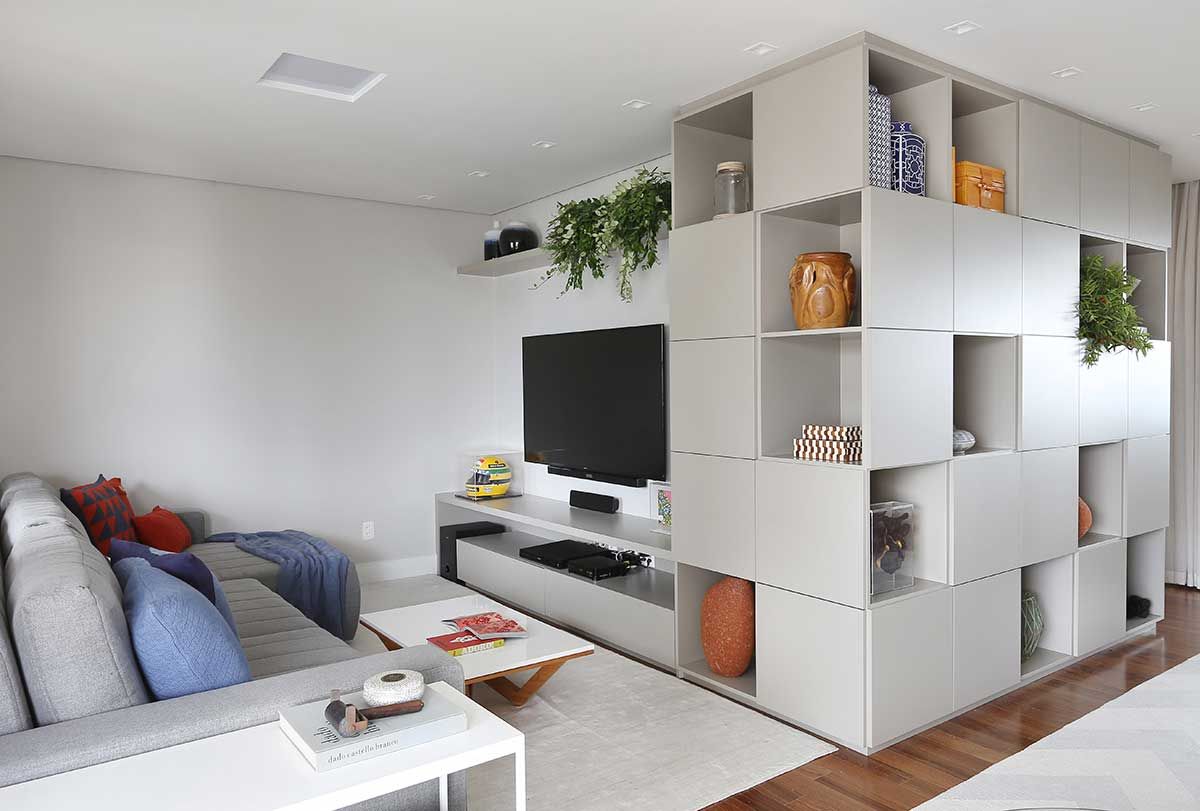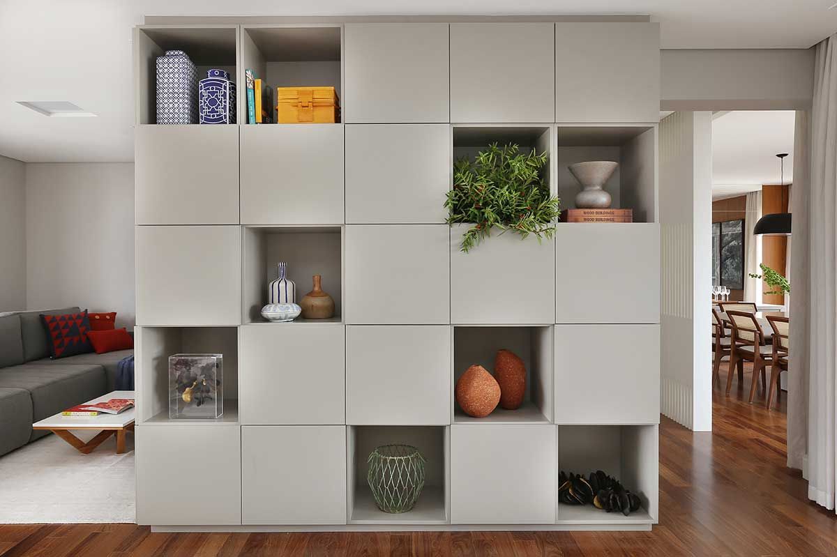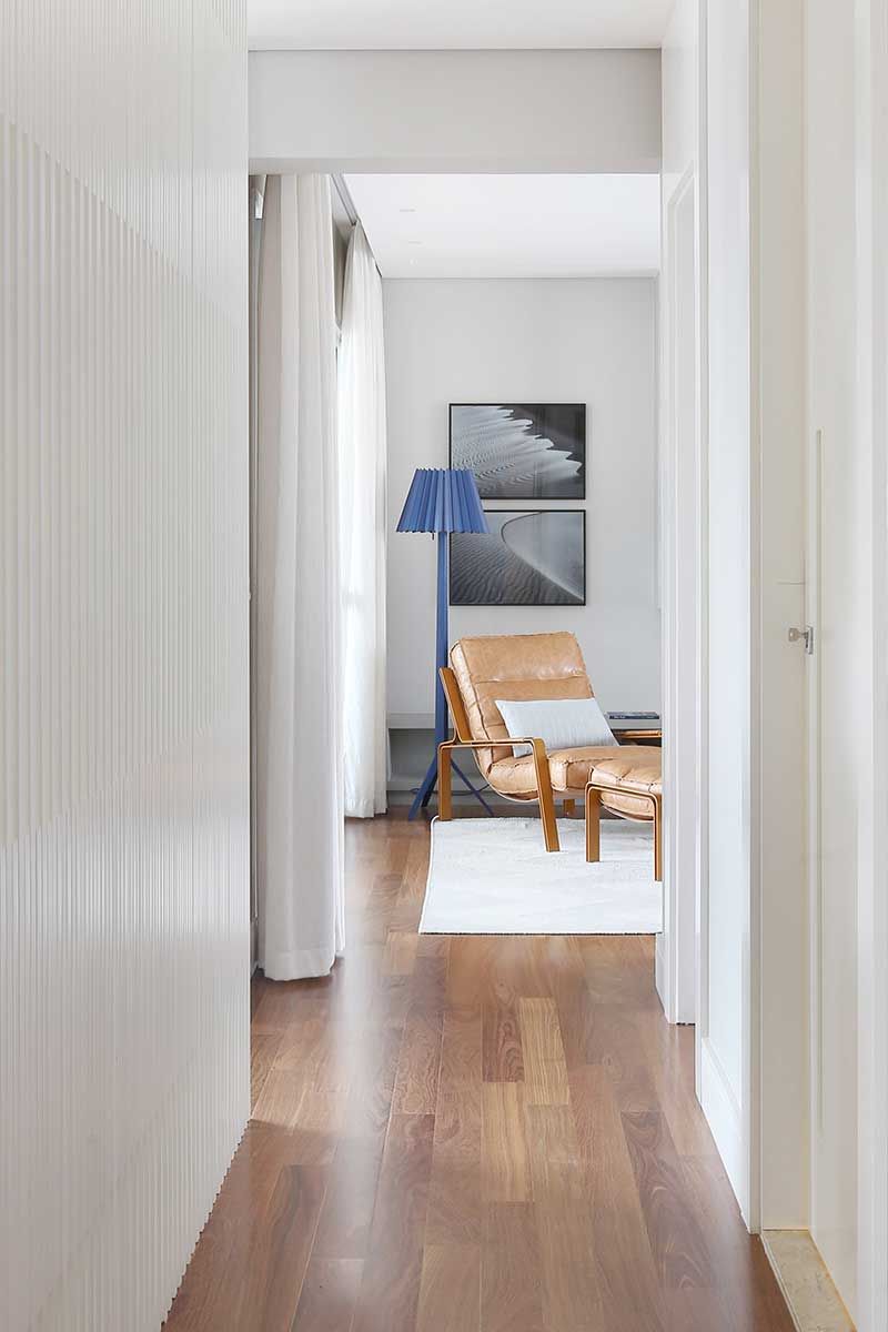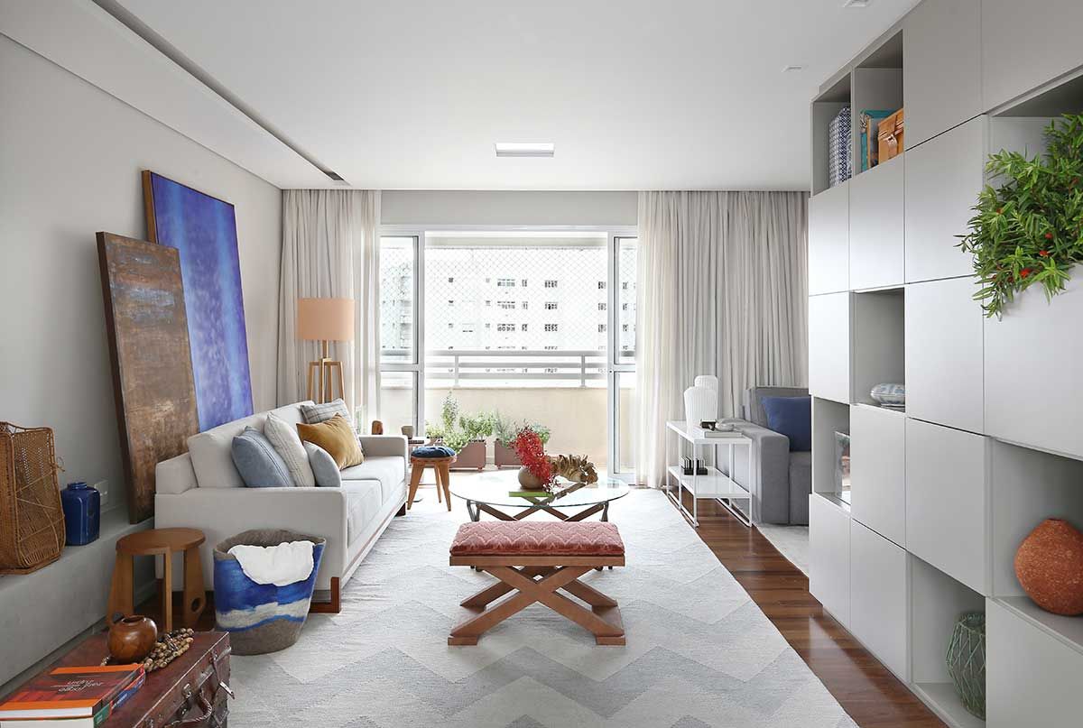 Os espaços são amplos e um desafio para o escritório foi coordenar os móveis para criar espaços aconchegantes e funcionais. Uma estante em marcenaria laqueada foi desenhada para interligar ambientes.