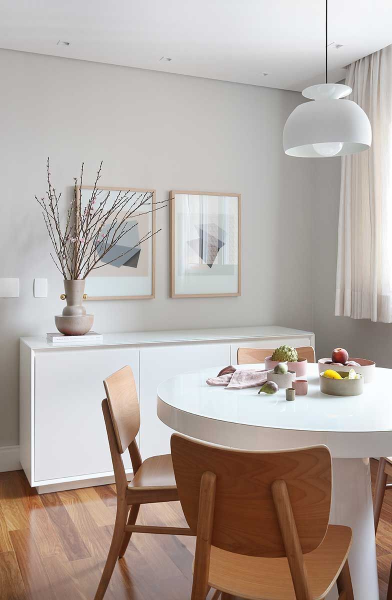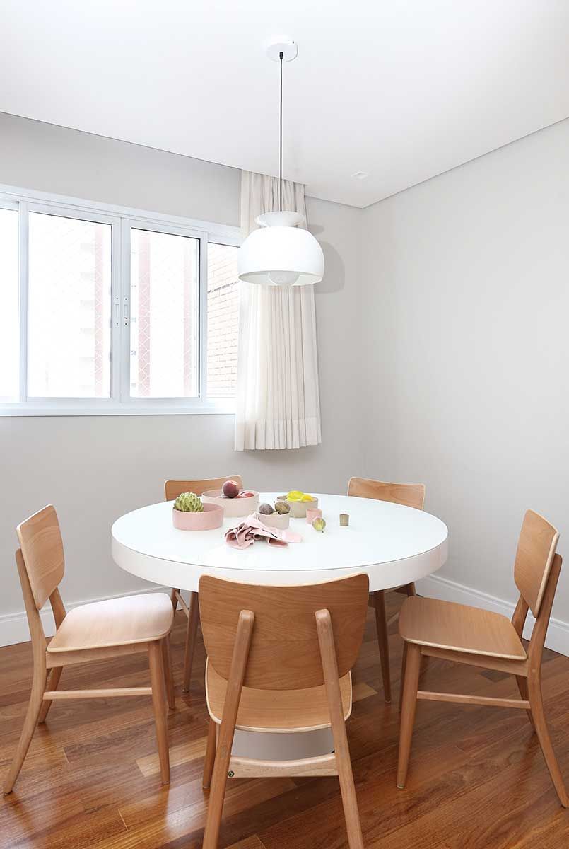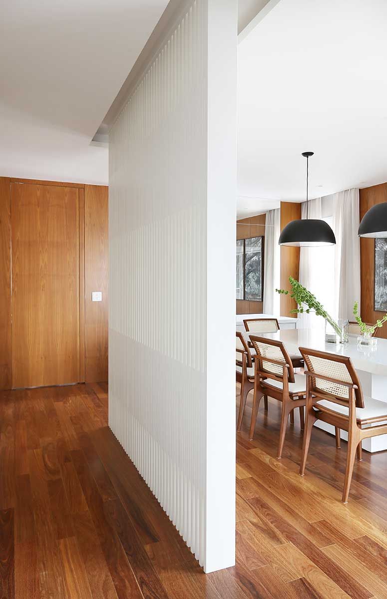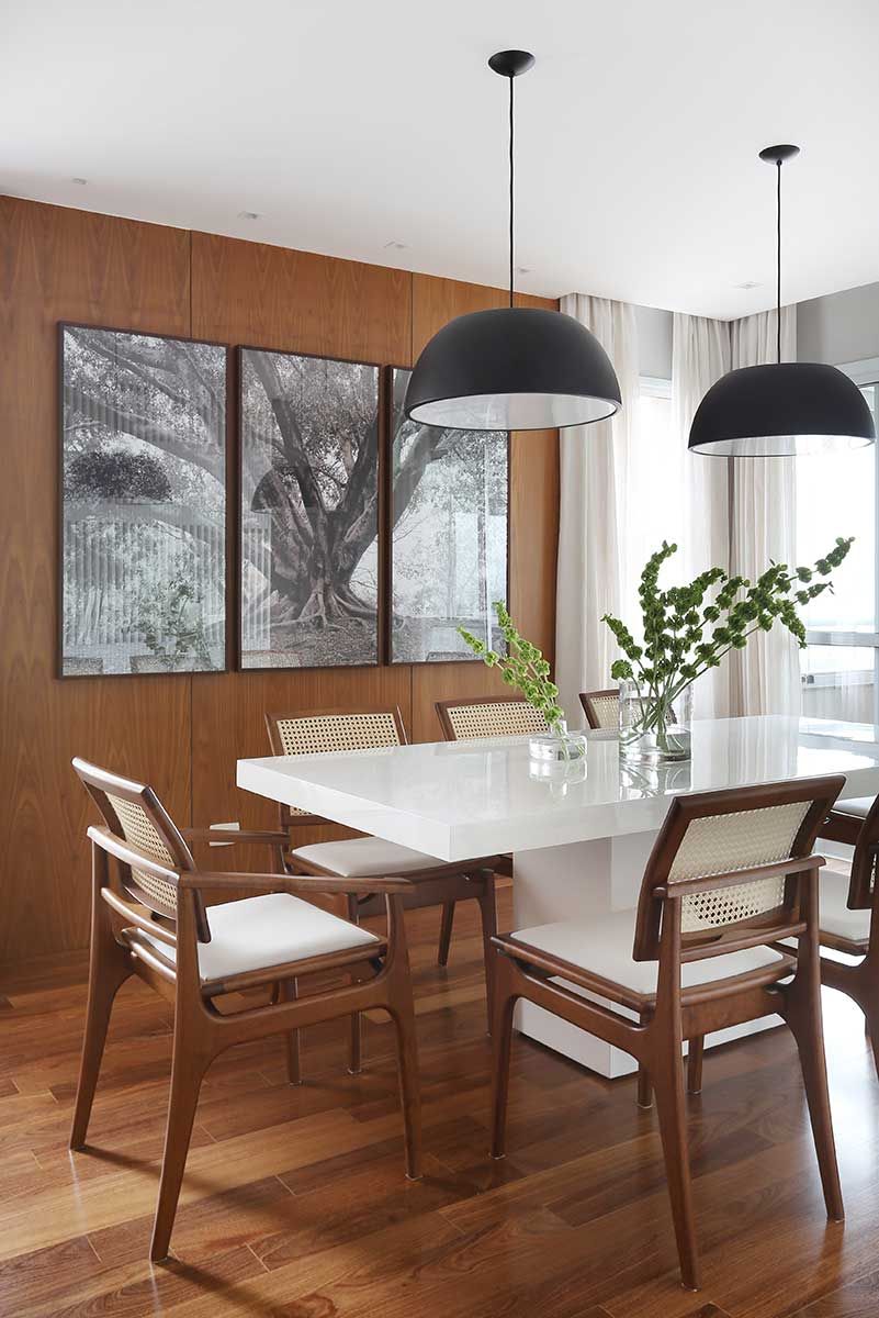 Na sala de jantar painéis de madeira deixam o ambiente mais sofisticado e a mesa clara foi proposta para balancear e não deixar o ambiente muito escuro.