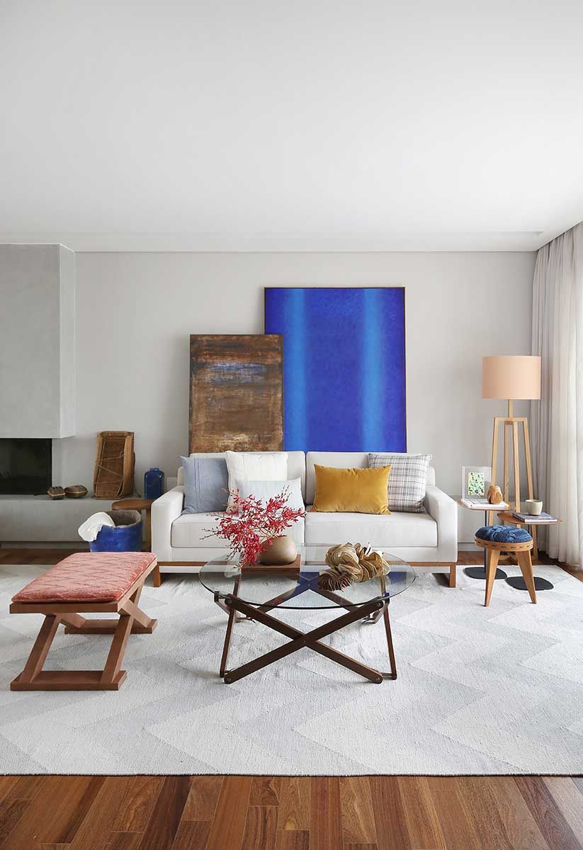 Como os clientes pediram ambientes de cores mais neutras, com uma base sóbria e elegante. O escritório optou por colocar as cores em detalhes pontuais, por exemplo, a tela azul usada no living.