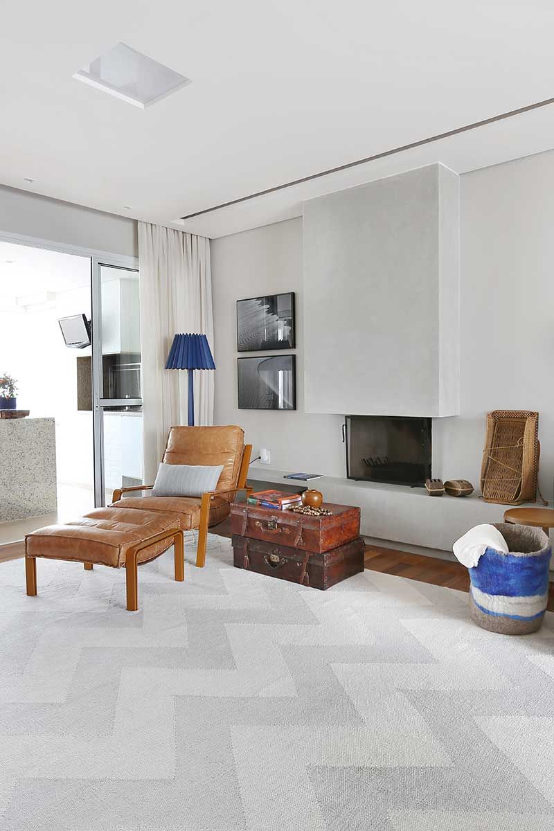 A madeira e os tons de cinza e o branco conversam muito bem entre si para criar essa base neutra. A lareira antiga ganhou uma nova estrutura de pedra (Limestone), tornando-se mais moderna.