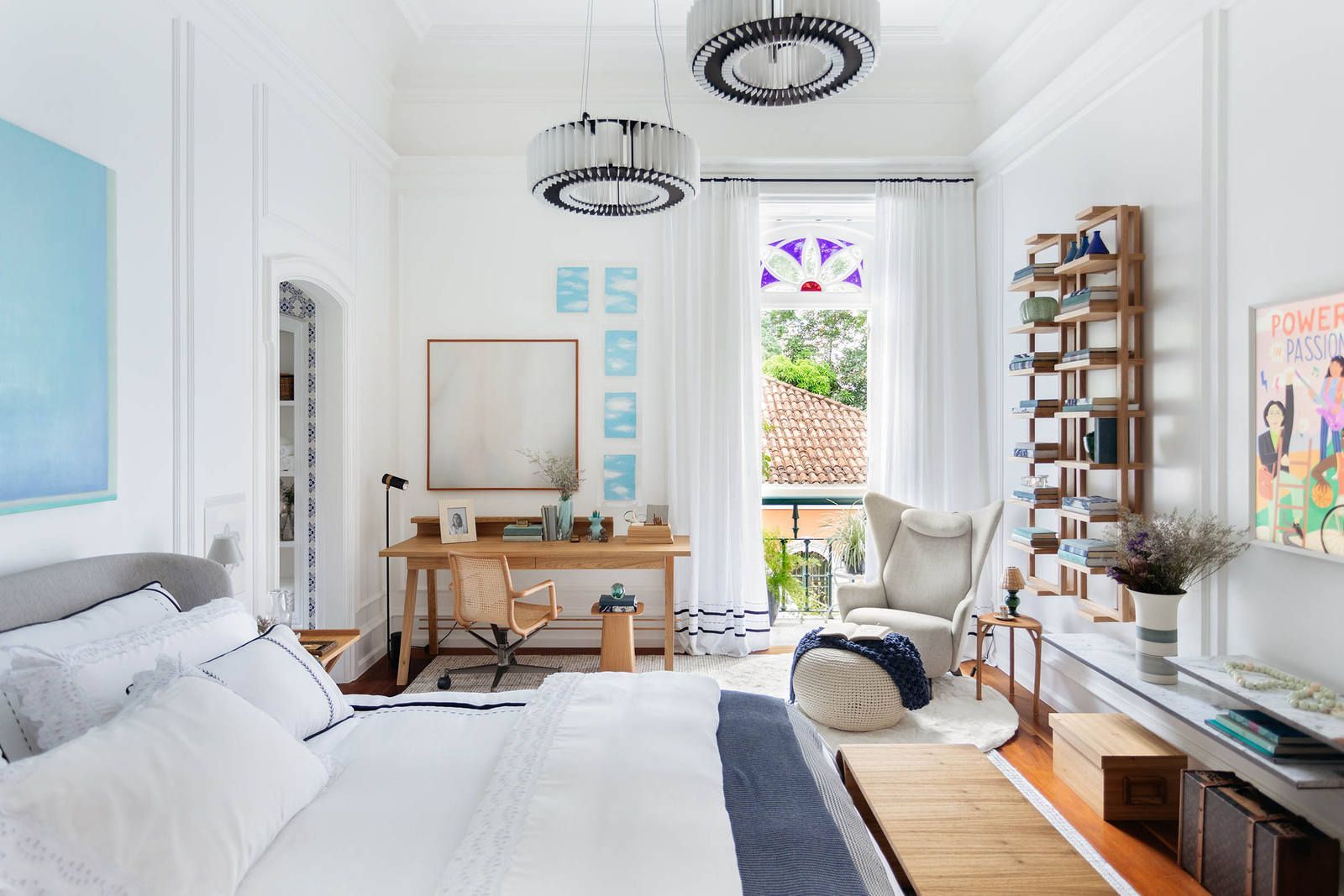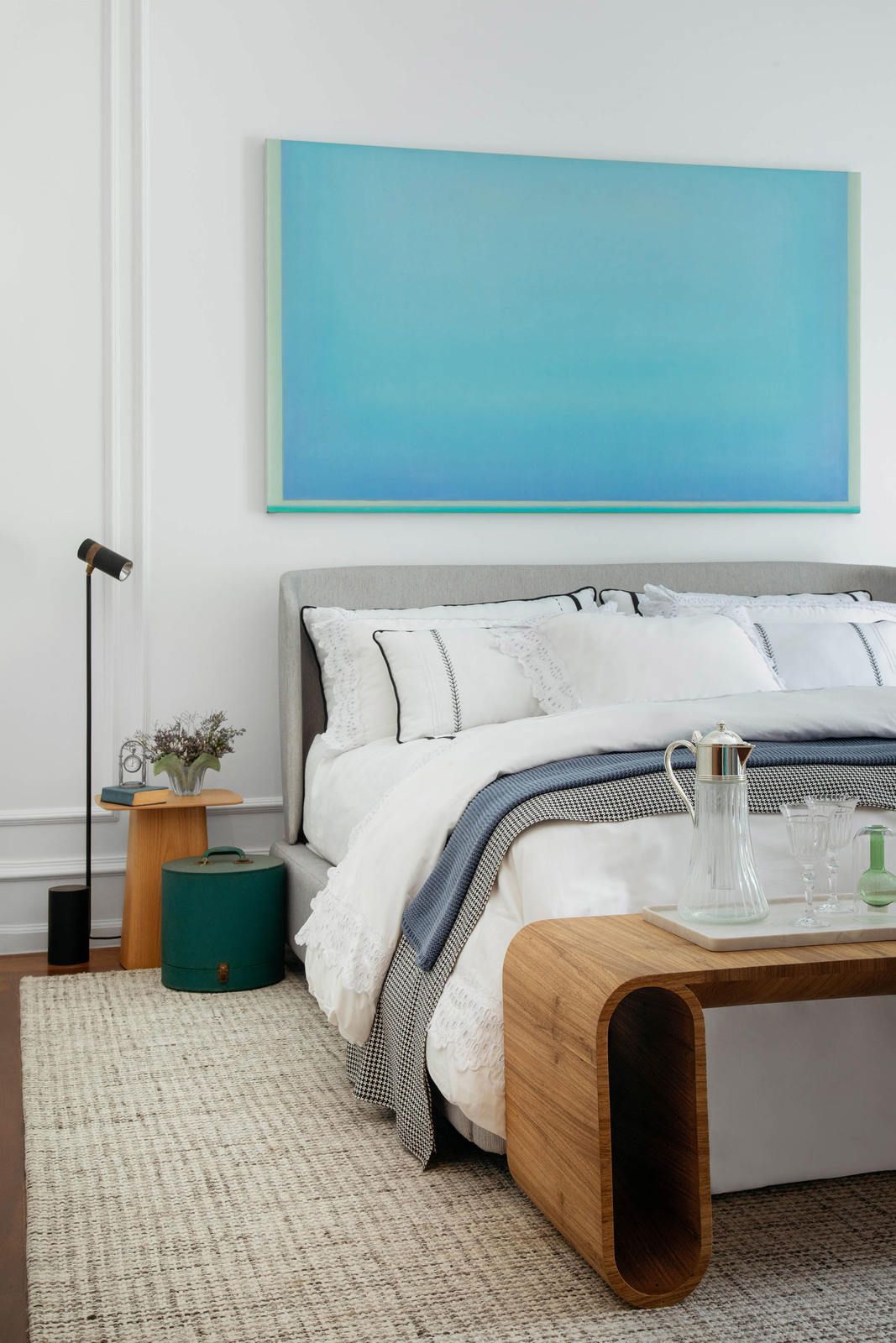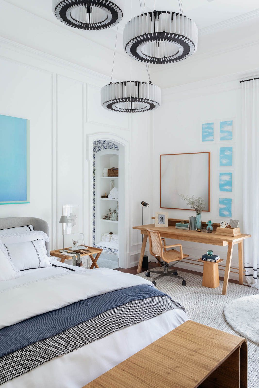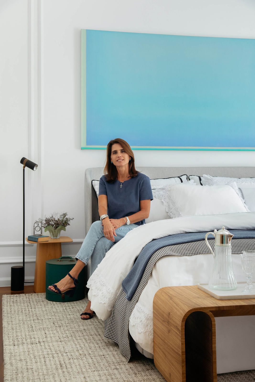 “A decoração do quarto segue uma paleta com base clara e neutra – do branco ao cinza, passando pelo off-white, pontuada por tons de azul extraídos dos azulejos (com destaque para o quadro do artista Sergio Lucena, acima da cama) e pitadas de verde fresh, presente nas obras de arte, livros encapados com tecido e objetos de decoração. Outro destaque do quarto é a TV que exibe uma obra de arte digital quando desligada, tornando-se assim parte integrante do décor. Por fim, arranjos de flores diversos, da lavanda ao alecrim, exalam um perfume único no ambiente, aumentando a sensação de bem-estar e relaxamento tão fundamentais em quartos de dormir.”