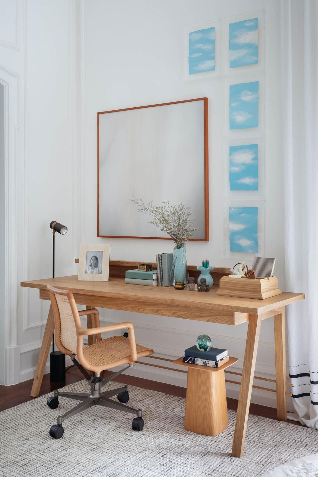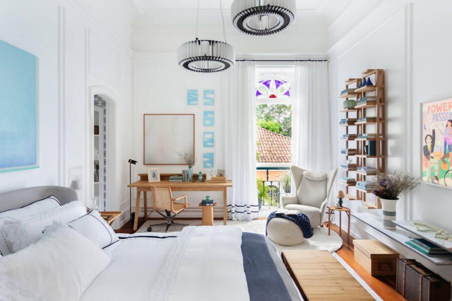 “A suíte tira partido da arquitetura original da casa principal (erguida em 1860) para propor um décor contemporâneo com um ‘pé no passado’, recheado de móveis brasileiros de design assinado e obras de arte de artistas nacionais que estão em evidência na atualidade. Como o espaço é tombado, entramos no clima do estilo clássico europeu existente, tão elegante e atemporal, acrescentando boiseries nas paredes e sancas no teto e trazendo esses elementos ricos em detalhes para os dias de hoje, criando um espaço claro, leve e, acima de tudo, extremamente acolhedor.”
