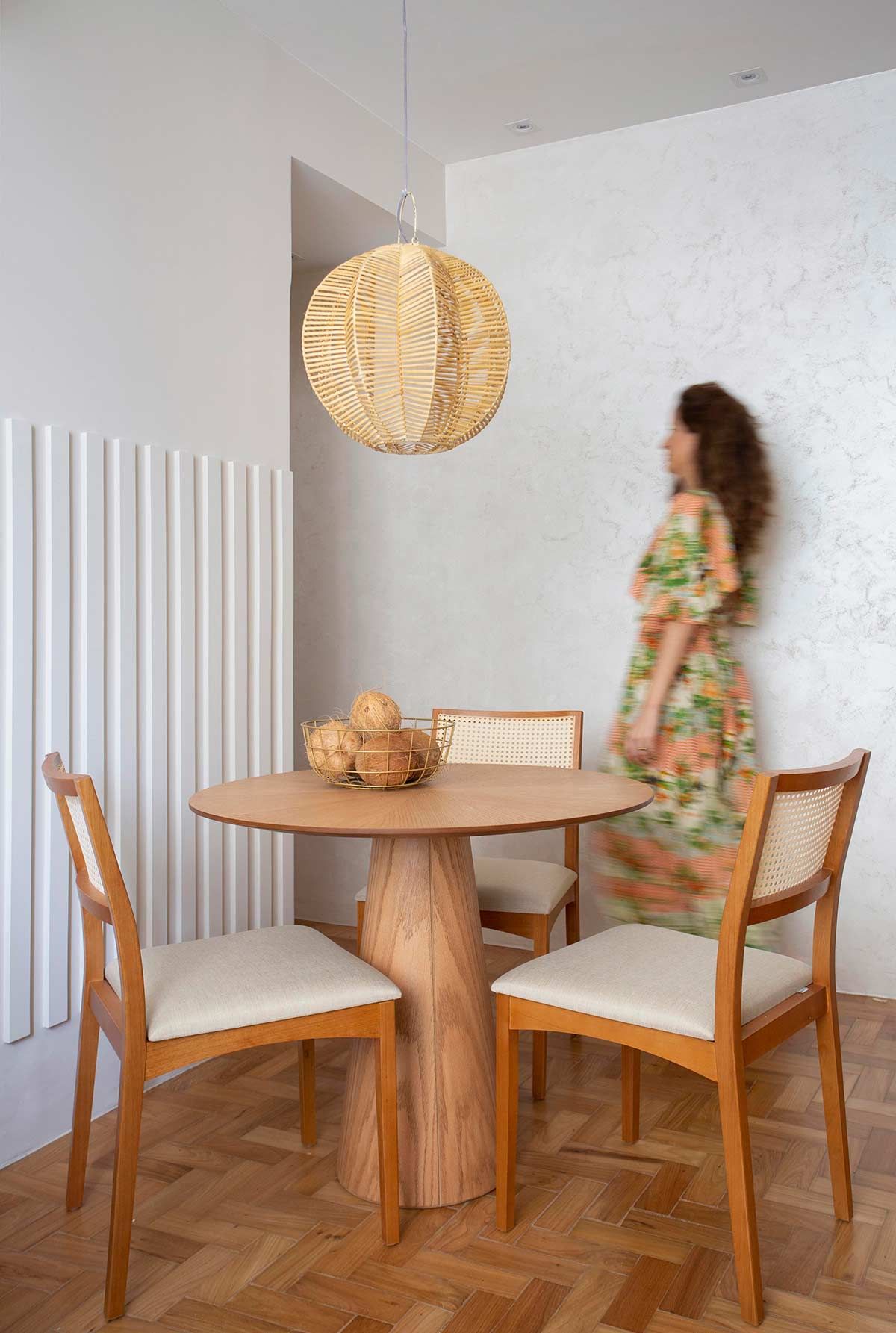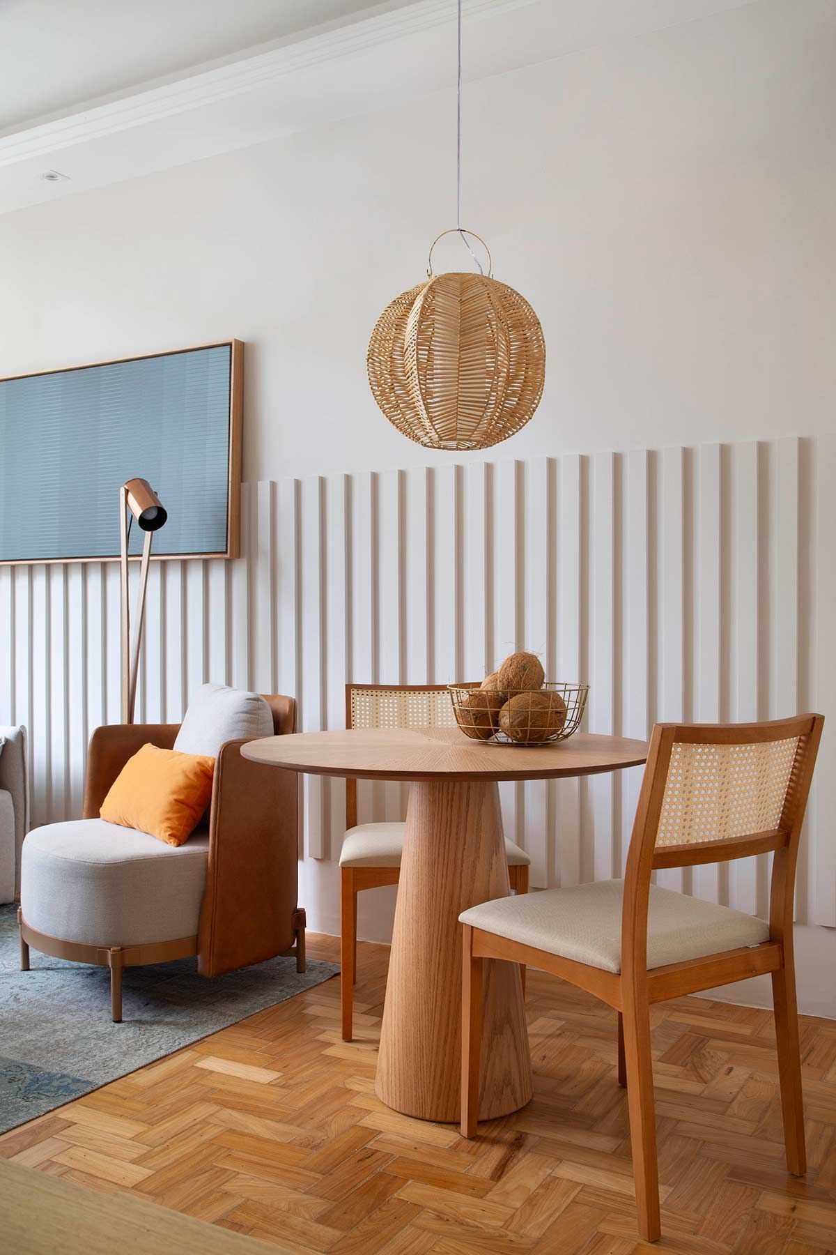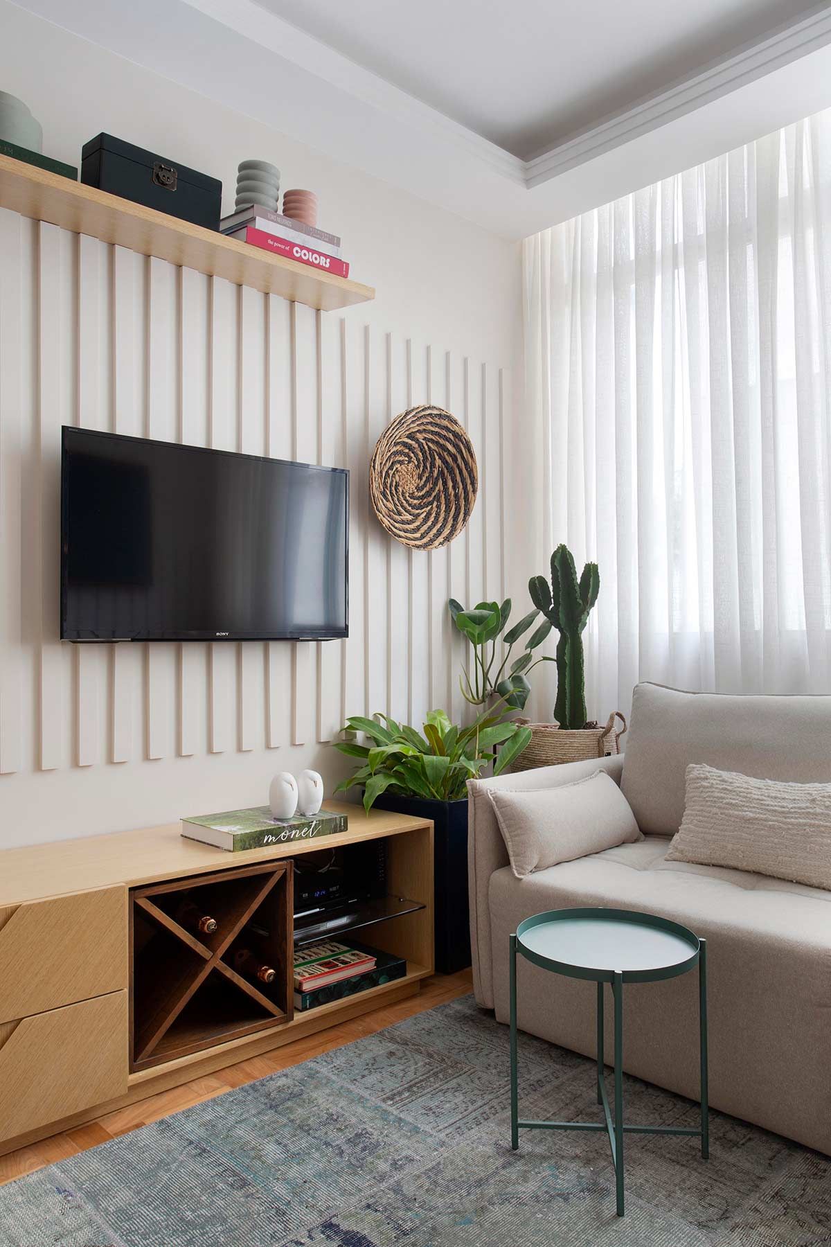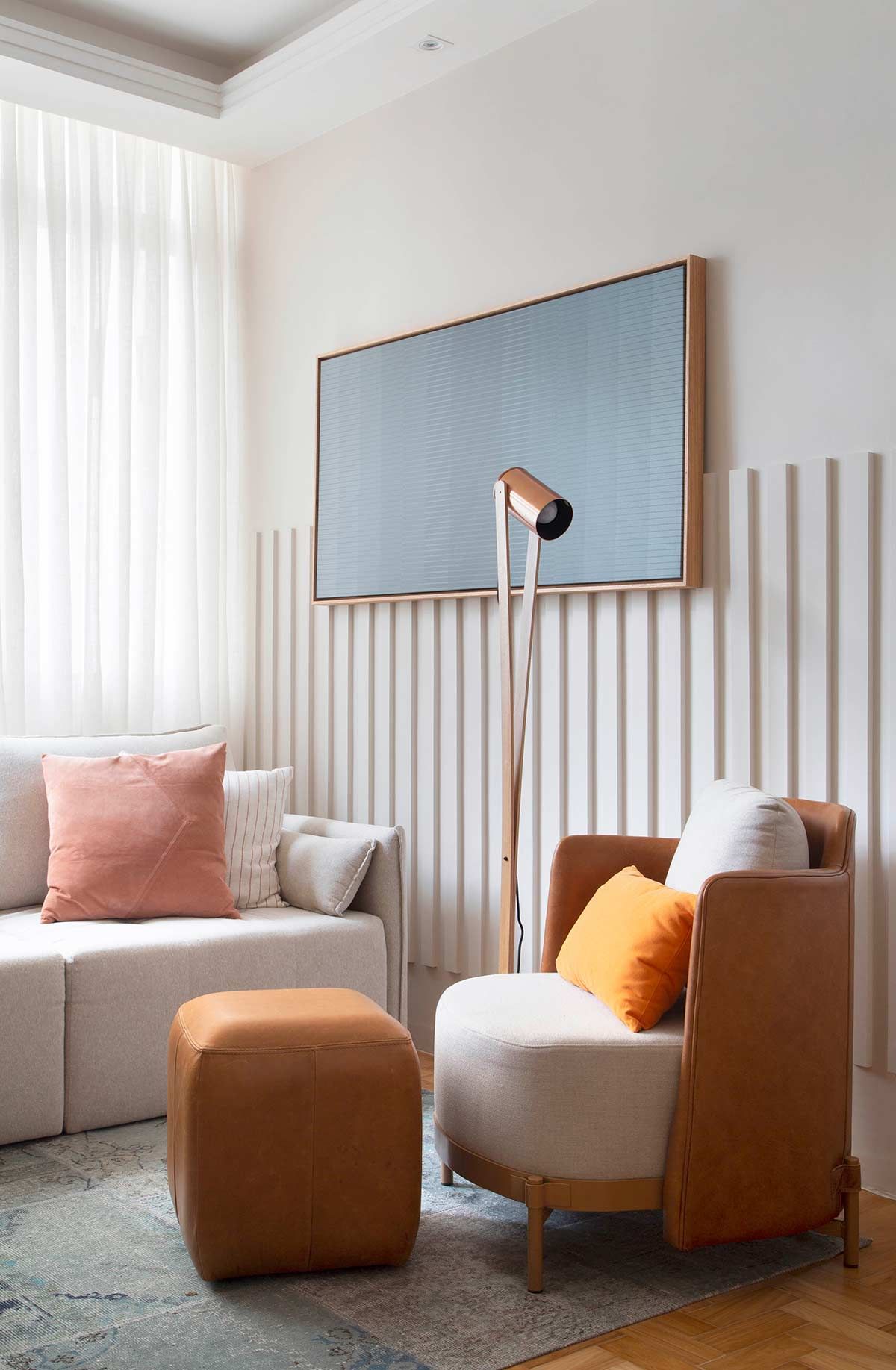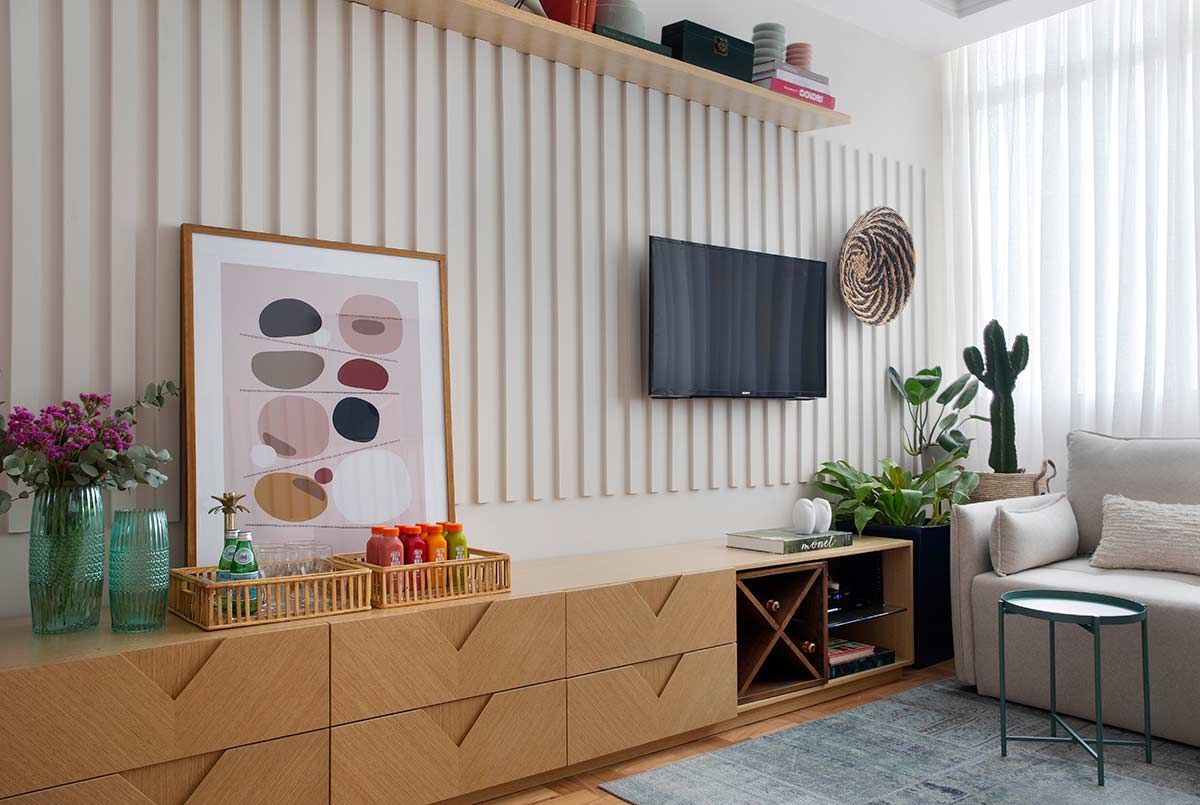 O volume que veste as salas foi feito com restos de MDF cortados em réguas, colados e pintados – um dos exemplos de soluções de baixo custo que aparecem nesse apê. Apesar de desafiador, transformar radicalmente essa casa de um jeito simples e econômico, foi bem divertido!
