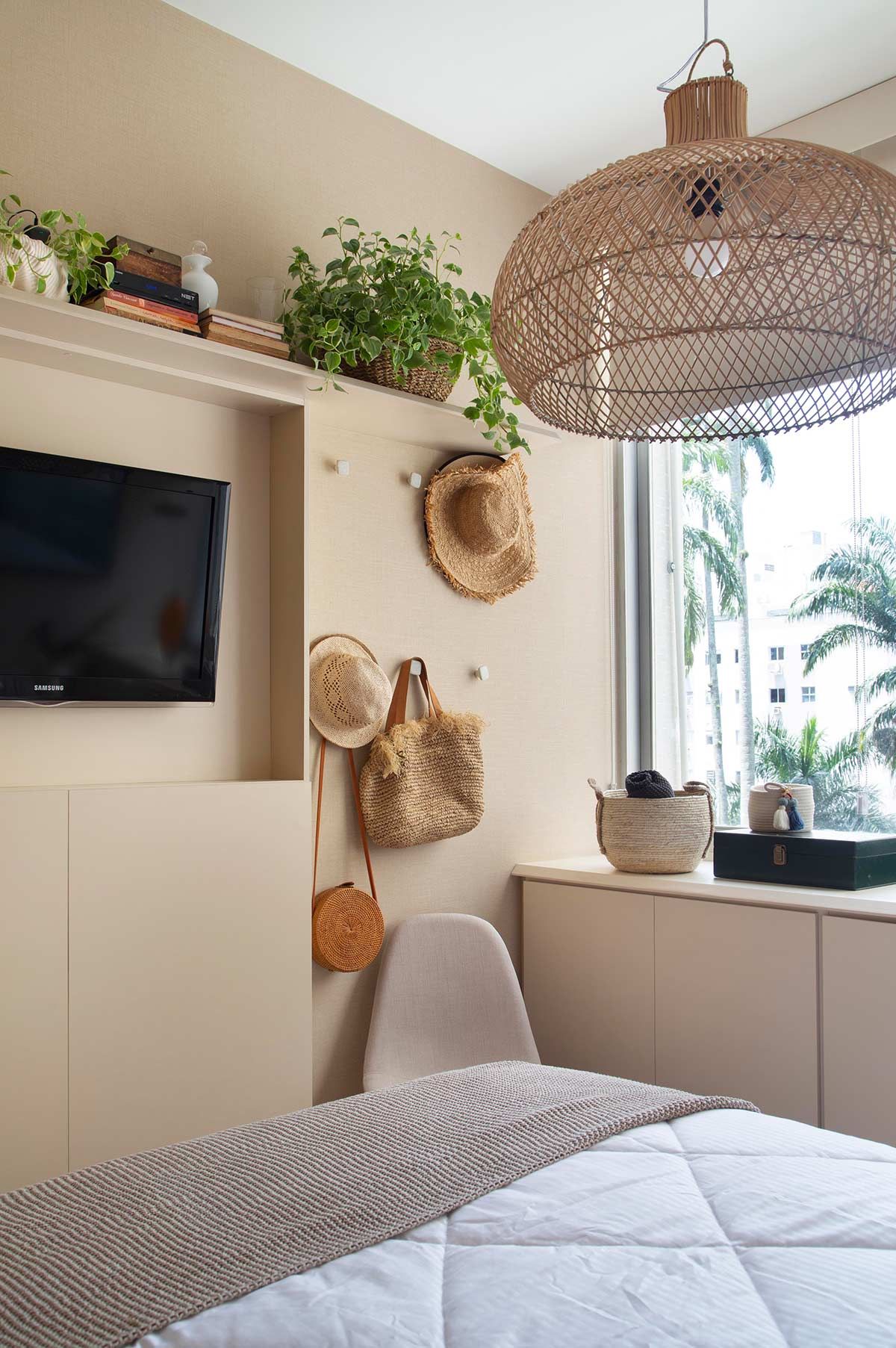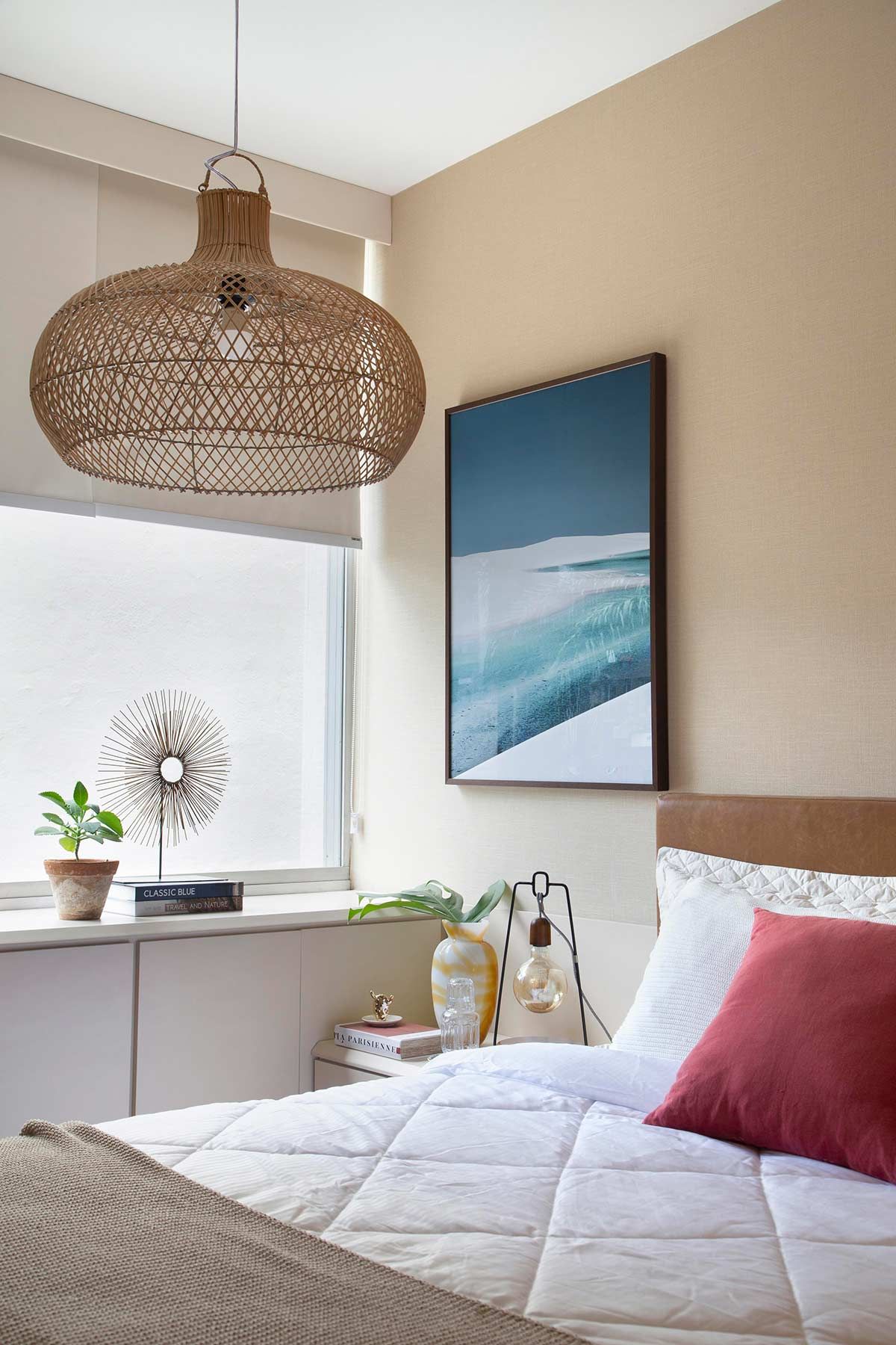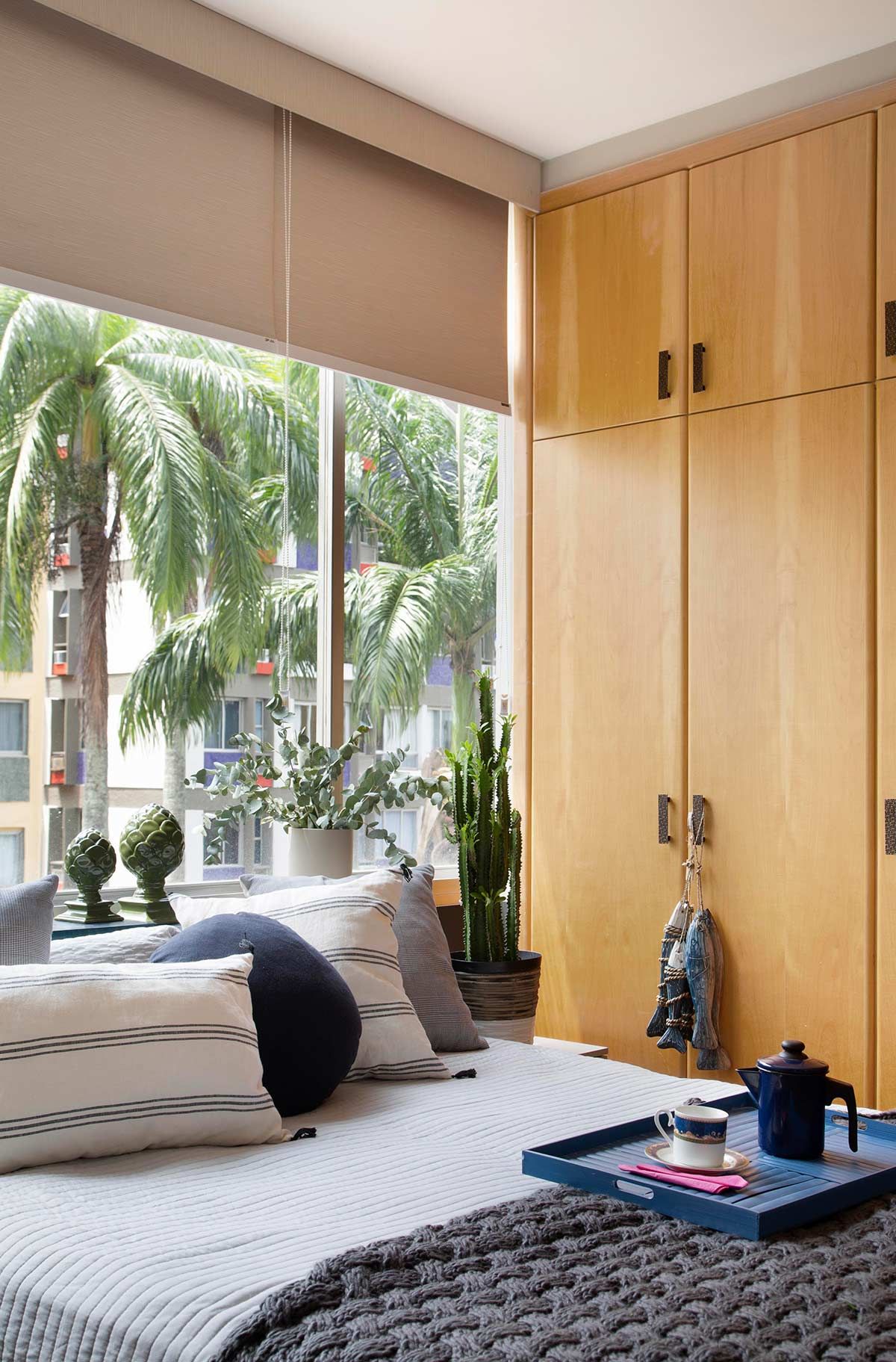 Já nos outros cômodos, as mudanças aconteceram em pontos estratégicos, através de objetos de décor e mobiliário garimpados em lojas em liquidação, além de pequenos aditivos de marcenaria. Na cozinha, as portas dos armários foram atualizadas e um novo revestimento sobrepôs o existente. Para resolver a questão do quarto de hóspedes, o antigo sofá-cama foi substituído por duas camas de solteiro, que podem virar uma de casal confortavelmente. Por fim, o dormitório da moradora conta agora com uma sapateira projetada em toda extensão da parede da janela; um armário mimetizado com o papel de parede; cabeceira estofada em couro ecológico; e uma decoração leve e acolhedora.