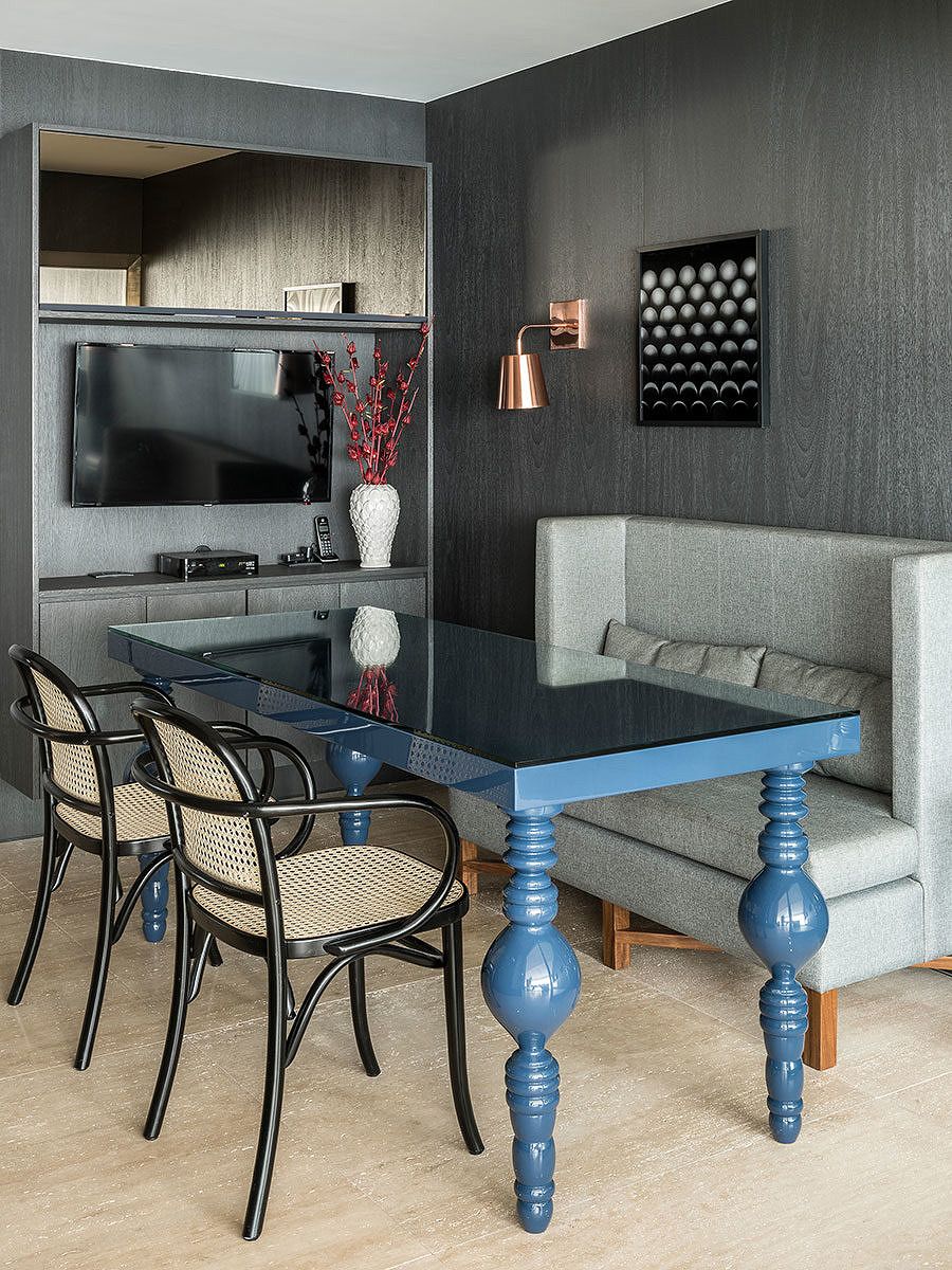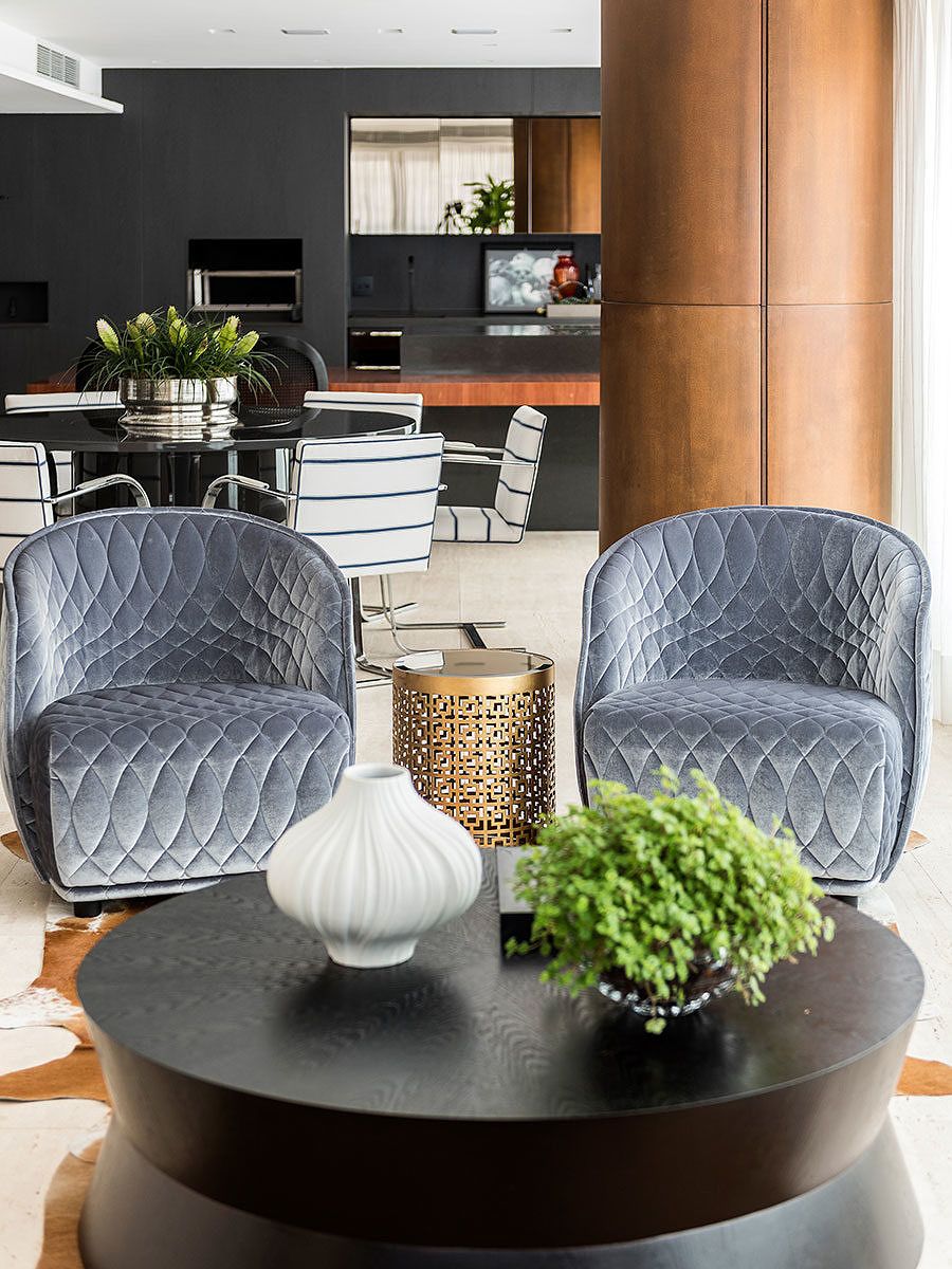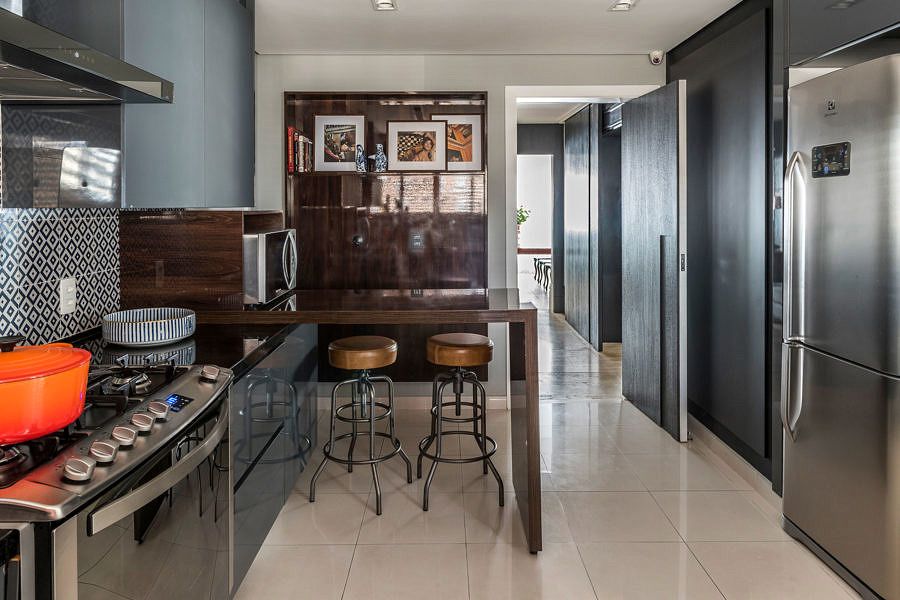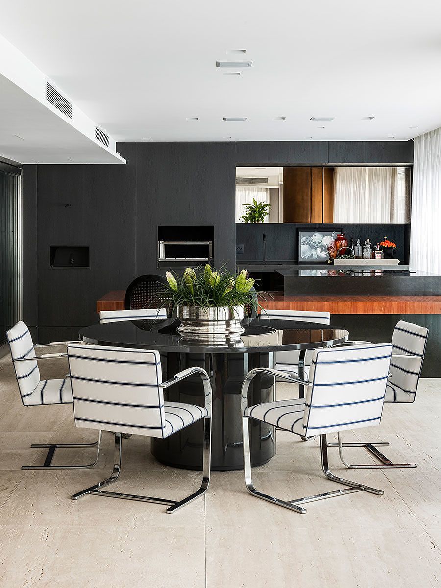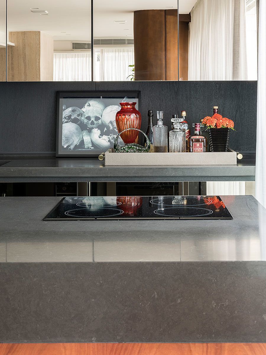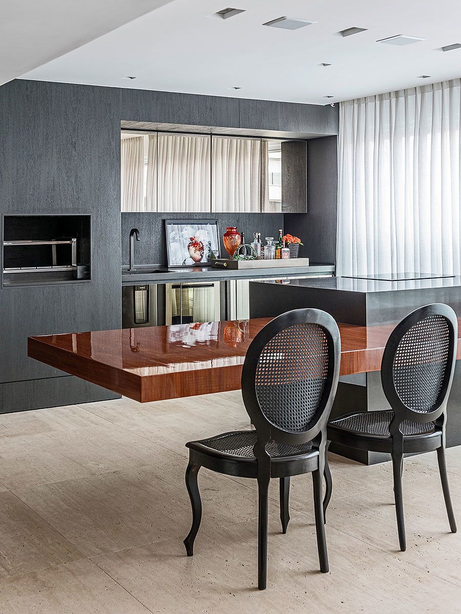 A integração da área gourmet com a parte social também foi providencial. Outra destaque é o uso de itens e materiais especiais, como a madeira poros abertos tingida de grafite que reveste a área gourmet, assim como uma mesa em balanço em madeira avermelhada no mesmo ambiente.