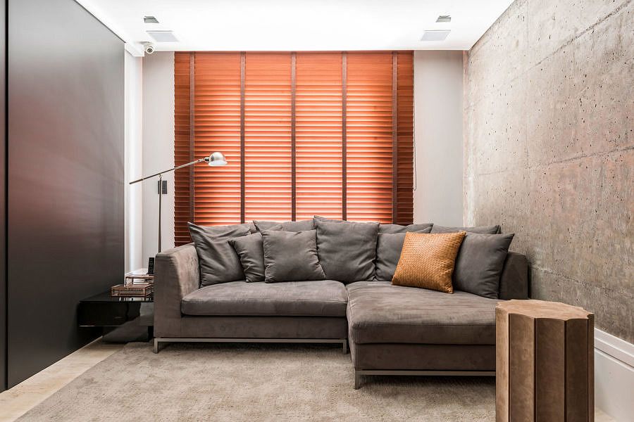 Outro ponto alto do projeto está na sala de TV, que uniu o concreto aparente com couro e portas em ripas de madeira grafite alto brilho.