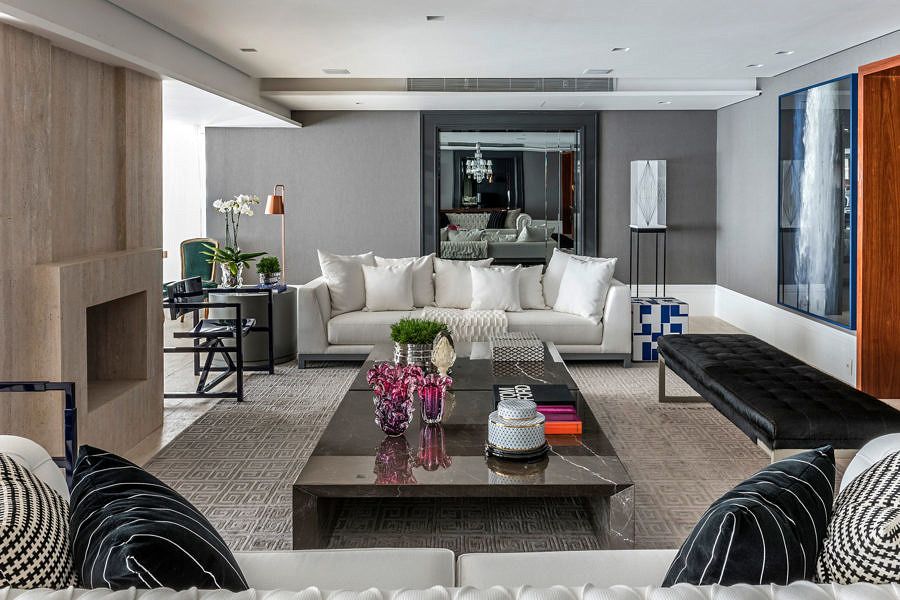 Um dos destaques do projeto é a integração, com unificação de ambientes, criando um grande living, que permite inclusive a existência proposital de “vazios”, que não somente trazem conforto, mas também sobriedade ao projeto.