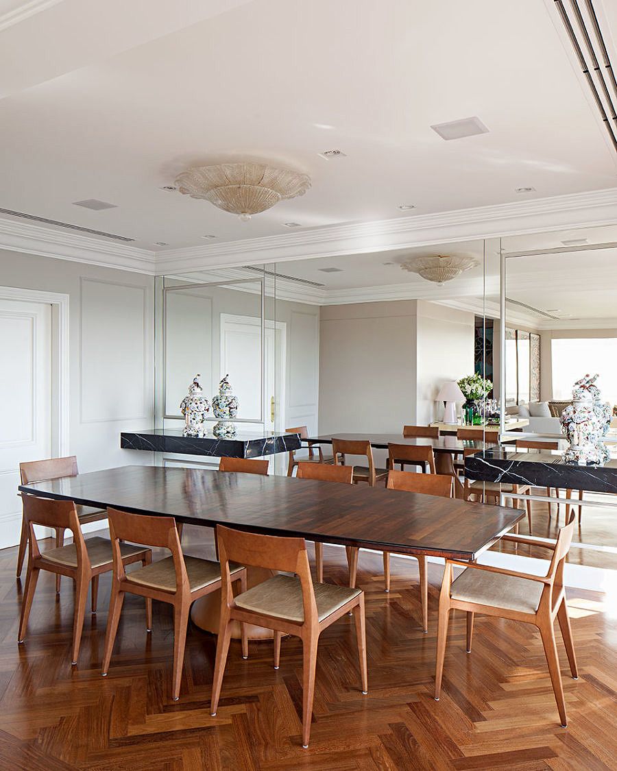 O casal pediu que o projeto tivesse poucas interferências arquitetônicas. Por isso, a profissional usou e abusou da criatividade na hora do décor, optando por revestimentos como espelhos, boisseries e papeis de parede.
