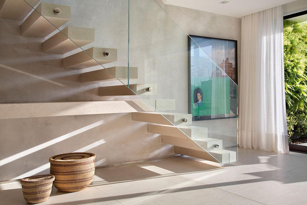 O projeto do apartamento de 380 m² era resolvido com apenas uma escada de acesso ao 2º pavimento, localizada na área íntima. O escritório aumentou a área útil coberta e descoberta, criando uma nova escada de cimento estrutural, exclusivamente para área social, mantendo a escada interna original junto aos quartos.