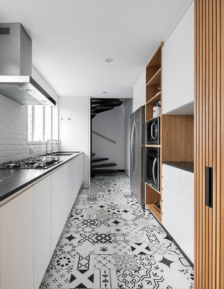 O primeiro andar é caracterizado pela predominância do branco e da madeira, com pequena presença do preto nas pedras e metais. O branco favorece a distribuição da iluminação e a madeira traz o aconchego necessário, criando uma atmosfera leve e agradável, muito similar ao estilo escandinavo.