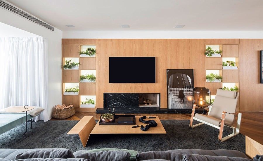 Integradas ao painel de carvalho, essas estantes removíveis com nichos fechados por vidros leitosos, permitem a entrada de luz natural e possibilita a inclusão de mais verde no interior do apartamento.