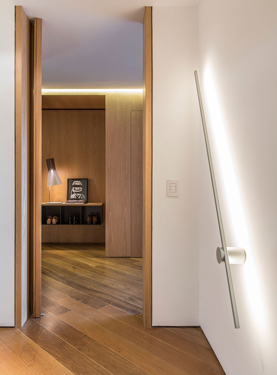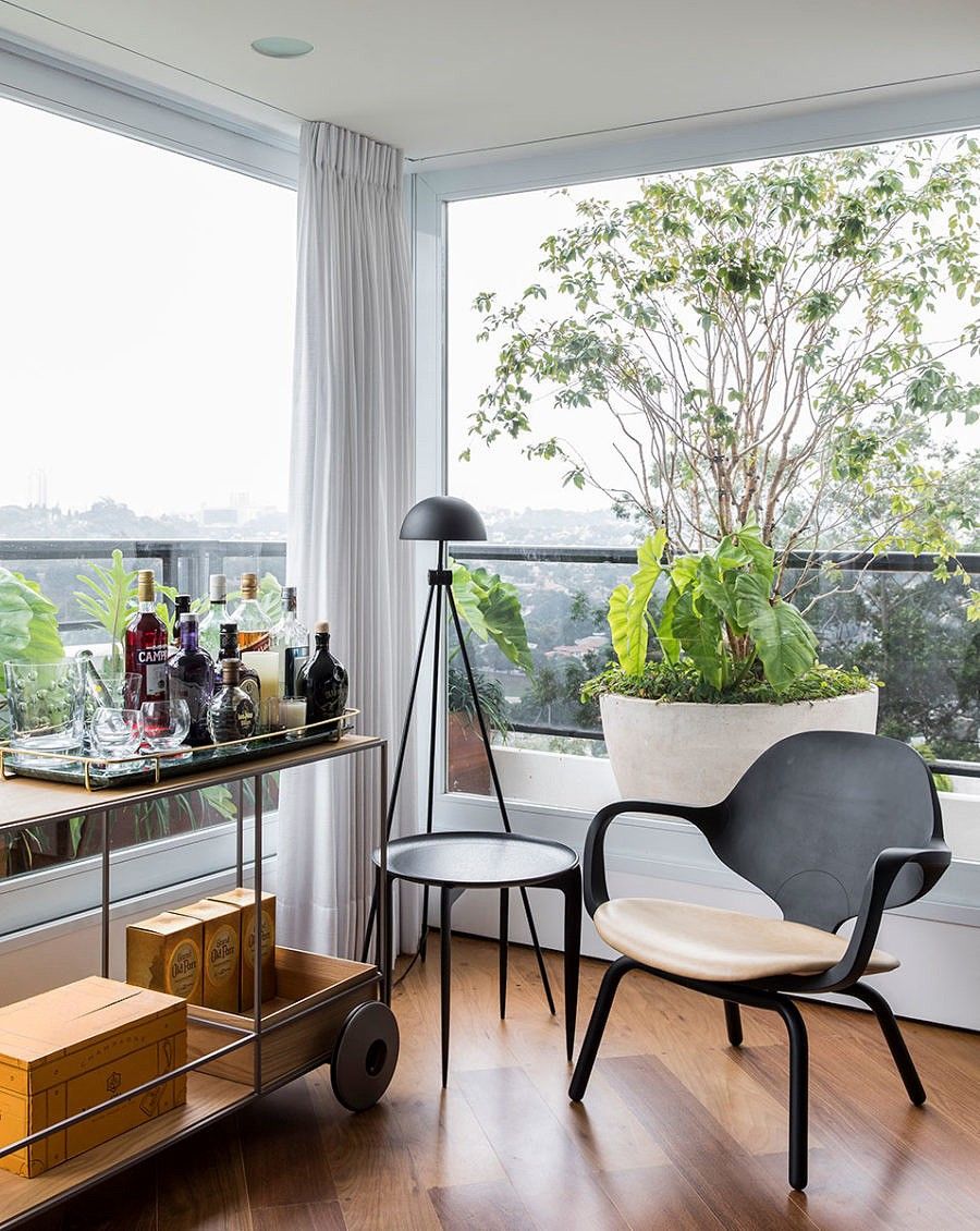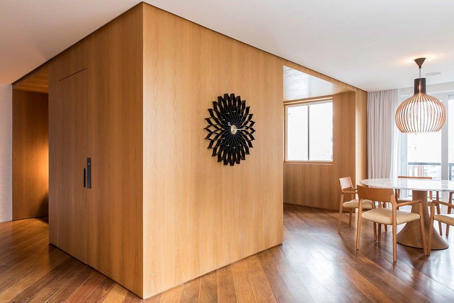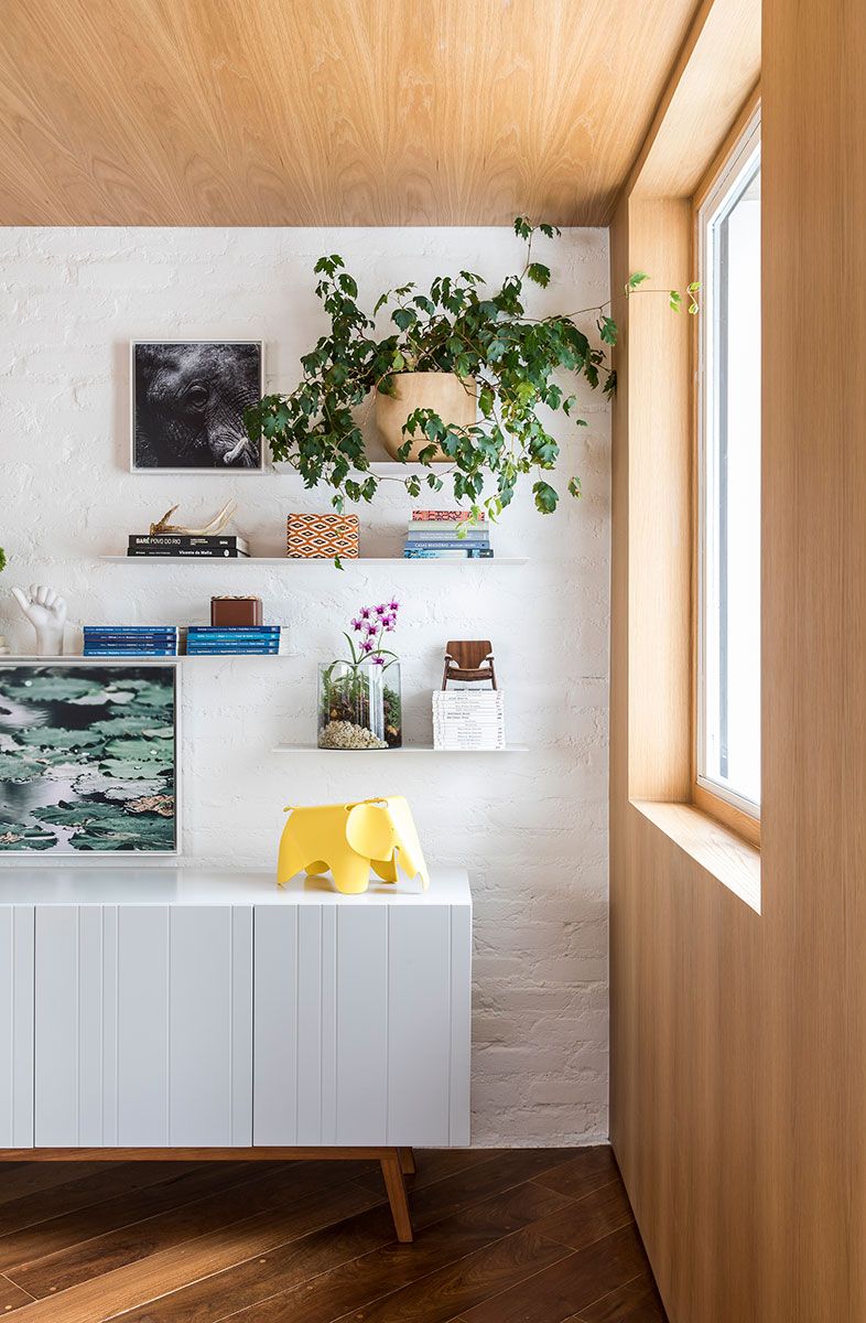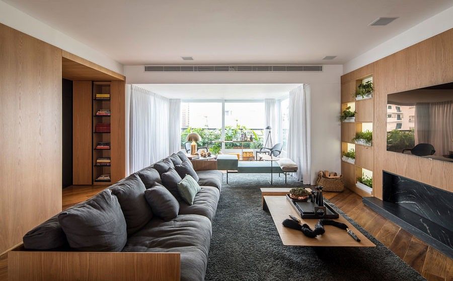 Integradas ao painel de carvalho, essas estantes removíveis com nichos fechados por vidros leitosos, permitem a entrada de luz natural e possibilita a inclusão de mais verde no interior do apartamento.