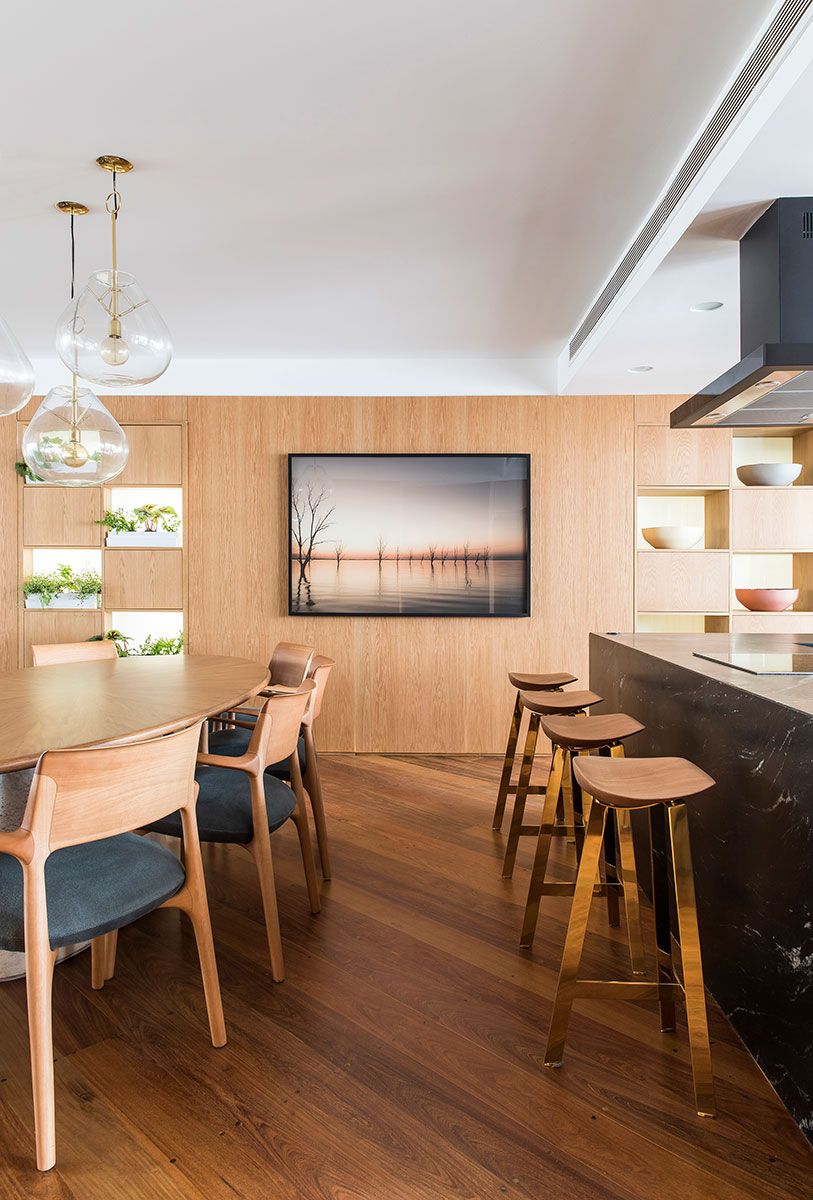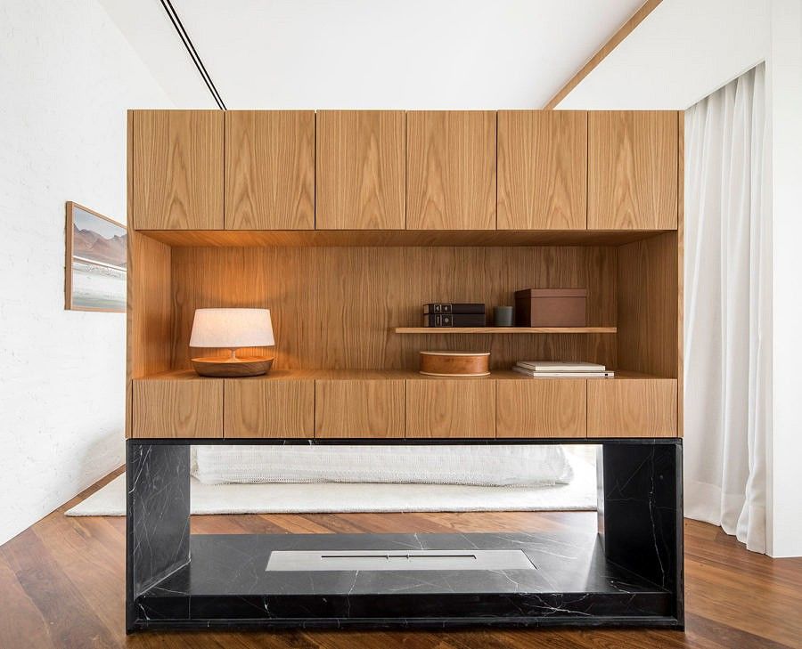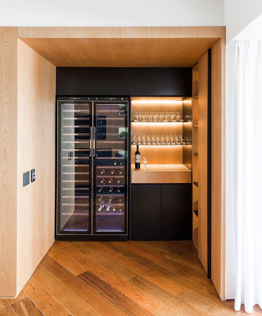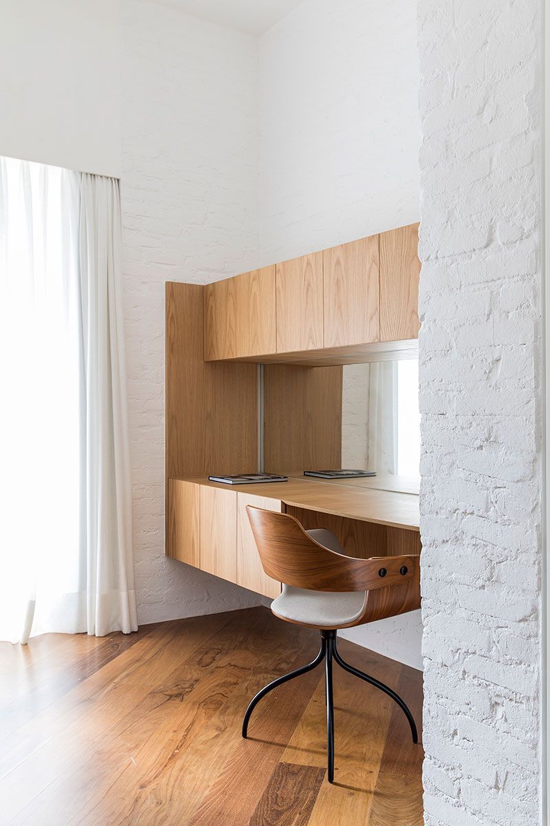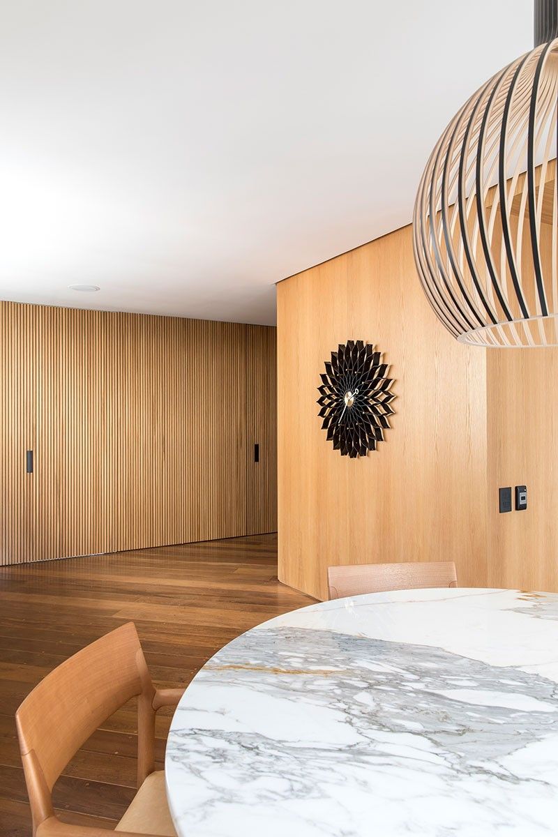 Integradas ao painel de carvalho, essas estantes removíveis com nichos fechados por vidros leitosos, permitem a entrada de luz natural e possibilita a inclusão de mais verde no interior do apartamento.
