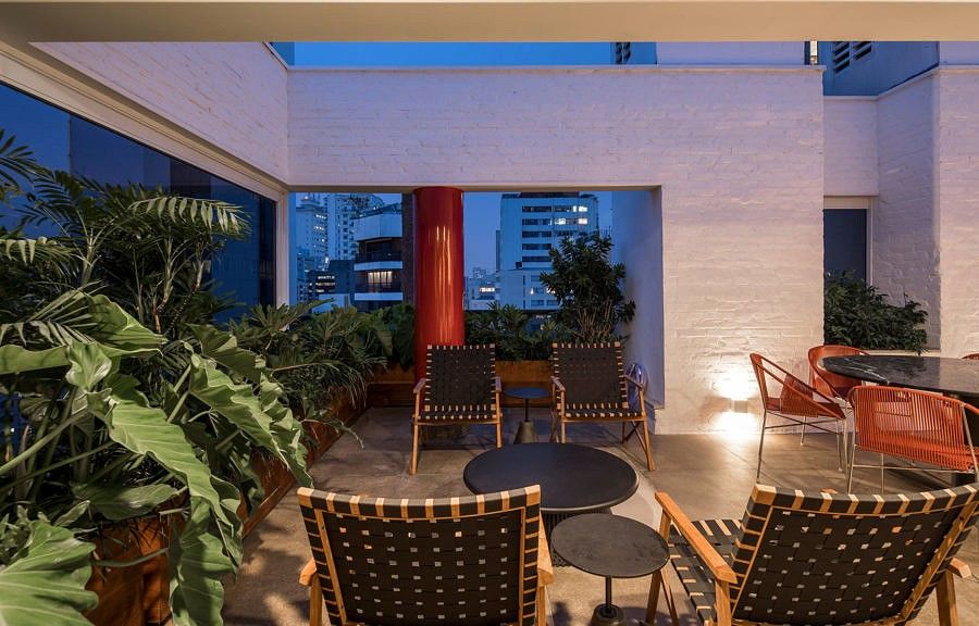 Tijolos brancos, concreto, madeira, pedras e vegetação, ambientam o terraço gourmet, gerando a sensação de se viver em uma casa. A decoração busca valorizar o design nacional, trazendo uma grande quantidade de peças desenhadas por profissionais brasileiros.