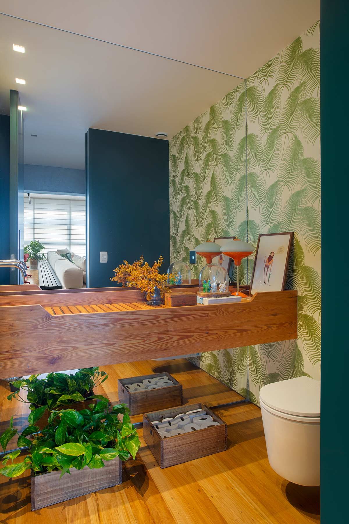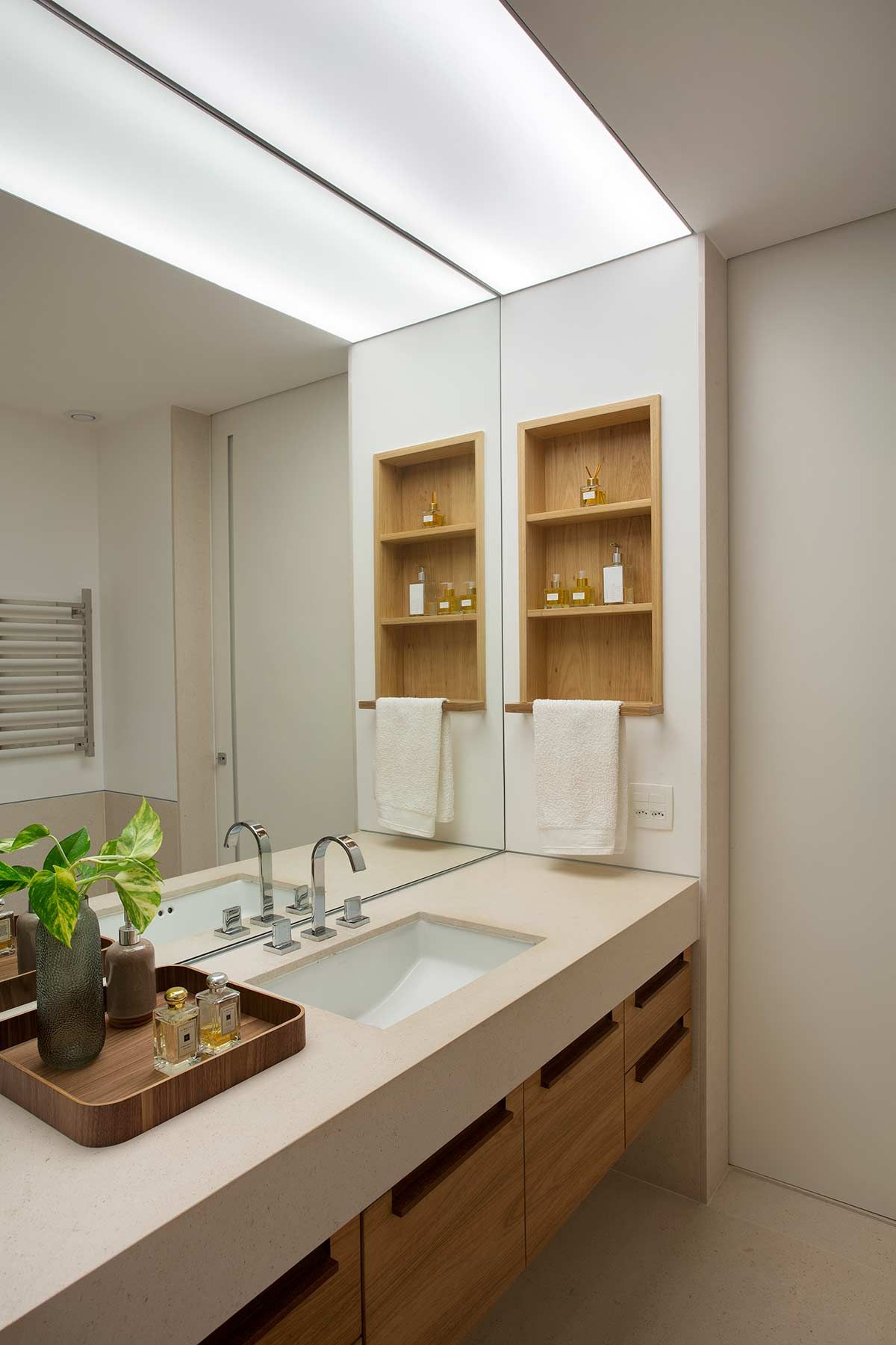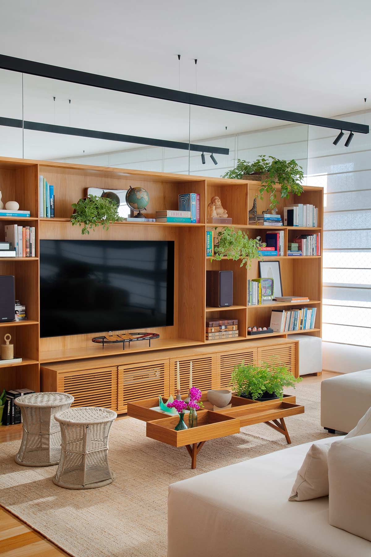 A descoberta da estrutura foi desafiadora também na cozinha gourmet e suíte do casal, que tiveram de ser repensadas por conta de vigas e pilares. Como a configuração de toda a sala é retangular, os móveis cumpriram o papel de segmentar os espaços, ao passo que a estante de marcenaria em L envolveu a área da TV, dando a sensação que um ambiente está dentro do outro. O décor traz cores em pontos estratégicos, assim como os espelhos, que foram instalados com a finalidade de trazer a paisagem para dentro do apê e agregar amplitude.