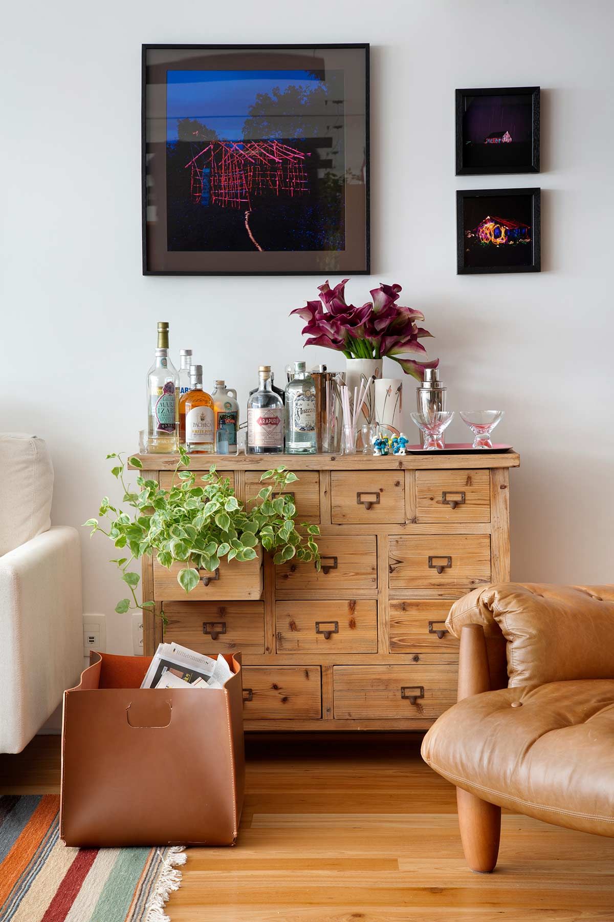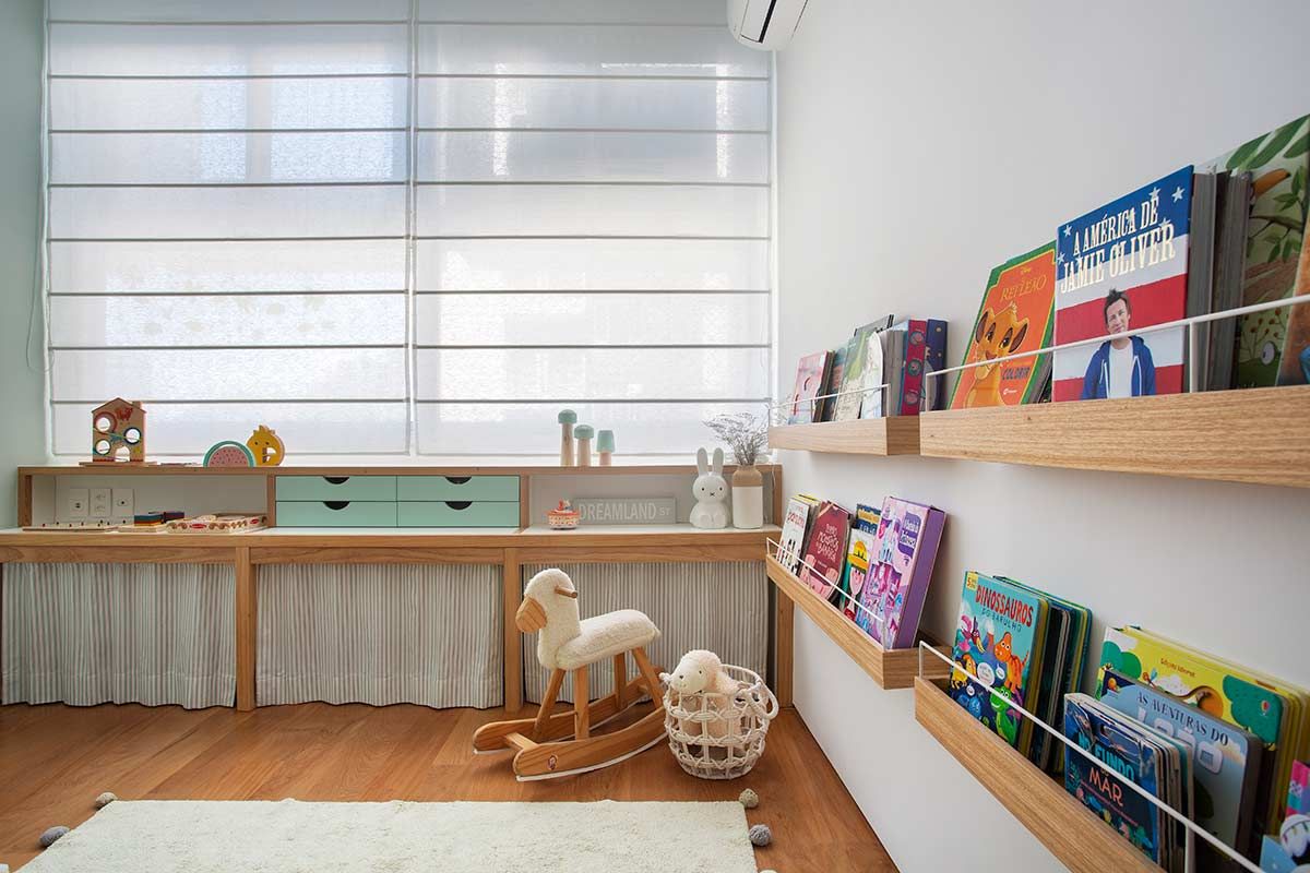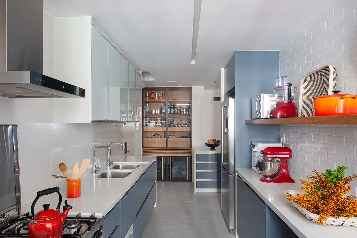 A descoberta da estrutura foi desafiadora também na cozinha gourmet e suíte do casal, que tiveram de ser repensadas por conta de vigas e pilares. Como a configuração de toda a sala é retangular, os móveis cumpriram o papel de segmentar os espaços, ao passo que a estante de marcenaria em L envolveu a área da TV, dando a sensação que um ambiente está dentro do outro. O décor traz cores em pontos estratégicos, assim como os espelhos, que foram instalados com a finalidade de trazer a paisagem para dentro do apê e agregar amplitude.