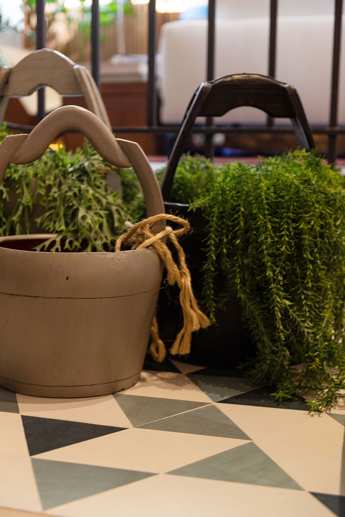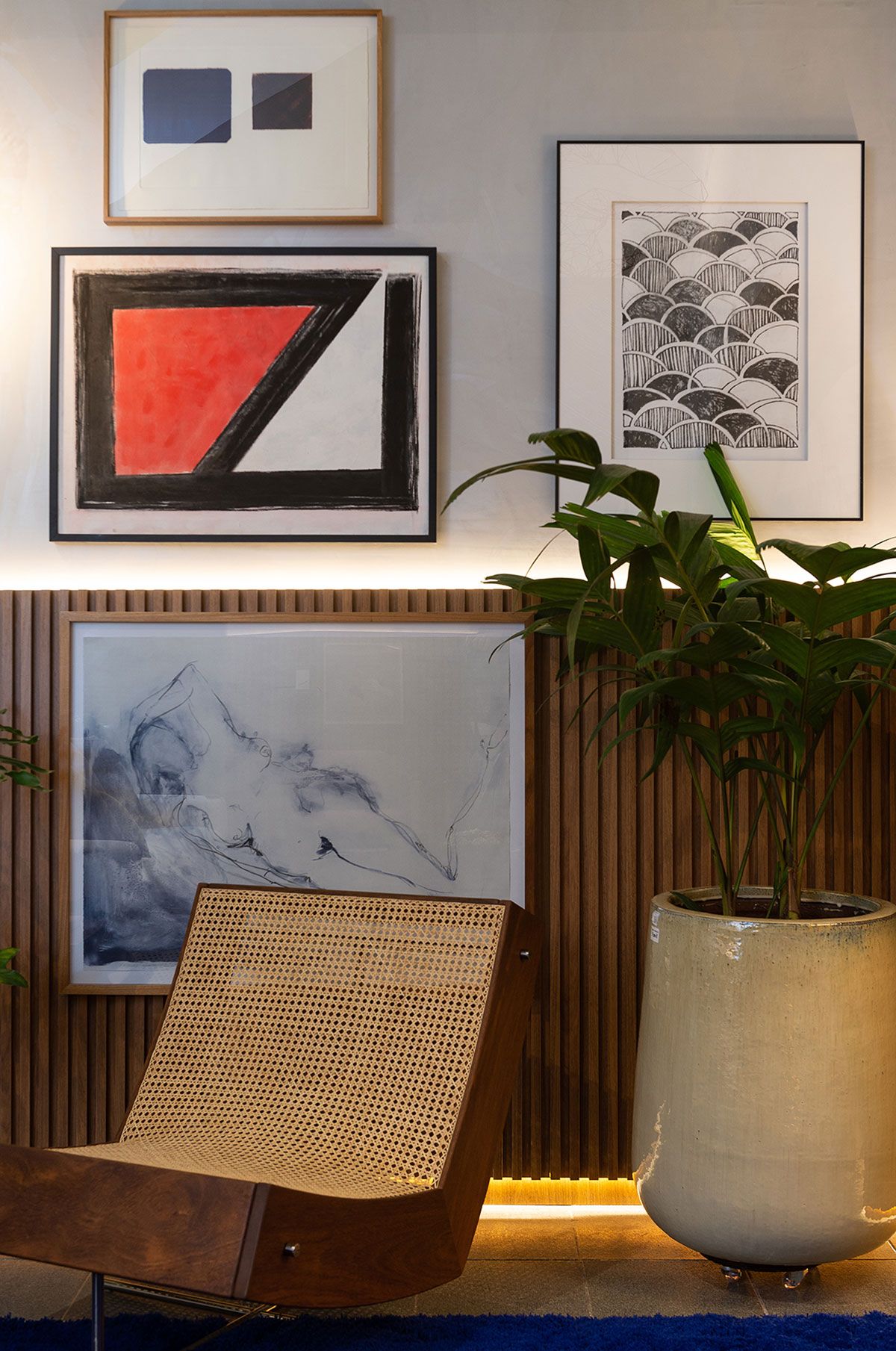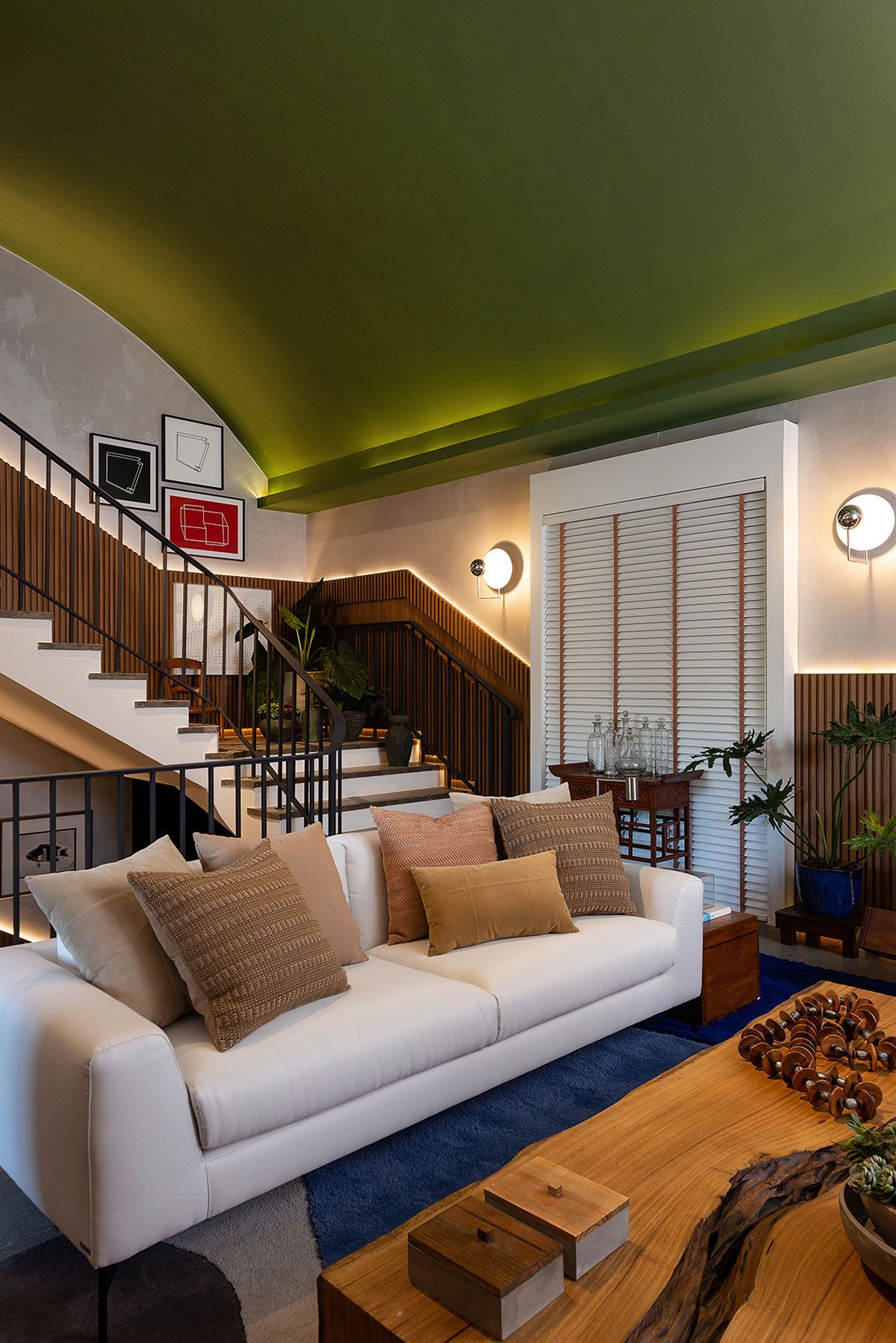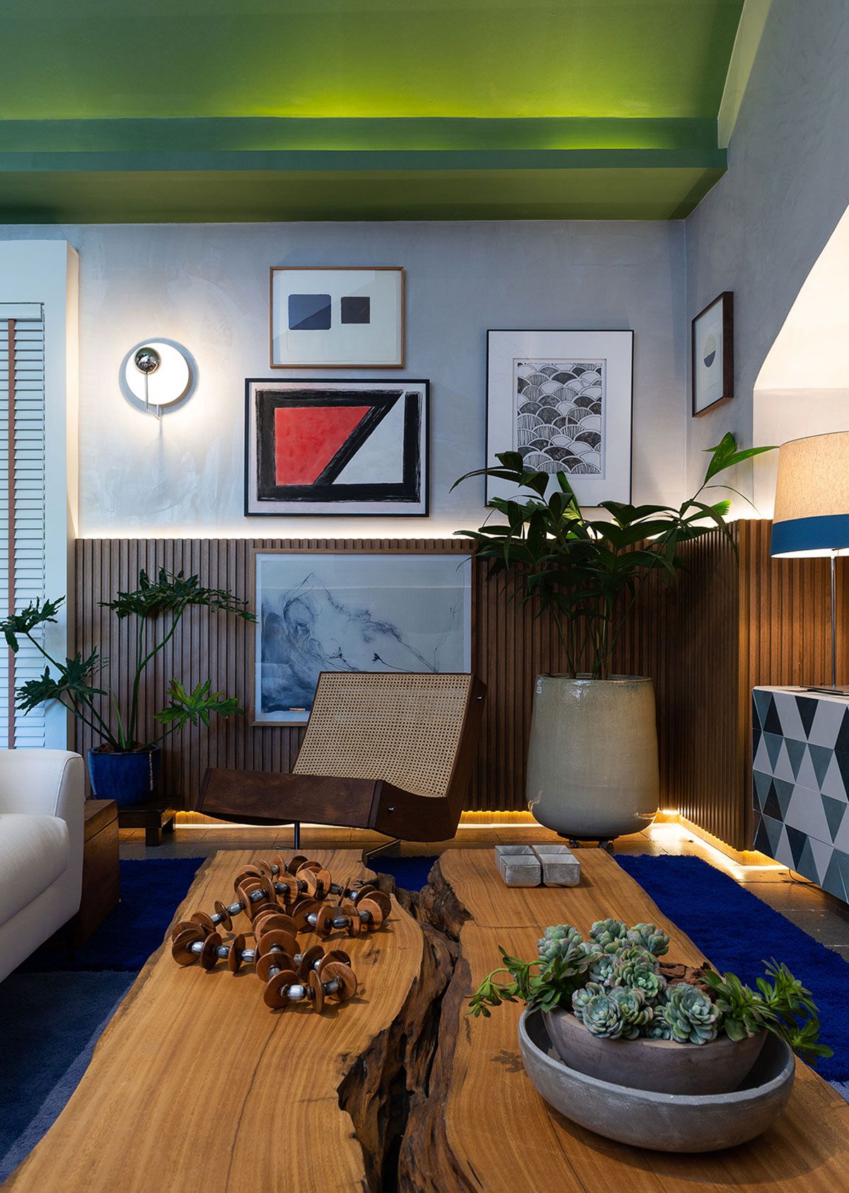 O ambiente também ganhou muita brasilidade, que se mostra através dos elementos naturais como madeira, palhinha, couro, muito verde, azul e branco. Para a pintura do espaço, os profissionais trabalharam com dois efeitos: Nuage aplicado no teto e na parede Velvet.