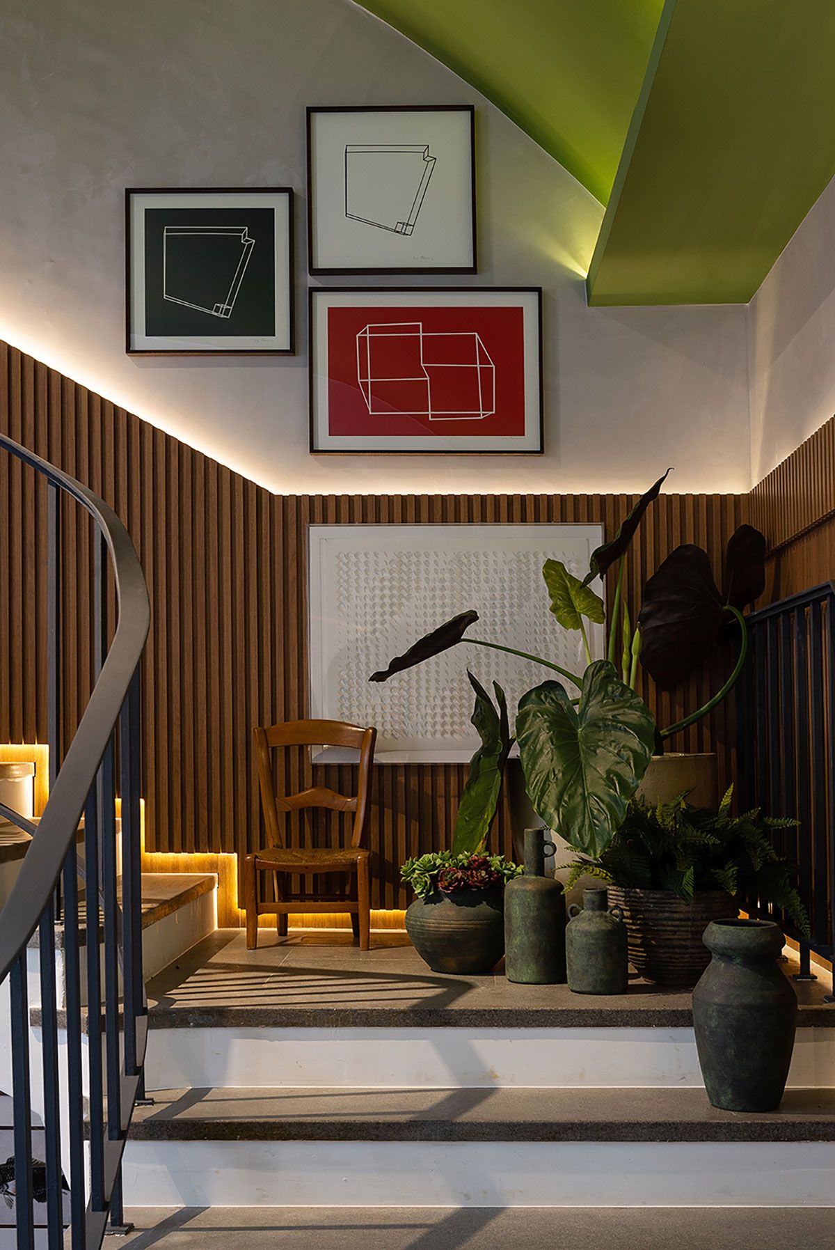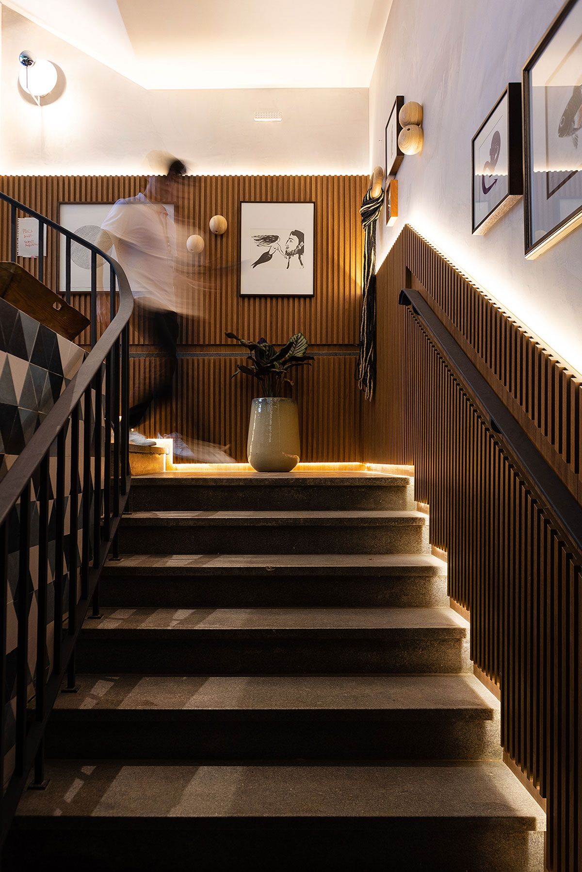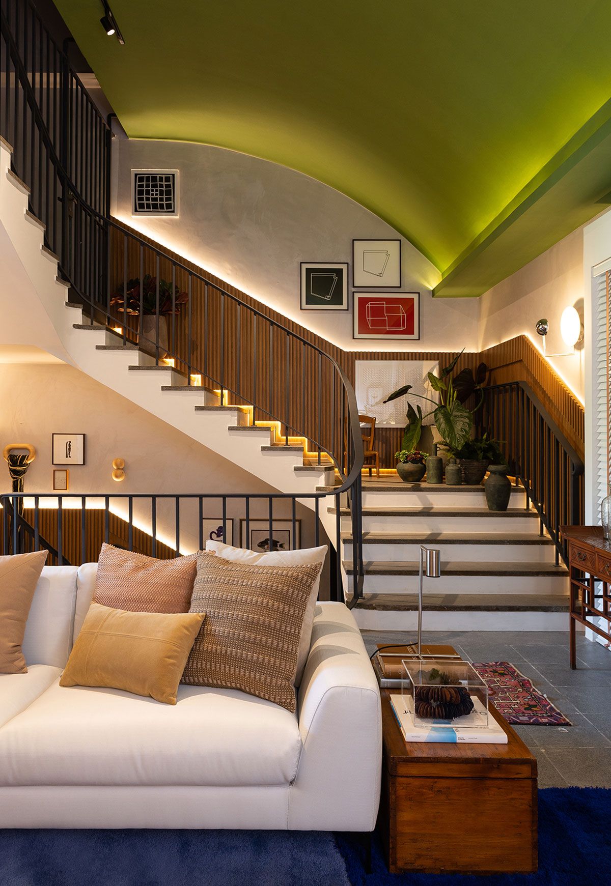 A escada e o piso original foram restaurados, respeitando as normas especificadas pelos órgãos de proteção ao patrimônio histórico. Já a parte luminotécnica foi desenvolvida com iluminação de LED para gerar economia de energia e dar um toque leve e intimista ao local.