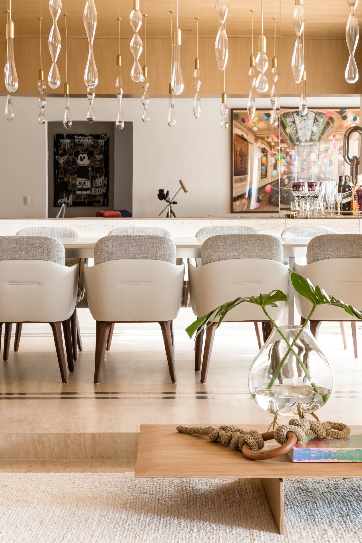 E veja as lâmpadas que pendem do teto na sala de jantar!