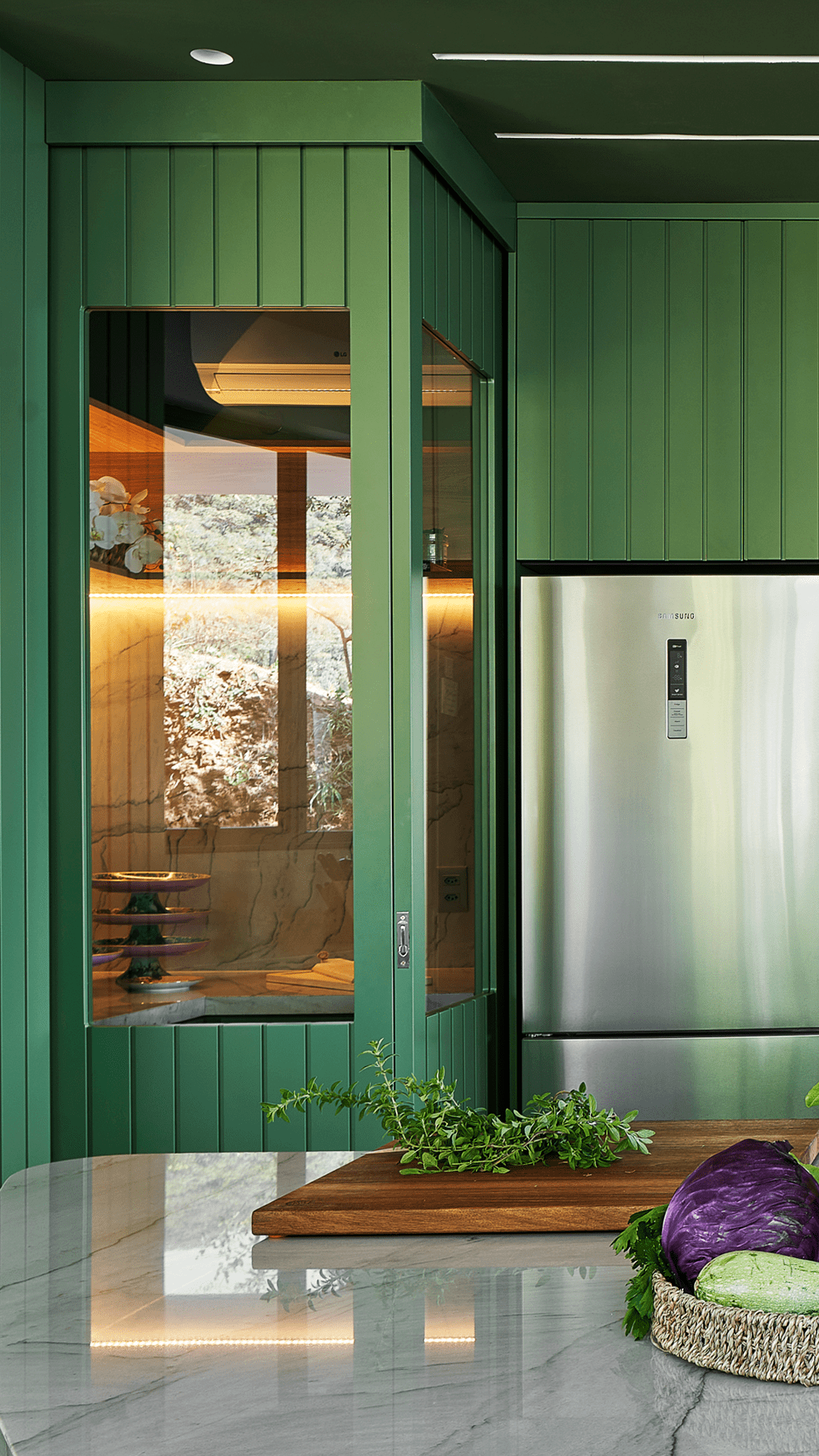 Uma cozinha verde de 42m² e com todos os aparatos necessários para uma chef de cozinha.