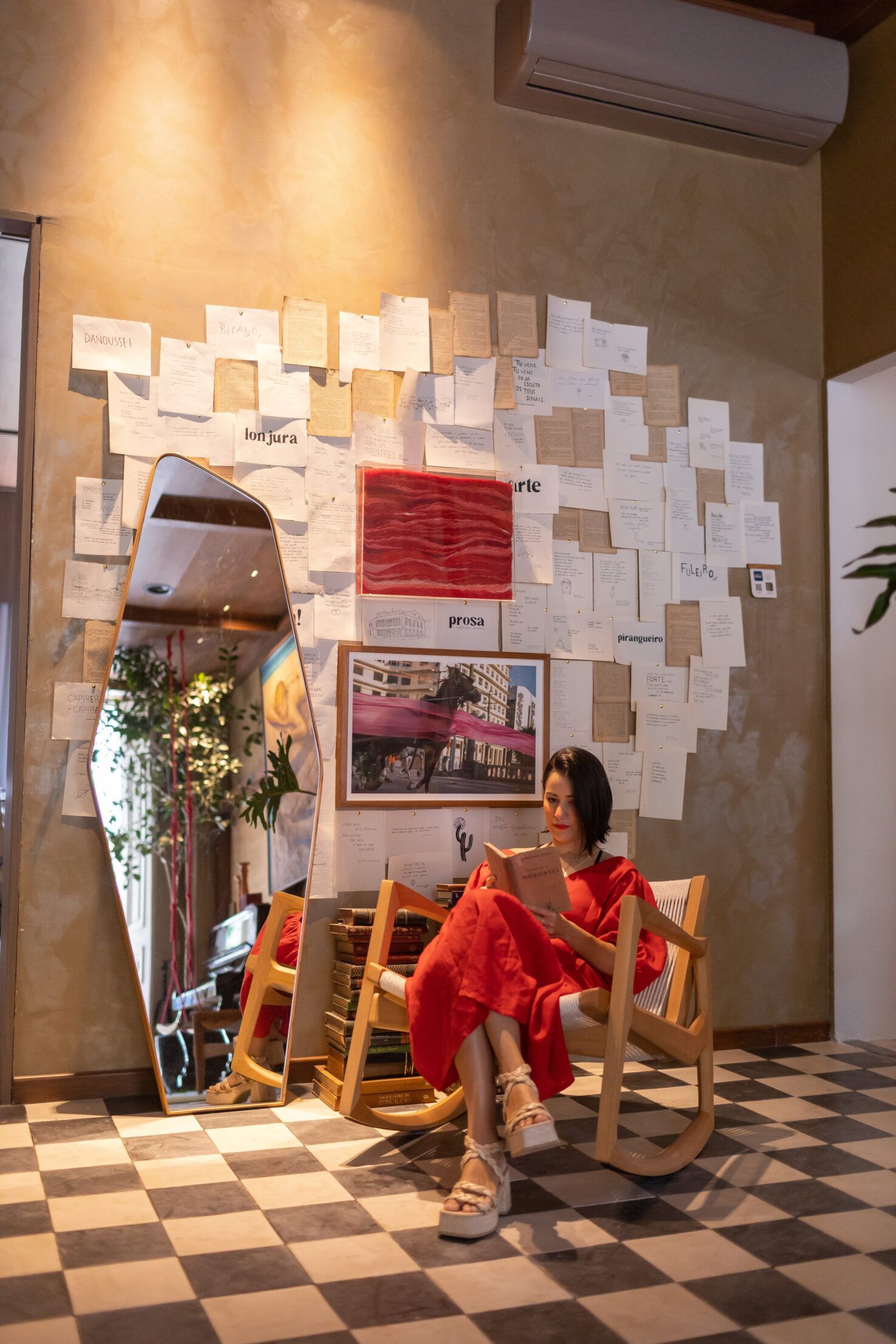 o piso em xadrez preto e branco remete às pistas de dança do edifício e os quadrados de madeira e cortiça resgatam as casas de taipa da região.